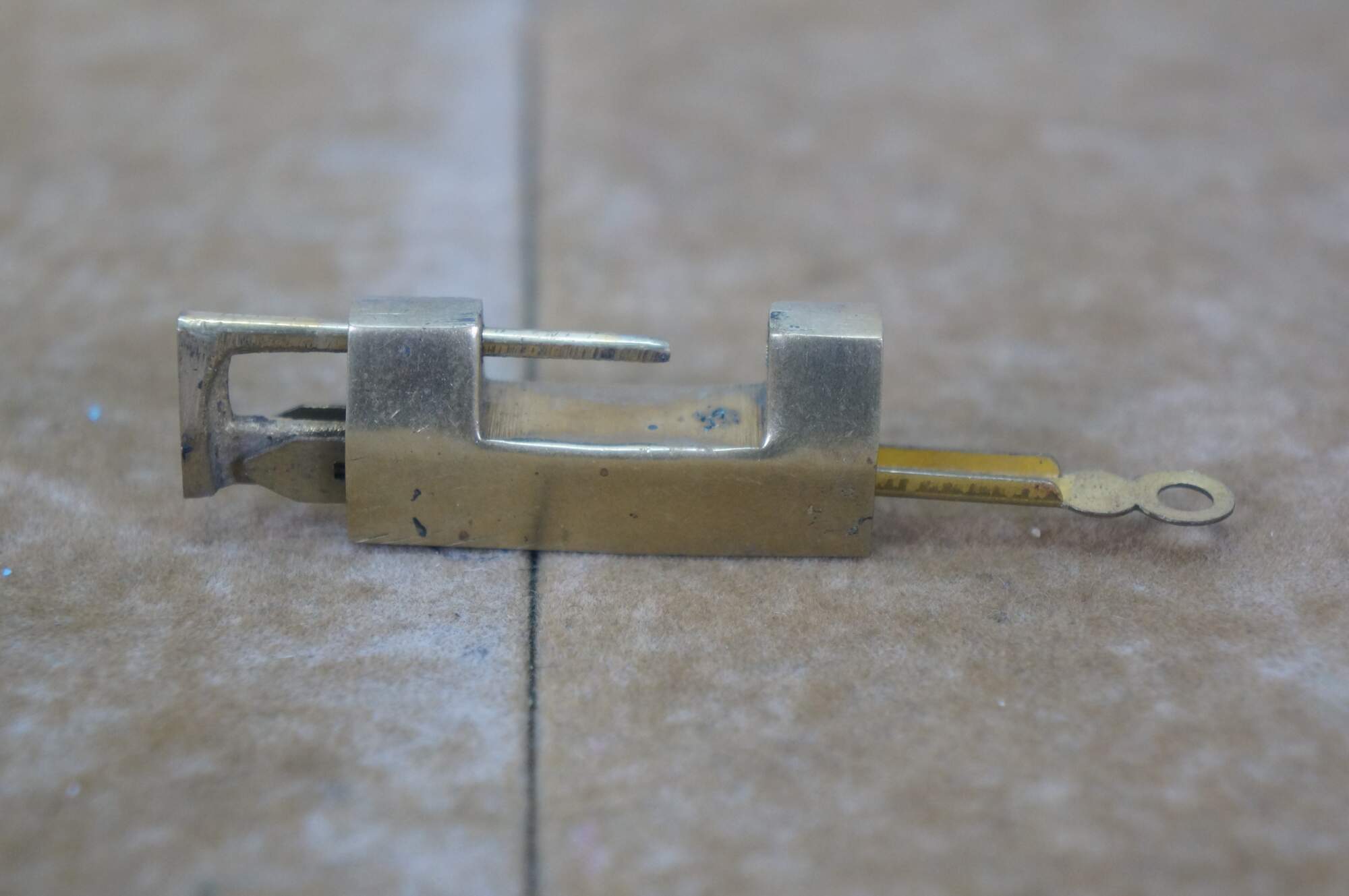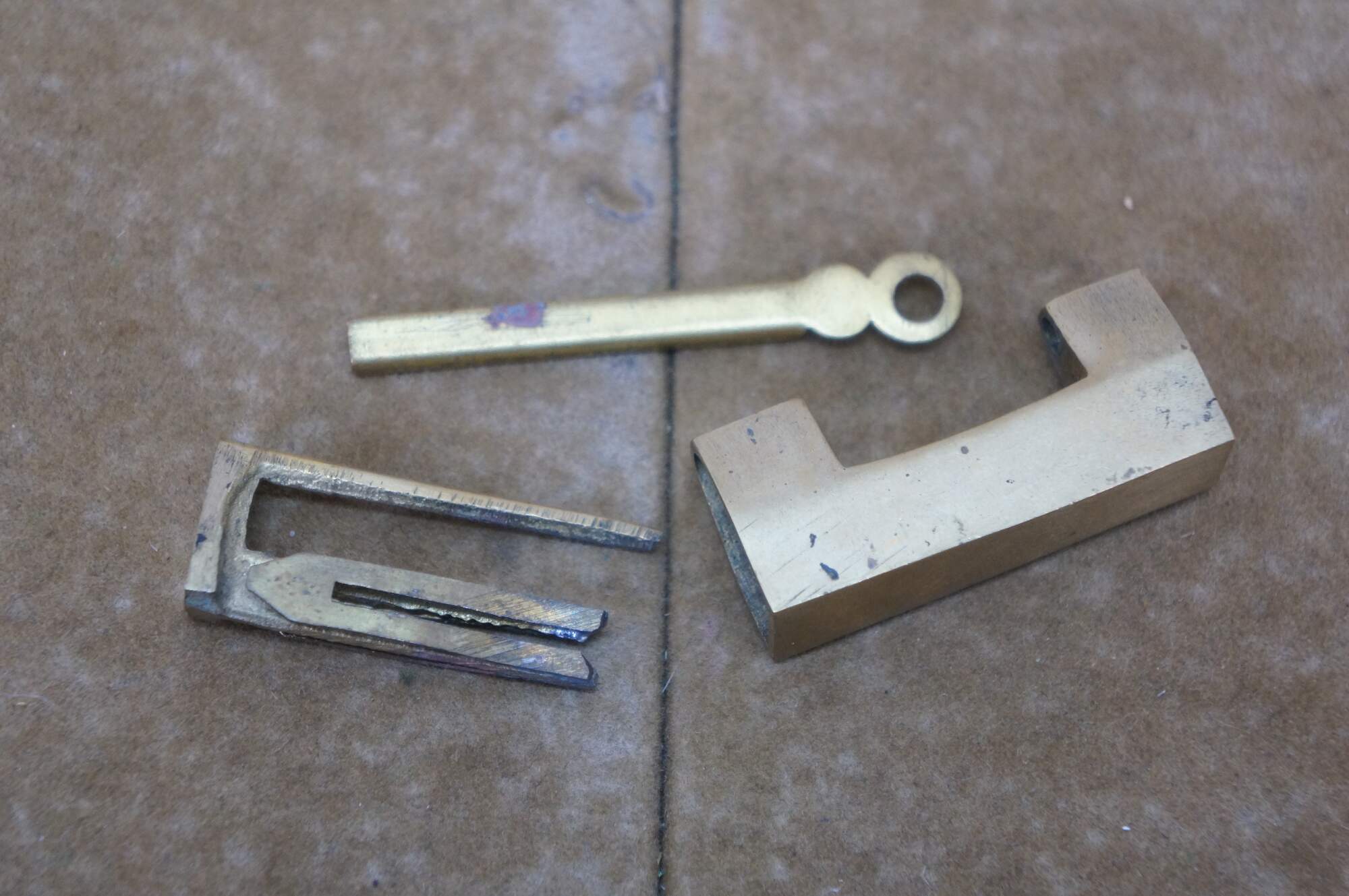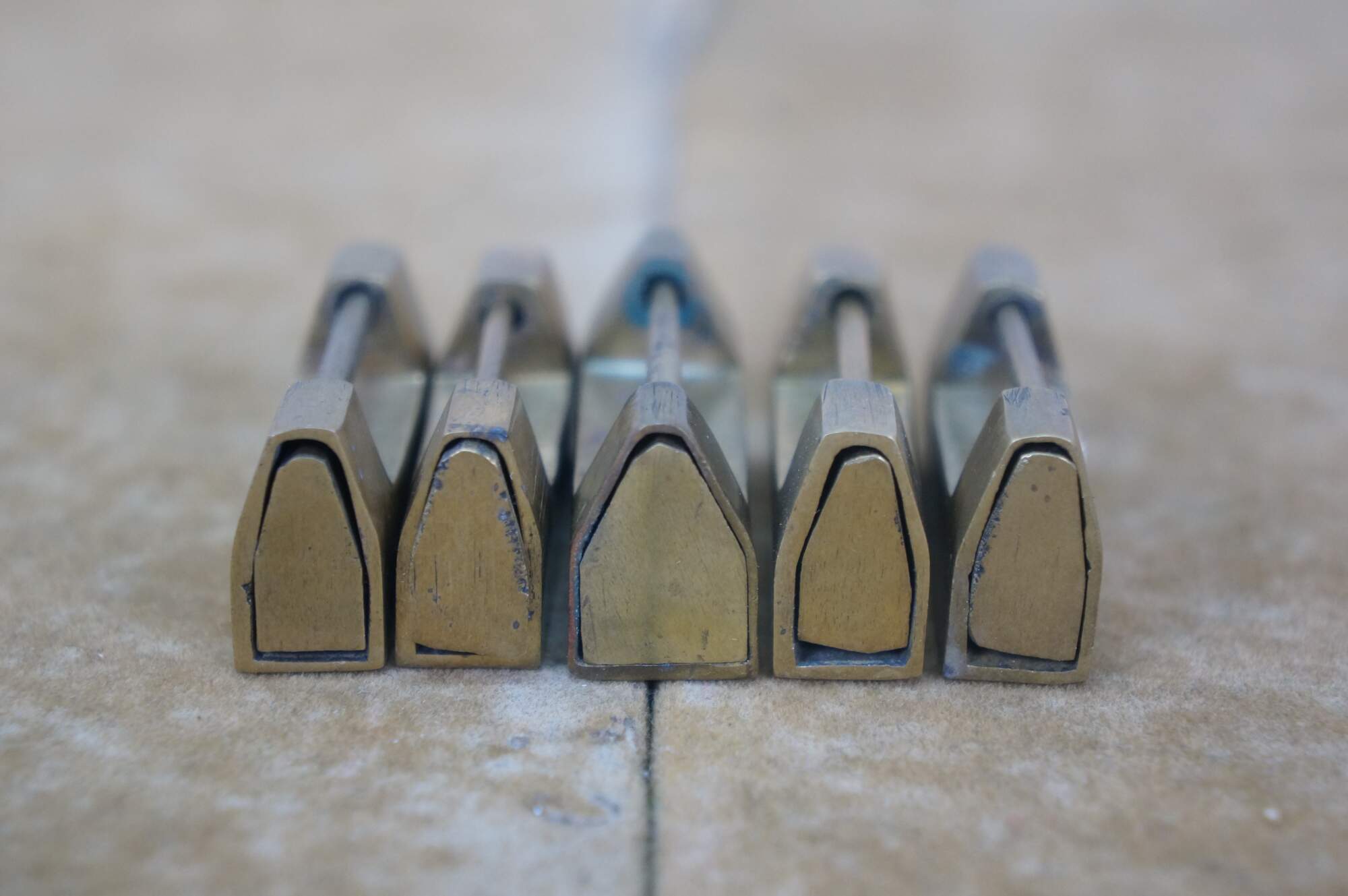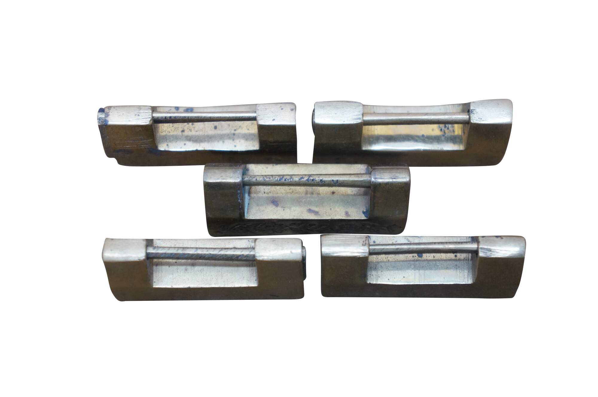 Lot of five mid to late 20th century Chinese sliding brass padlocks and two keys. Four locks plain. One marked Made in Hong kong. One lock etched on one side with flowers and on the other with a dragon.