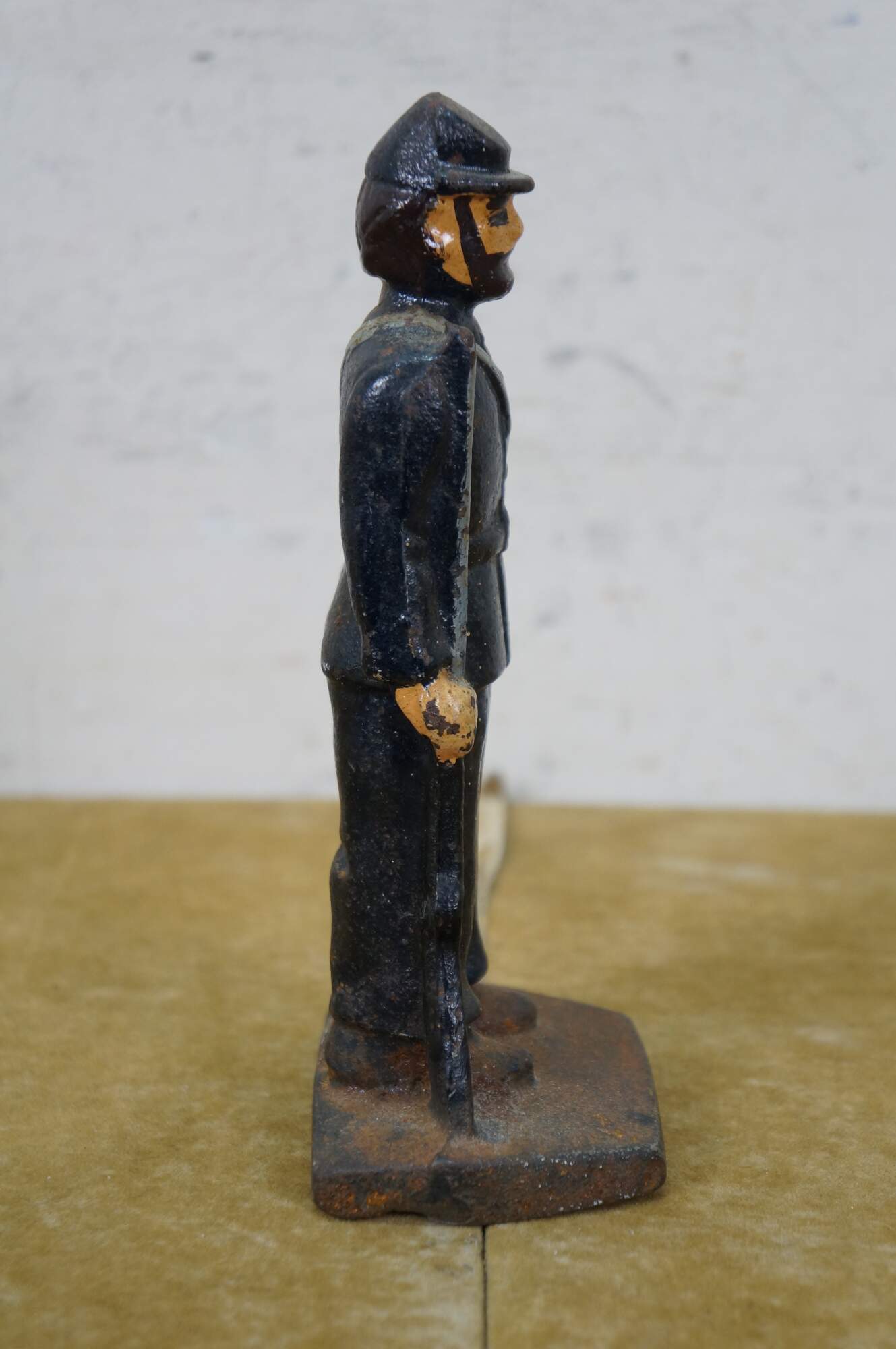 Late 19th to early 20th century cast iron figurine / sculpture - likely a door stop or bookend - in the shape of an American Civil War era Union soldier with a rifle, painted with navy blue uniform and brown beard.