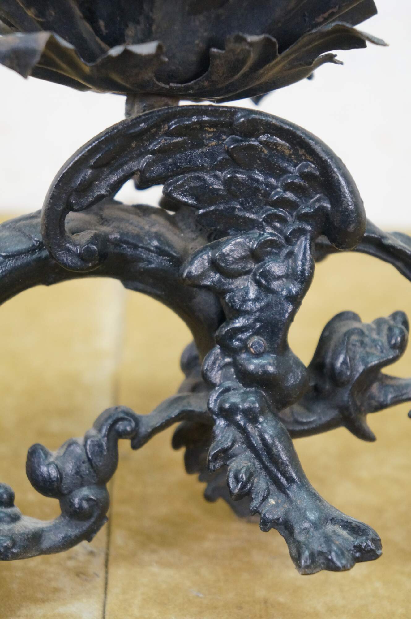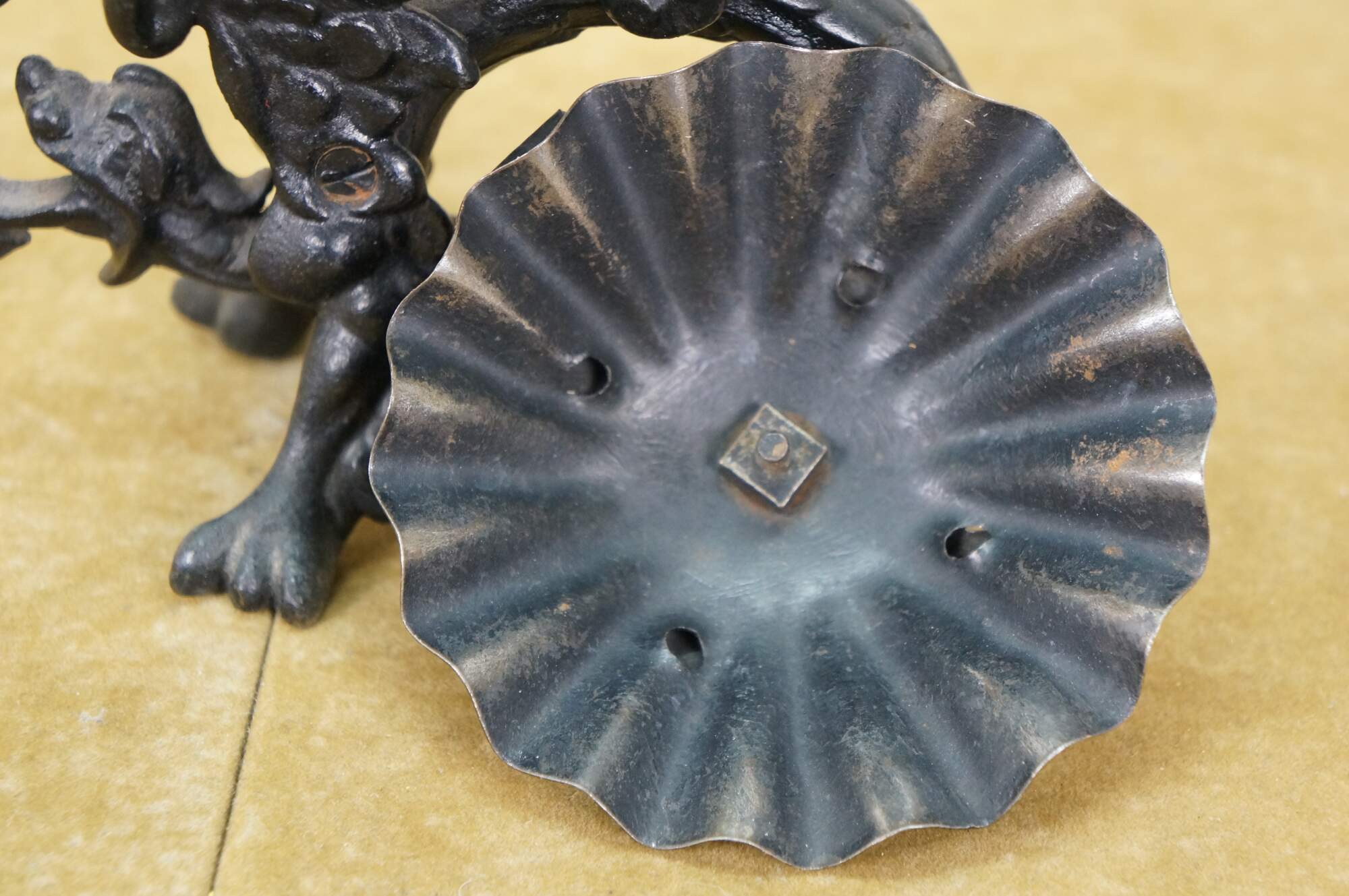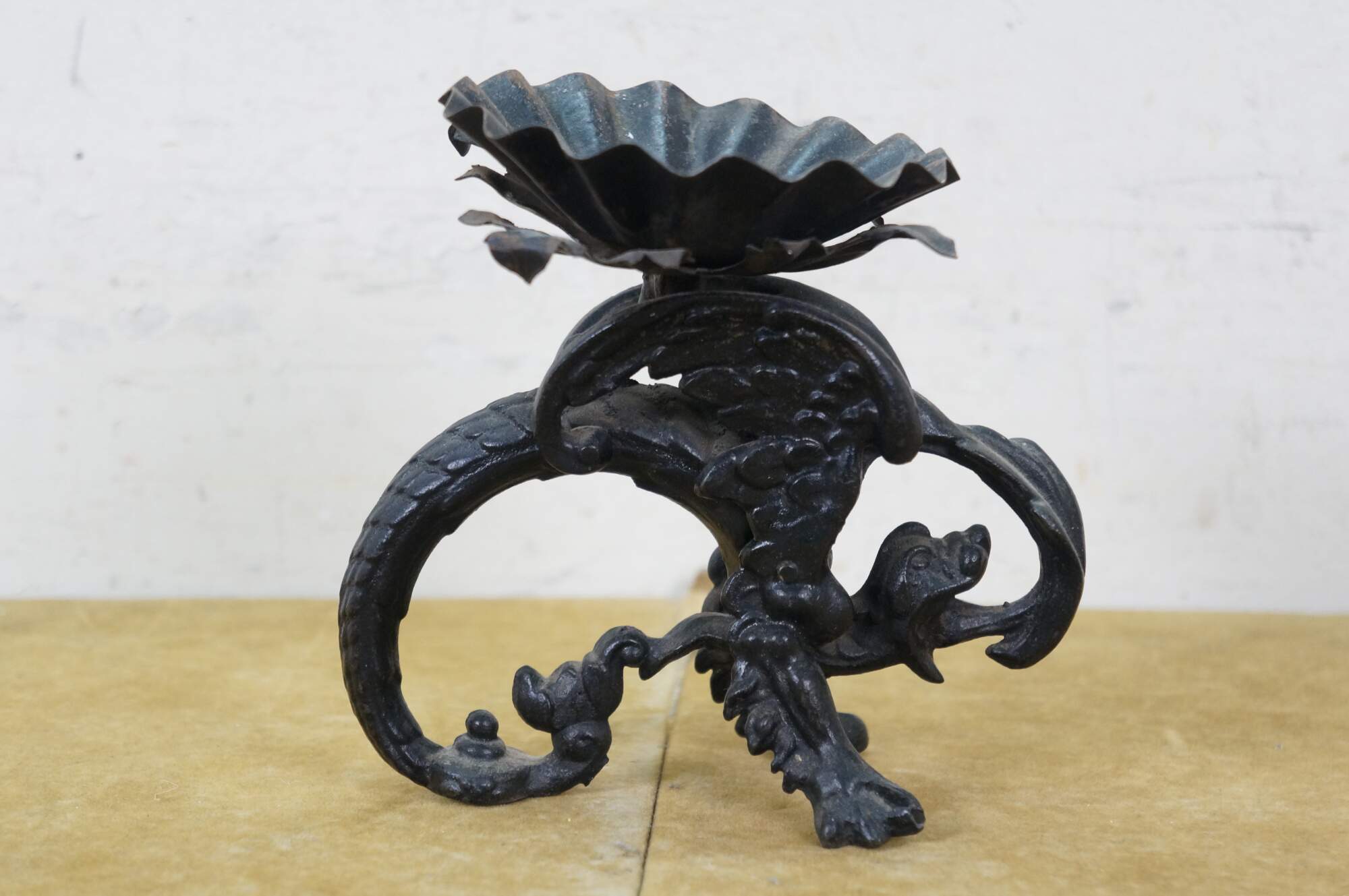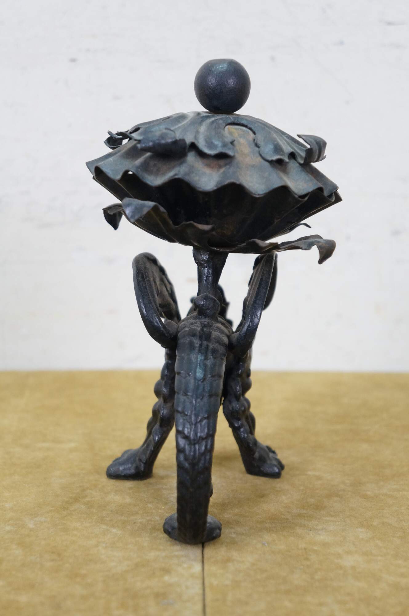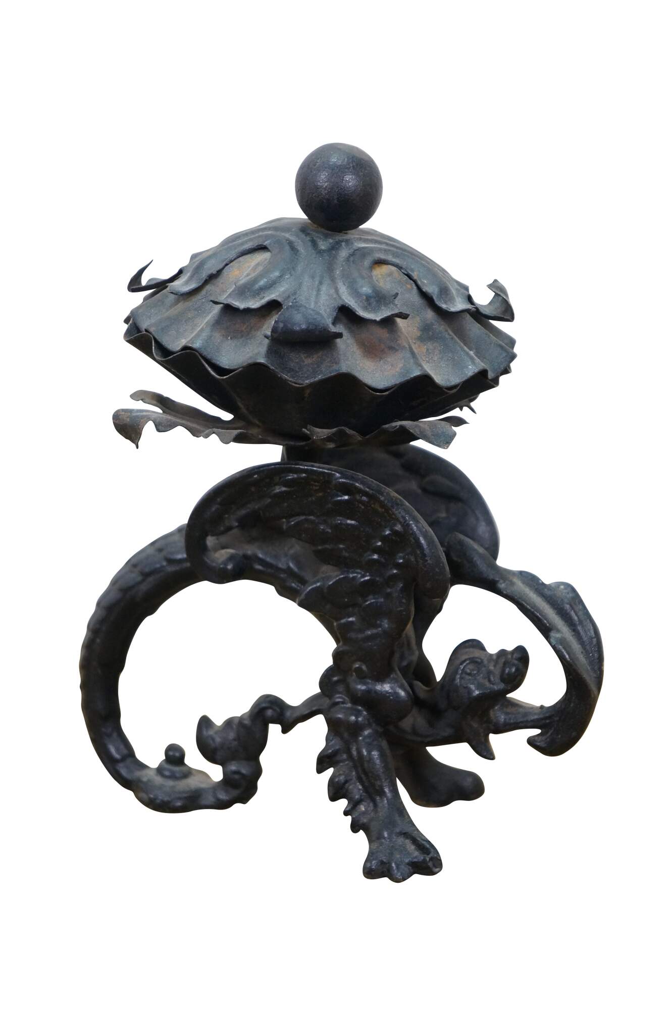 Circa mid to late 20th century black cast iron dragon or griffon breathing fire, supporting a clam shell shaped lidded candy dish / compote / incense / votive / candle holder.