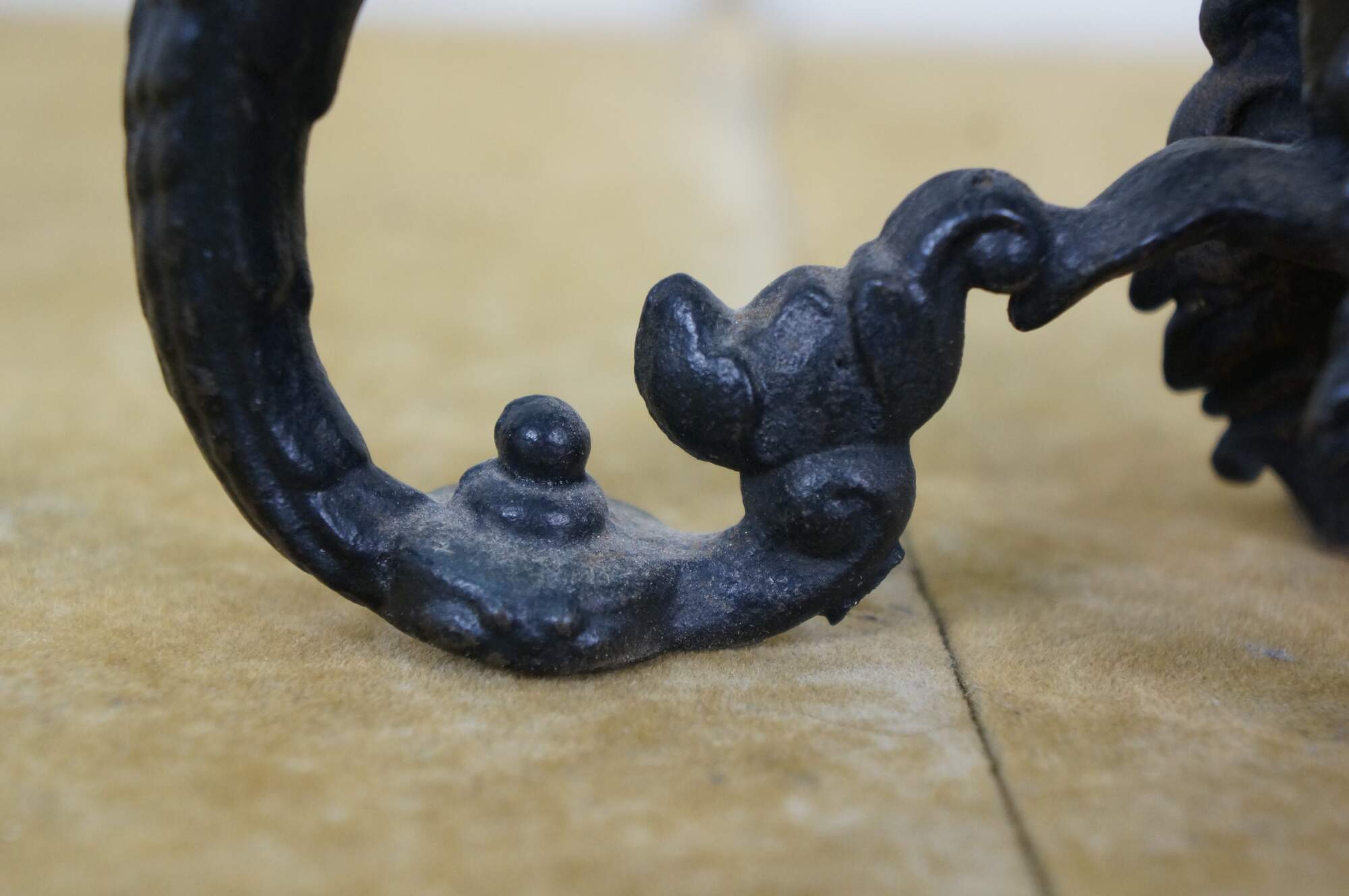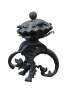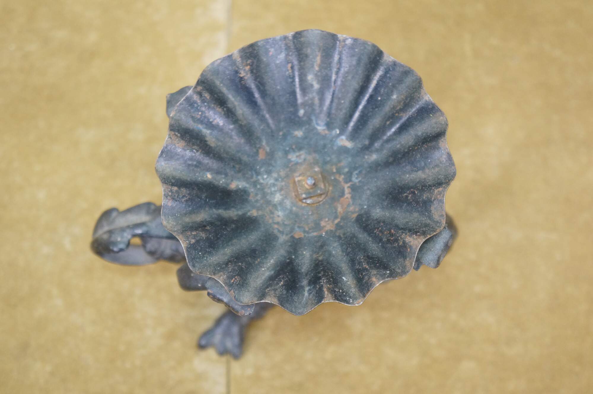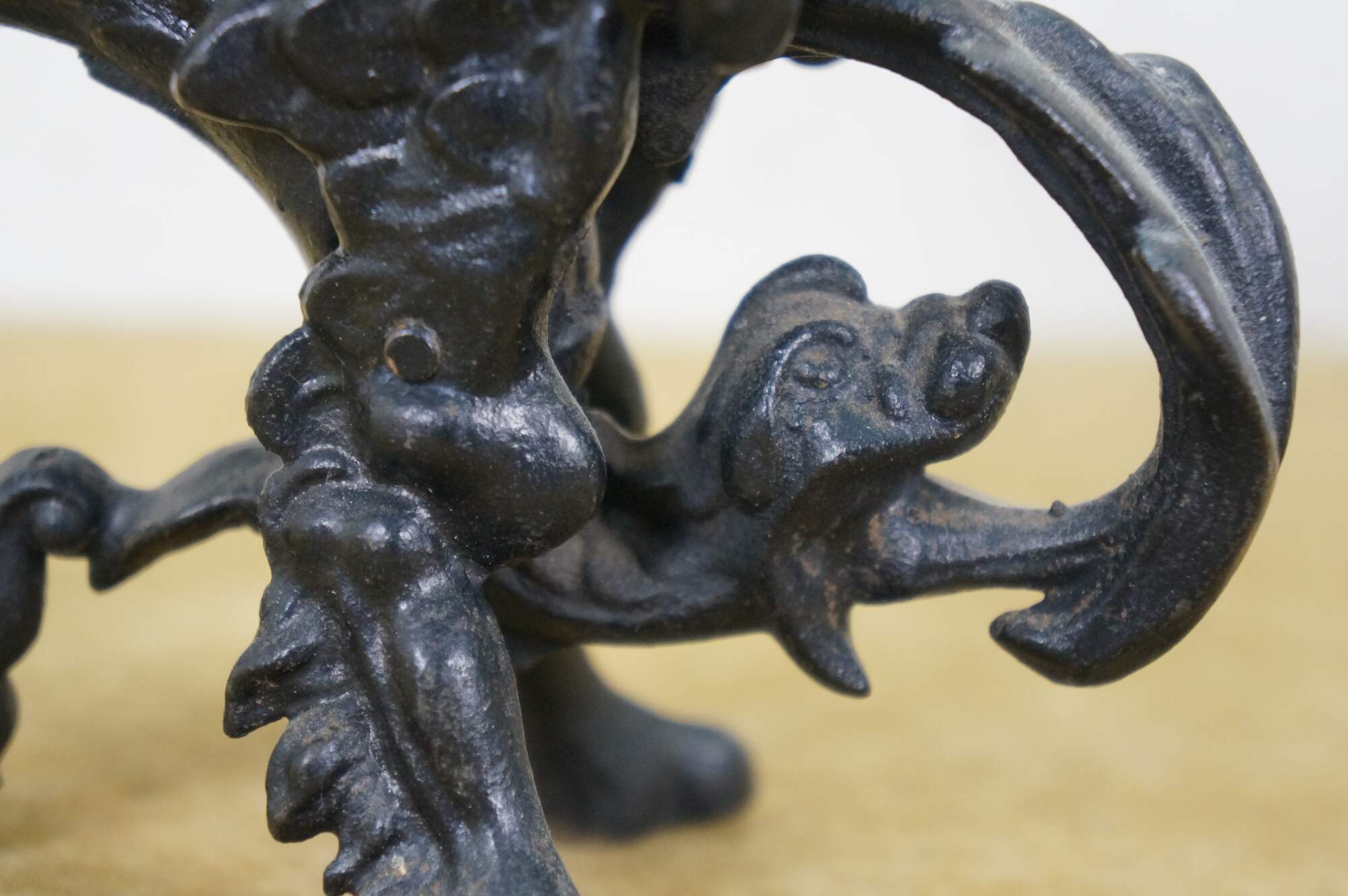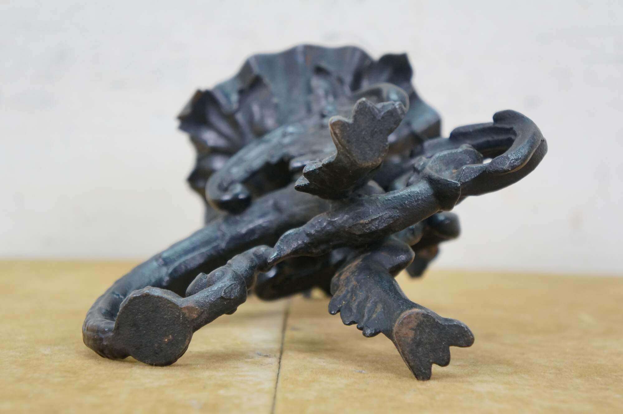Circa mid to late 20th century black cast iron dragon or griffon breathing fire, supporting a clam shell shaped lidded candy dish / compote / incense / votive / candle holder.