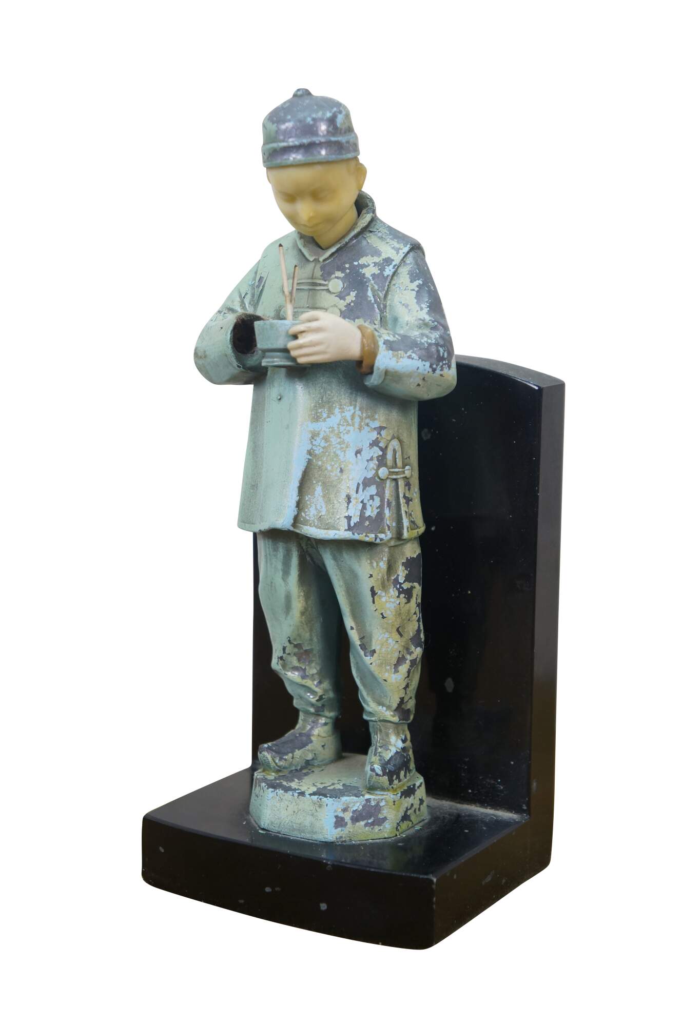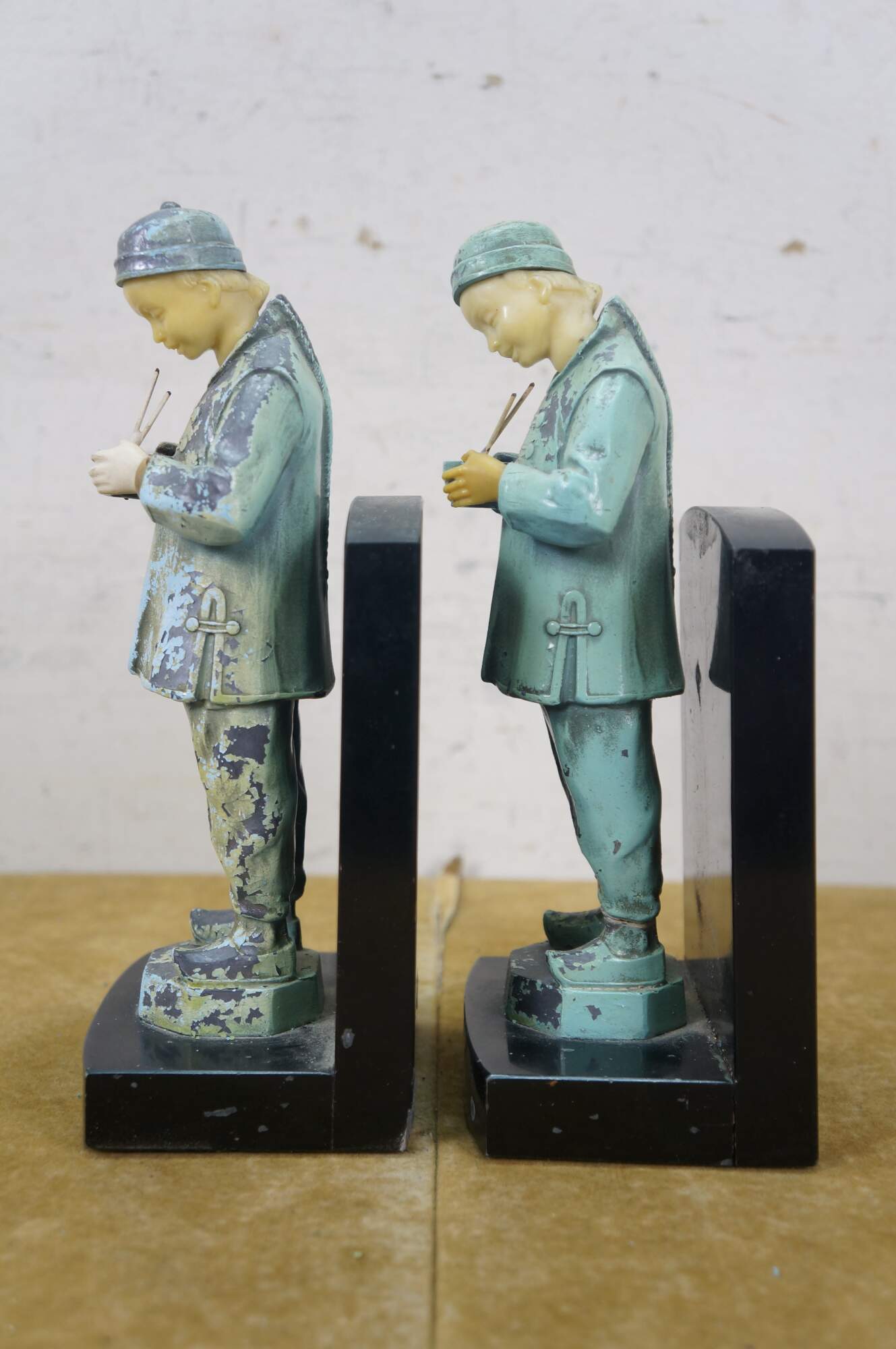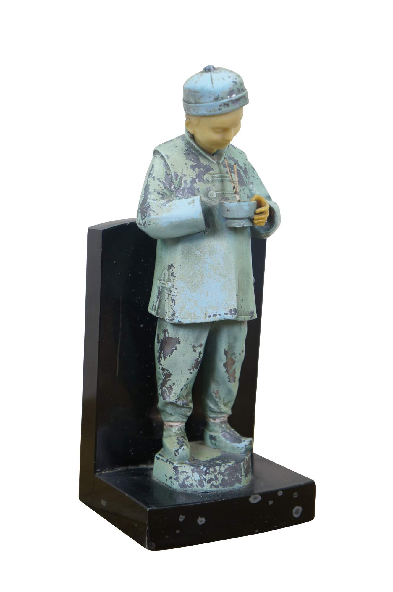 Early 20th century, circa 1930's, pair of cold painted spelter bronze figural bookends attributed to J.B. Hirch. Metal figurines with plastic/celluloid hands and heads, in the shape of men in light blue-teal painted Chinese clothing, holding a bowls with chopsticks. Mounted on L-shaped plinths of black marble.