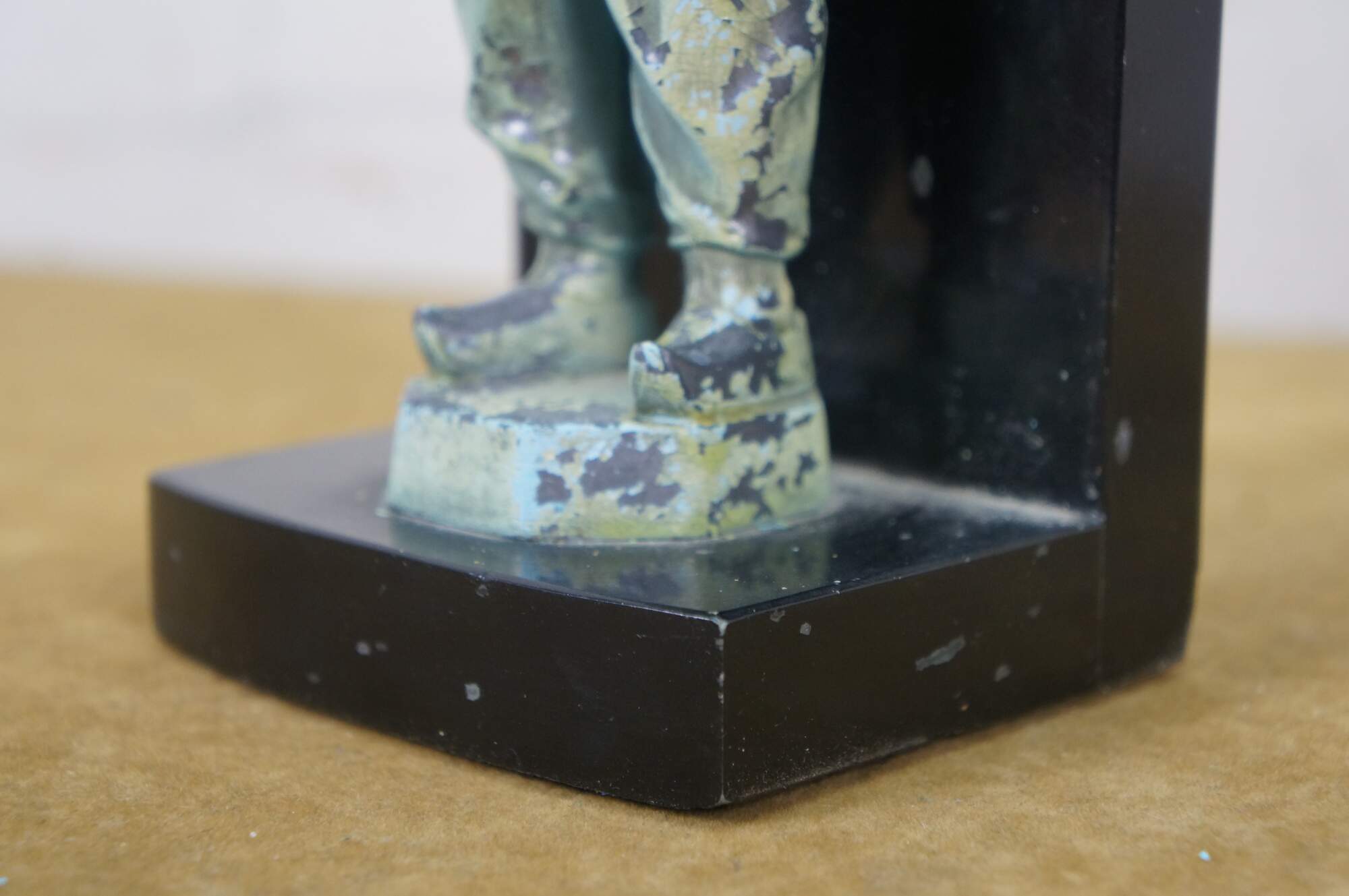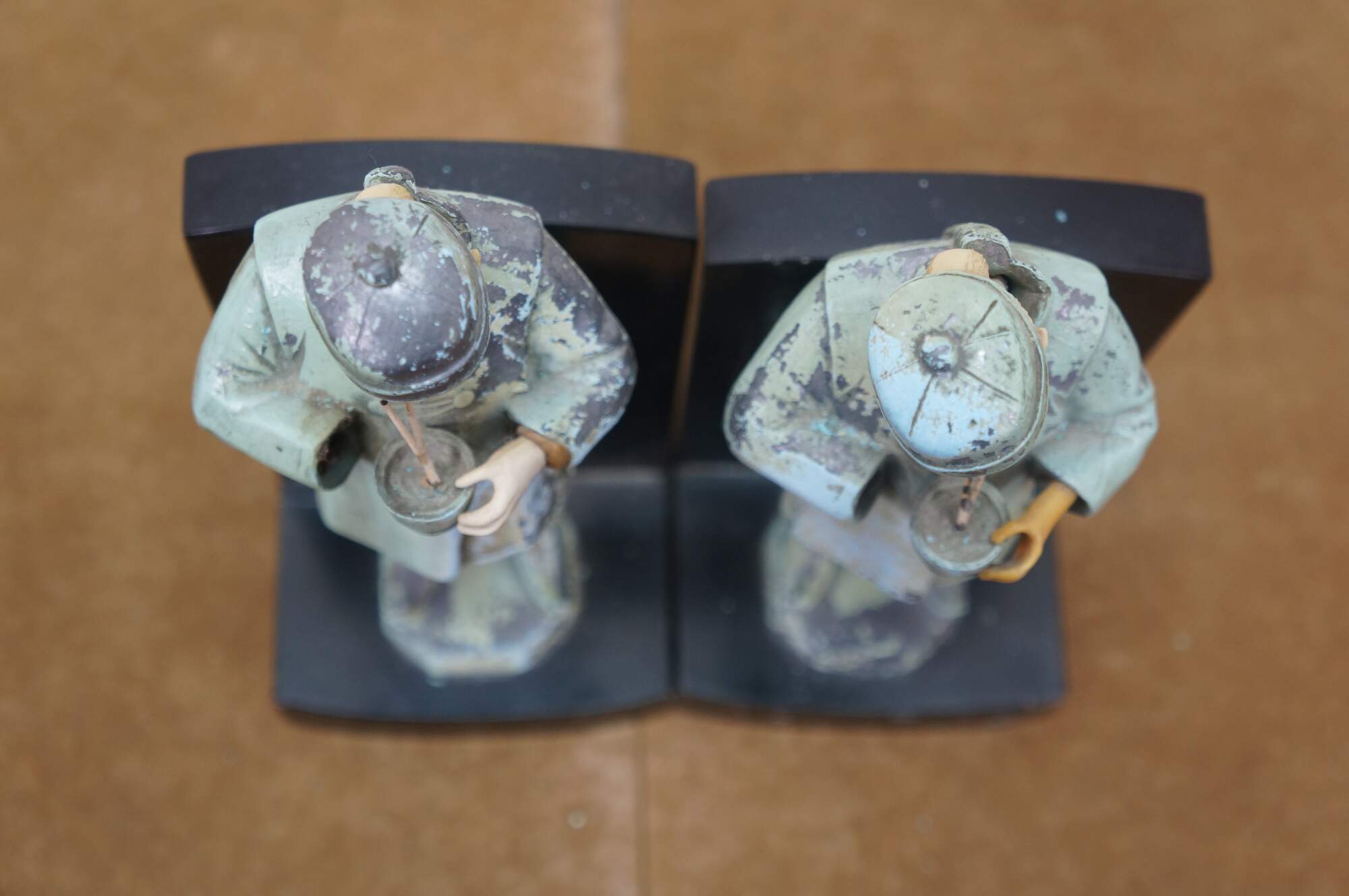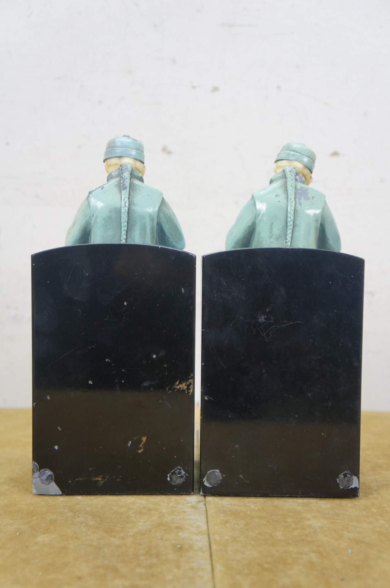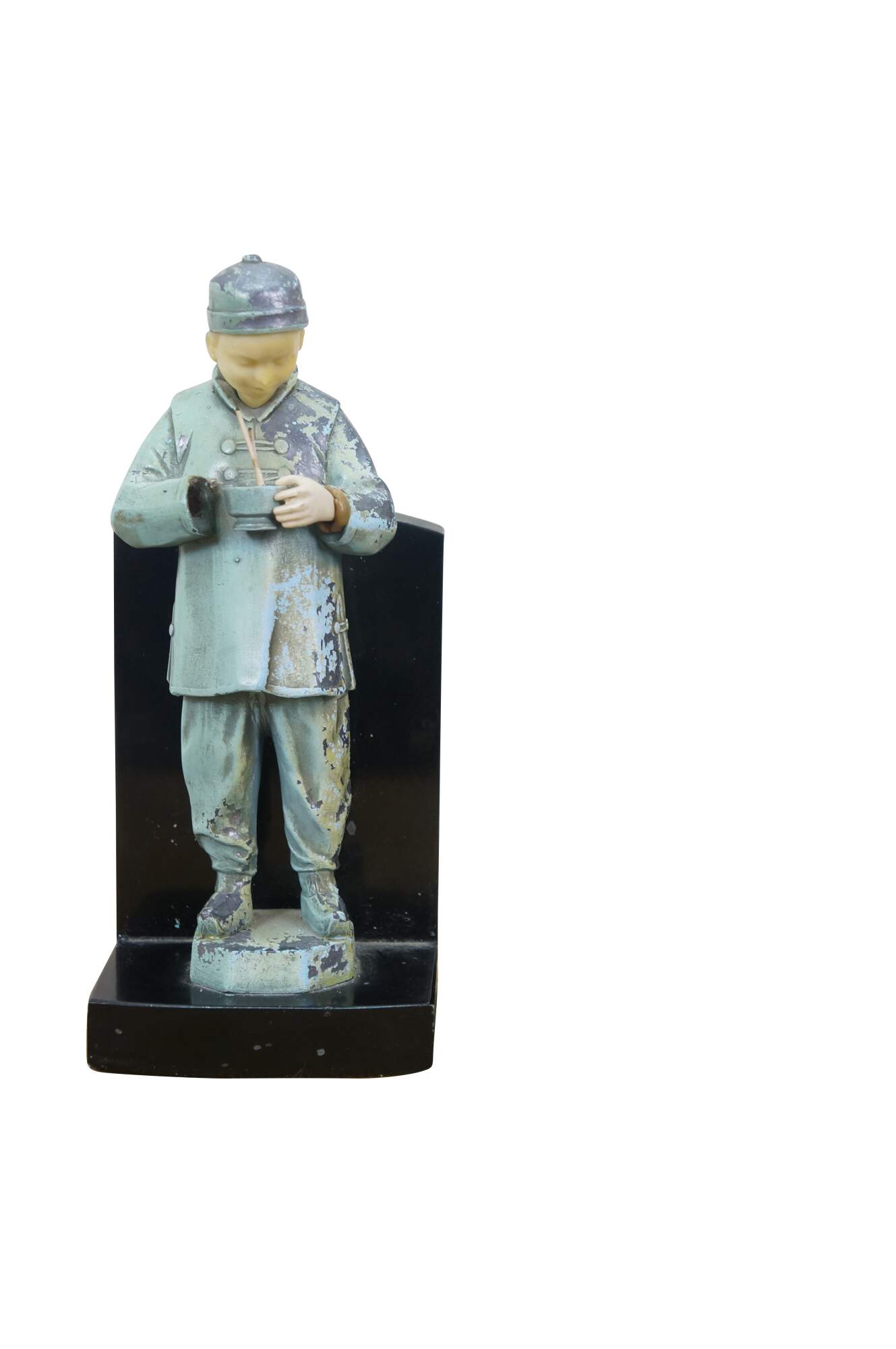 Early 20th century, circa 1930's, pair of cold painted spelter bronze figural bookends attributed to J.B. Hirch. Metal figurines with plastic/celluloid hands and heads, in the shape of men in light blue-teal painted Chinese clothing, holding a bowls with chopsticks. Mounted on L-shaped plinths of black marble.