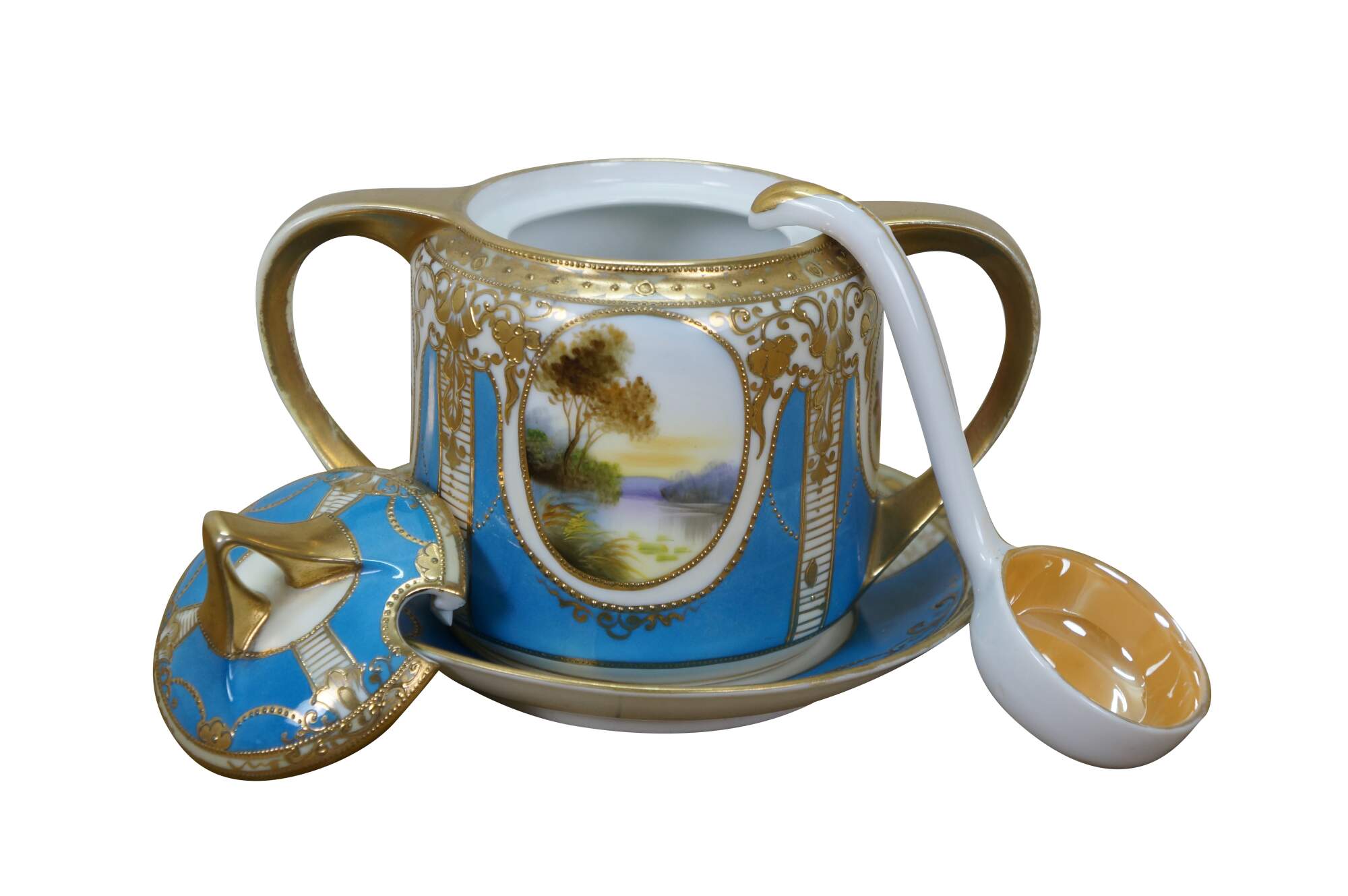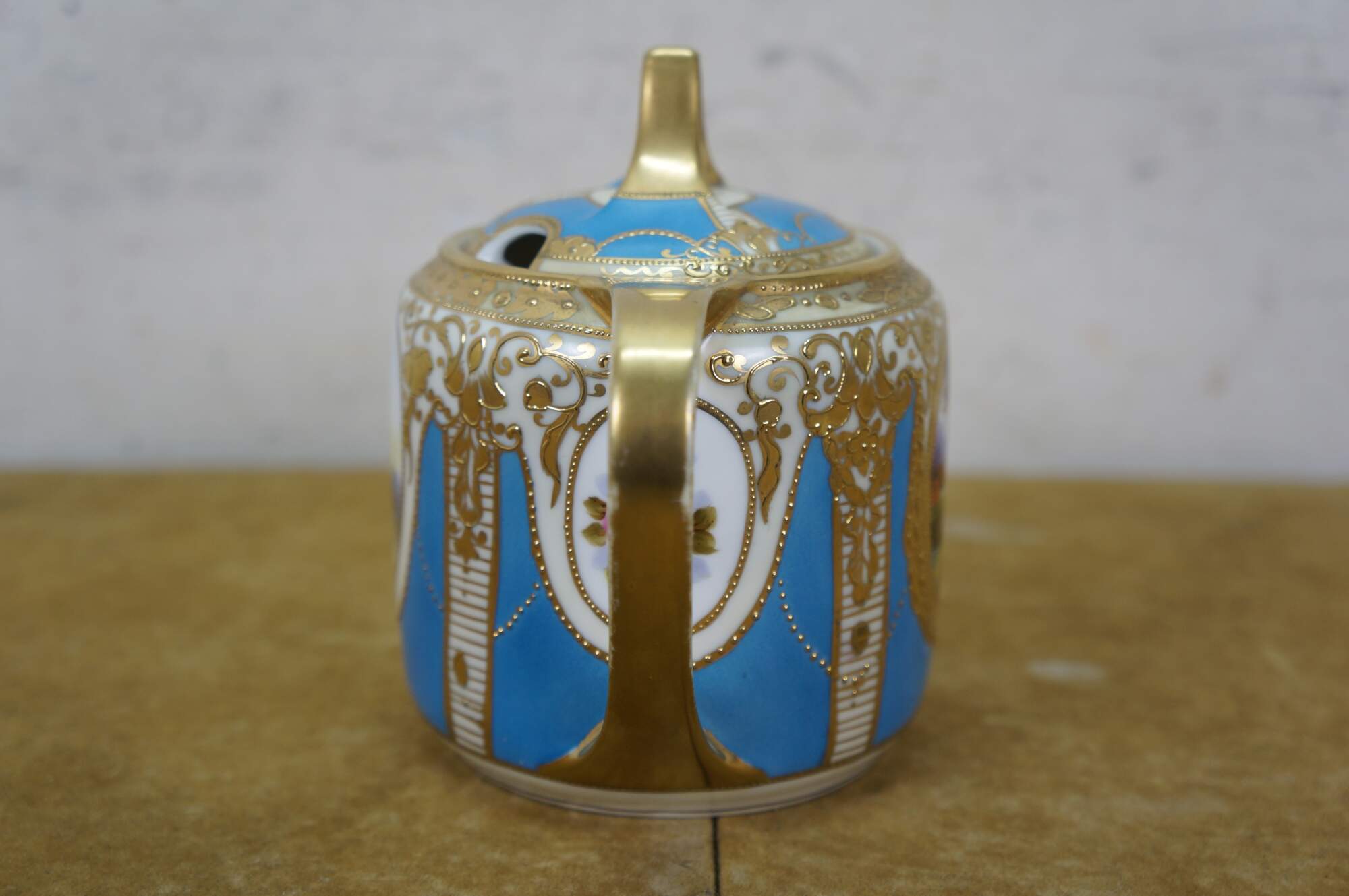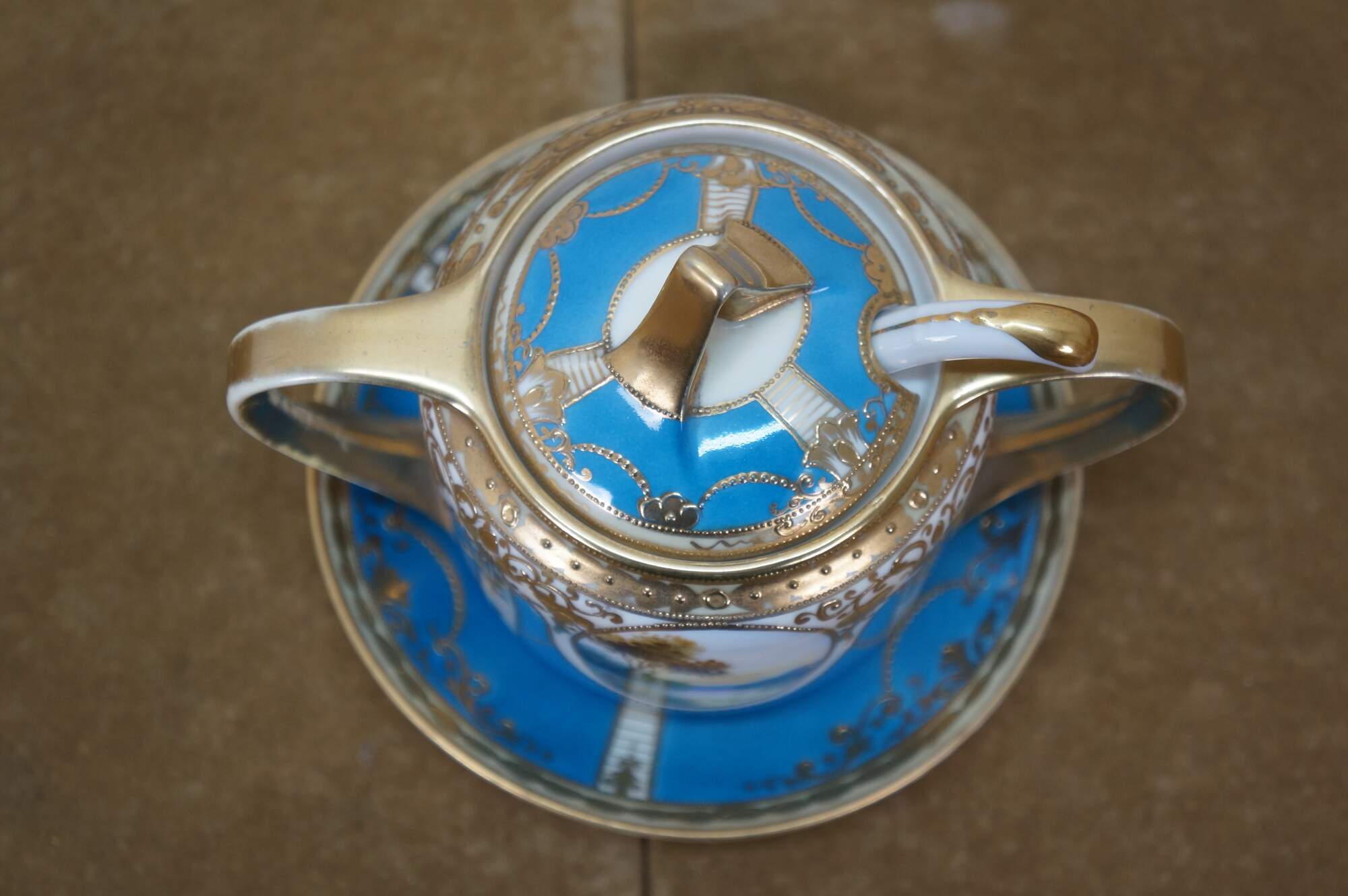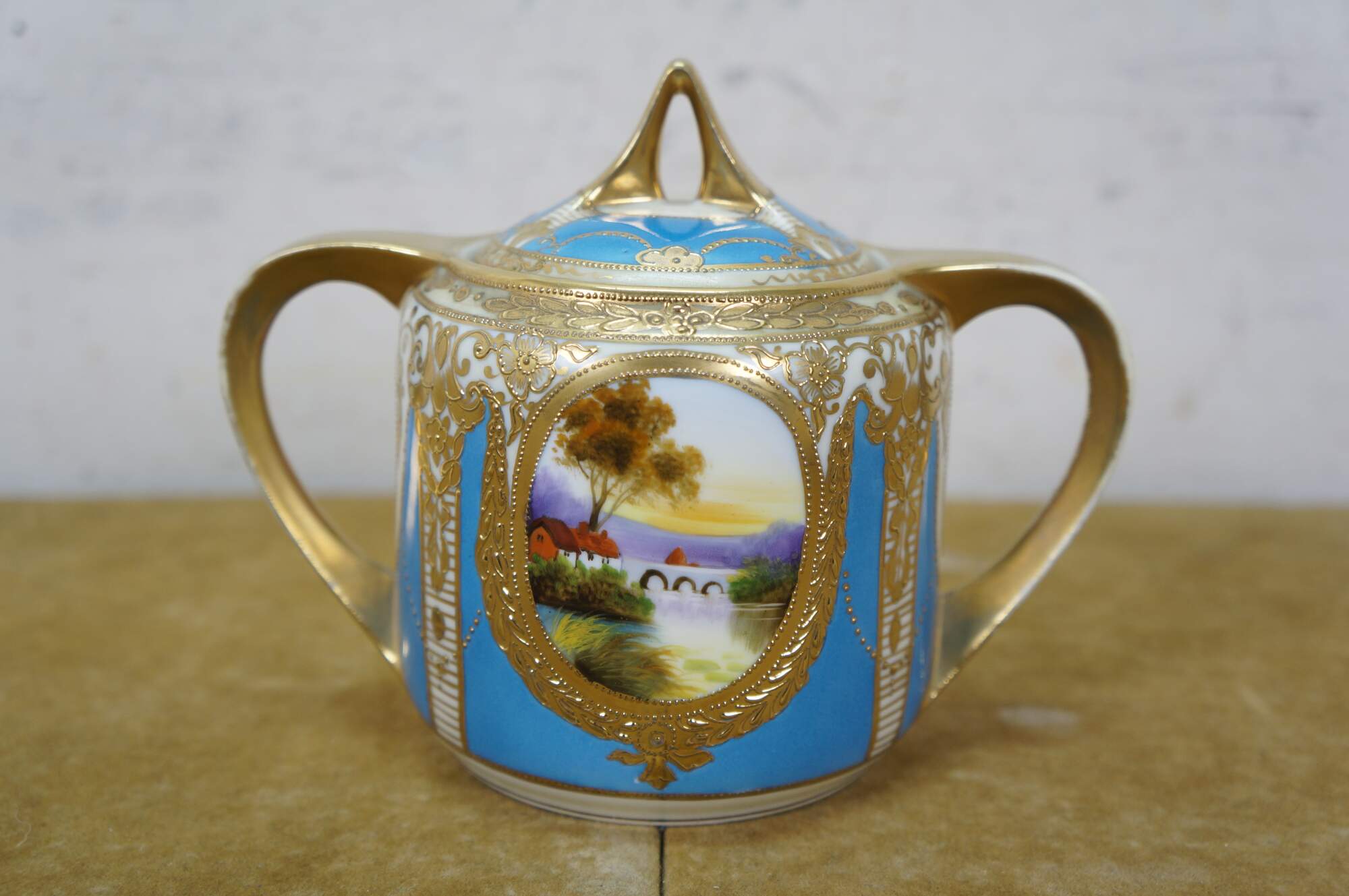 Early to mid 20th century Noritake porcelain sugar bowl with lid, spoon and underplate. Imitates the look of French Sevre style porcelain with turquoise blue panels framed in gilt moriage floral swags and details; sides hand painted with miniature country landscapes and pink roses. Mark used circa 1918-1940s.