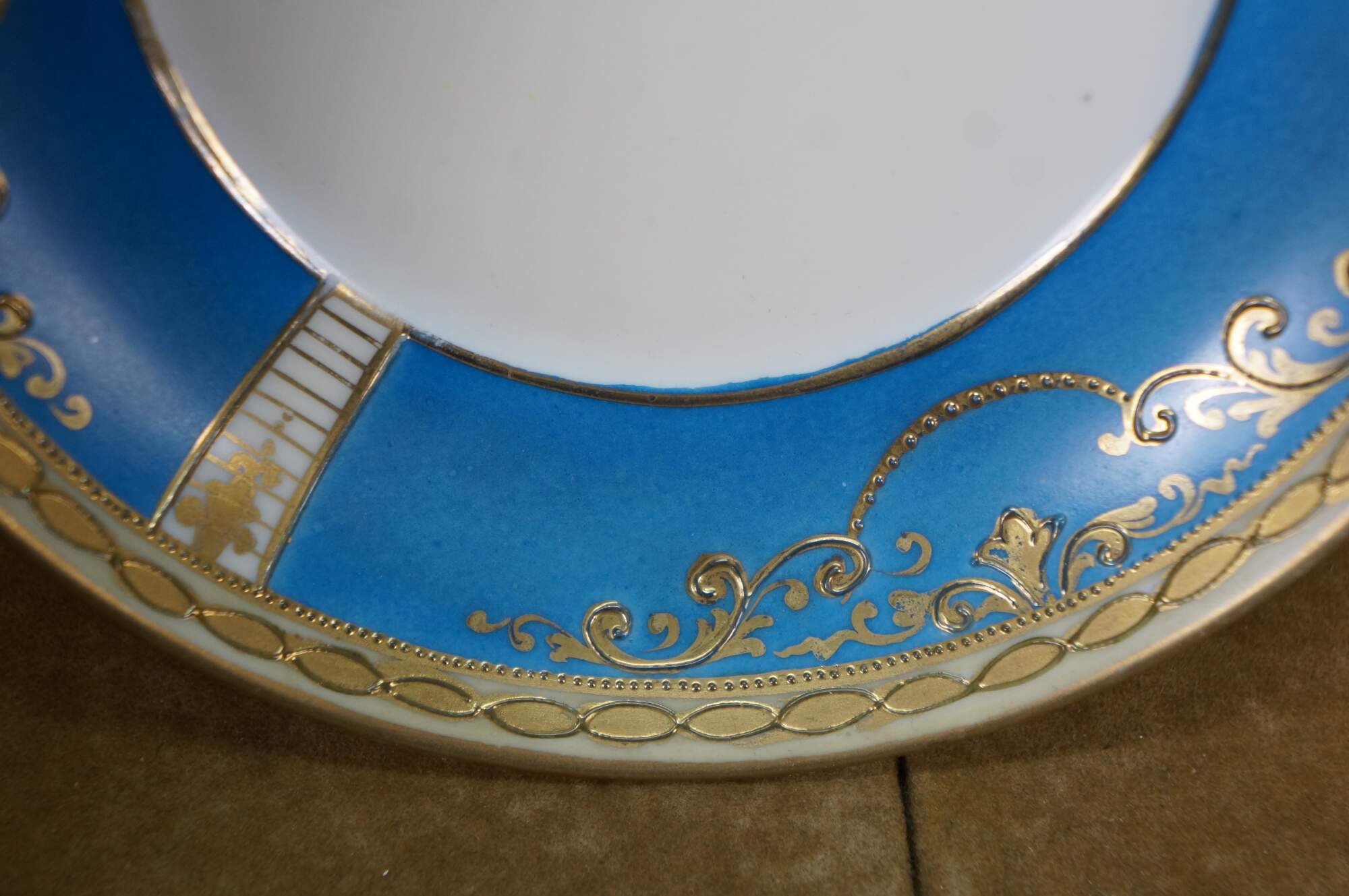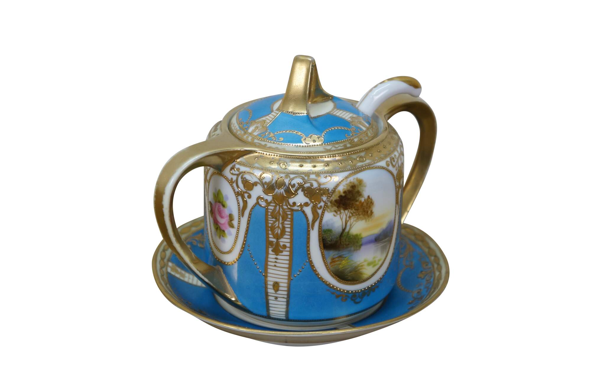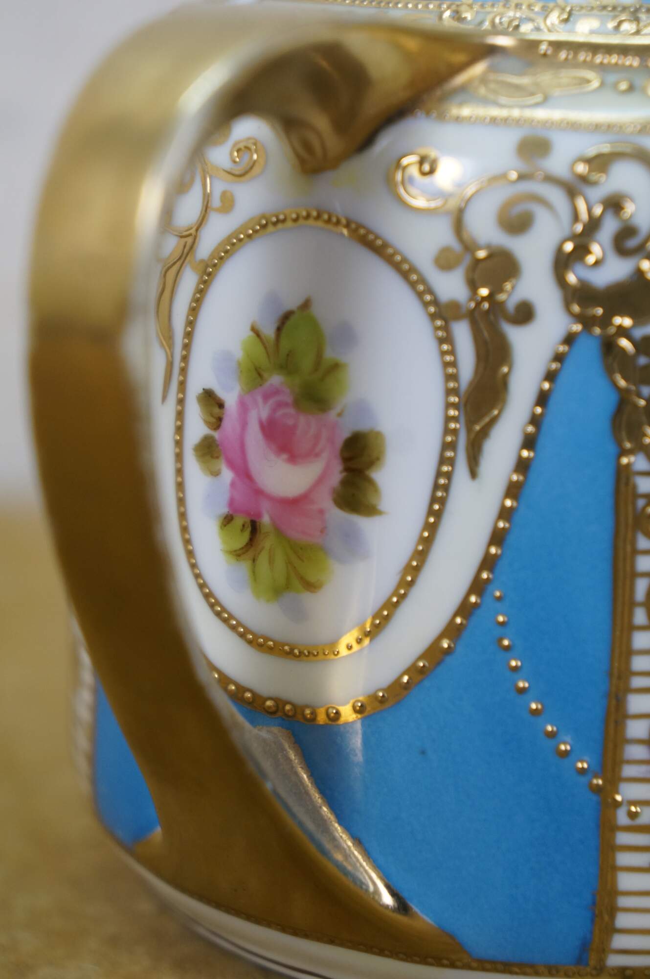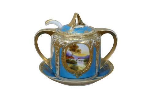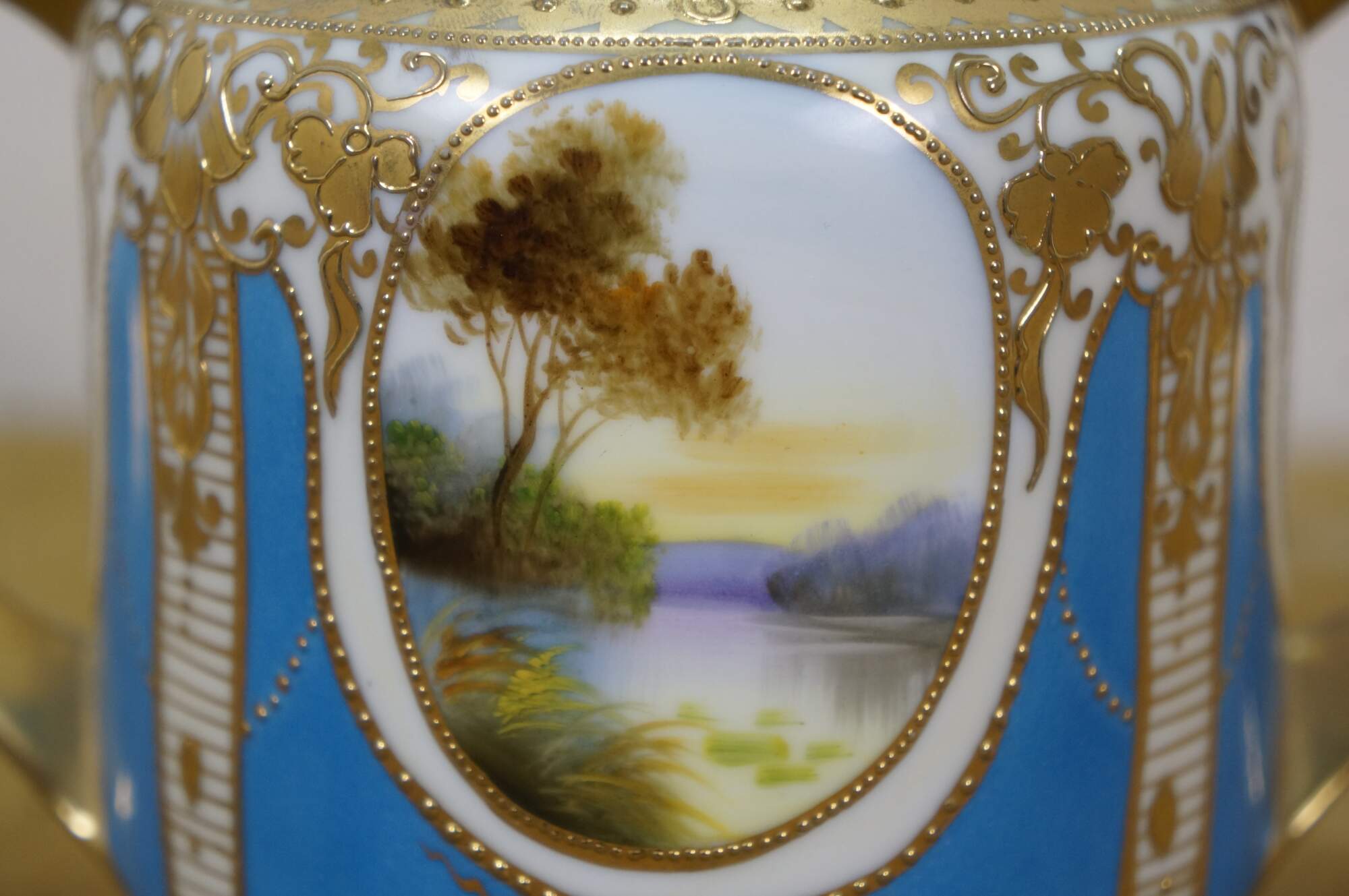 Early to mid 20th century Noritake porcelain sugar bowl with lid, spoon and underplate. Imitates the look of French Sevre style porcelain with turquoise blue panels framed in gilt moriage floral swags and details; sides hand painted with miniature country landscapes and pink roses. Mark used circa 1918-1940s.