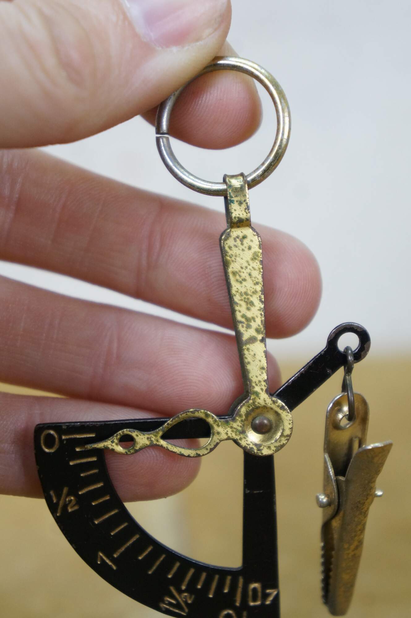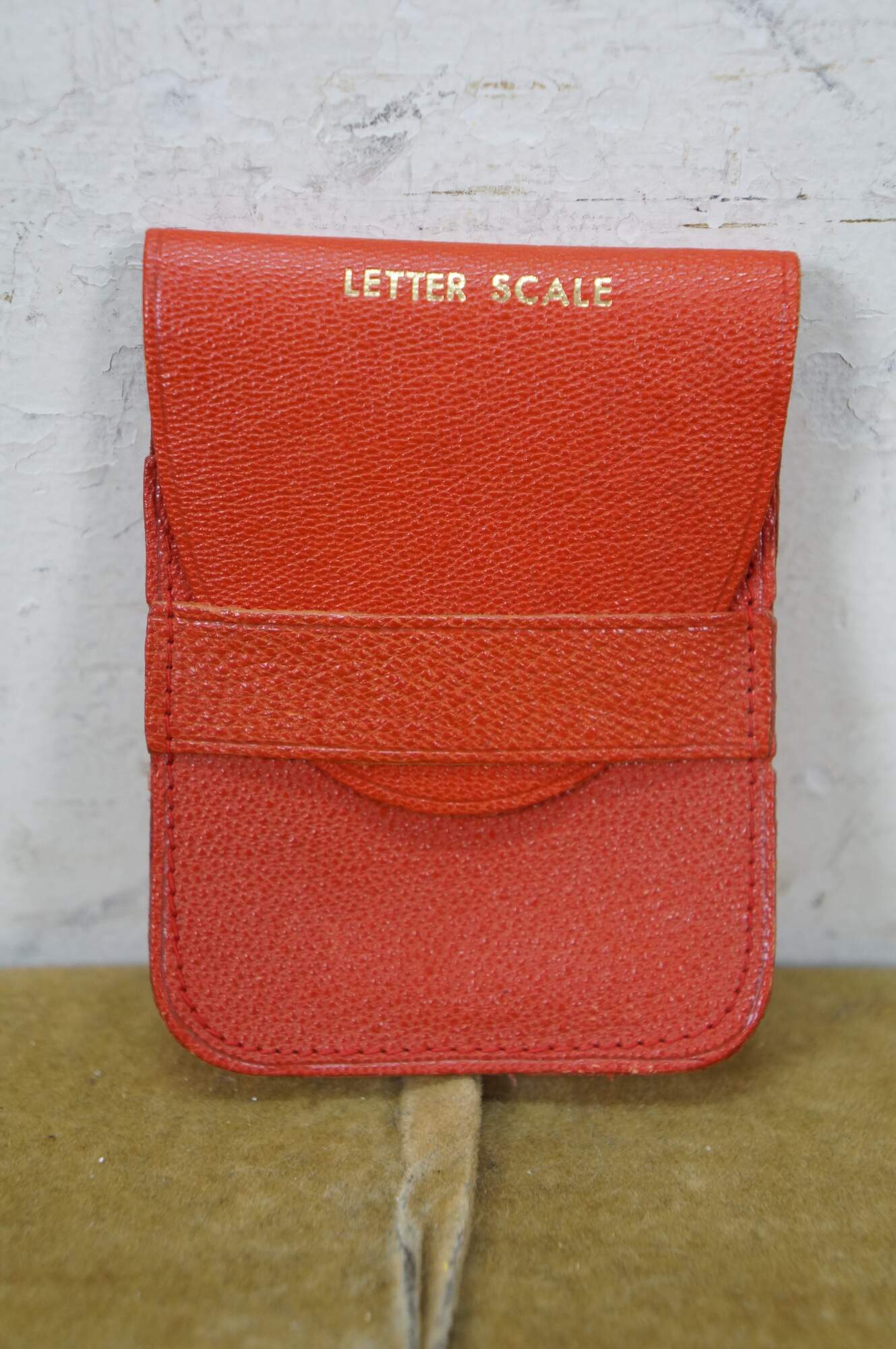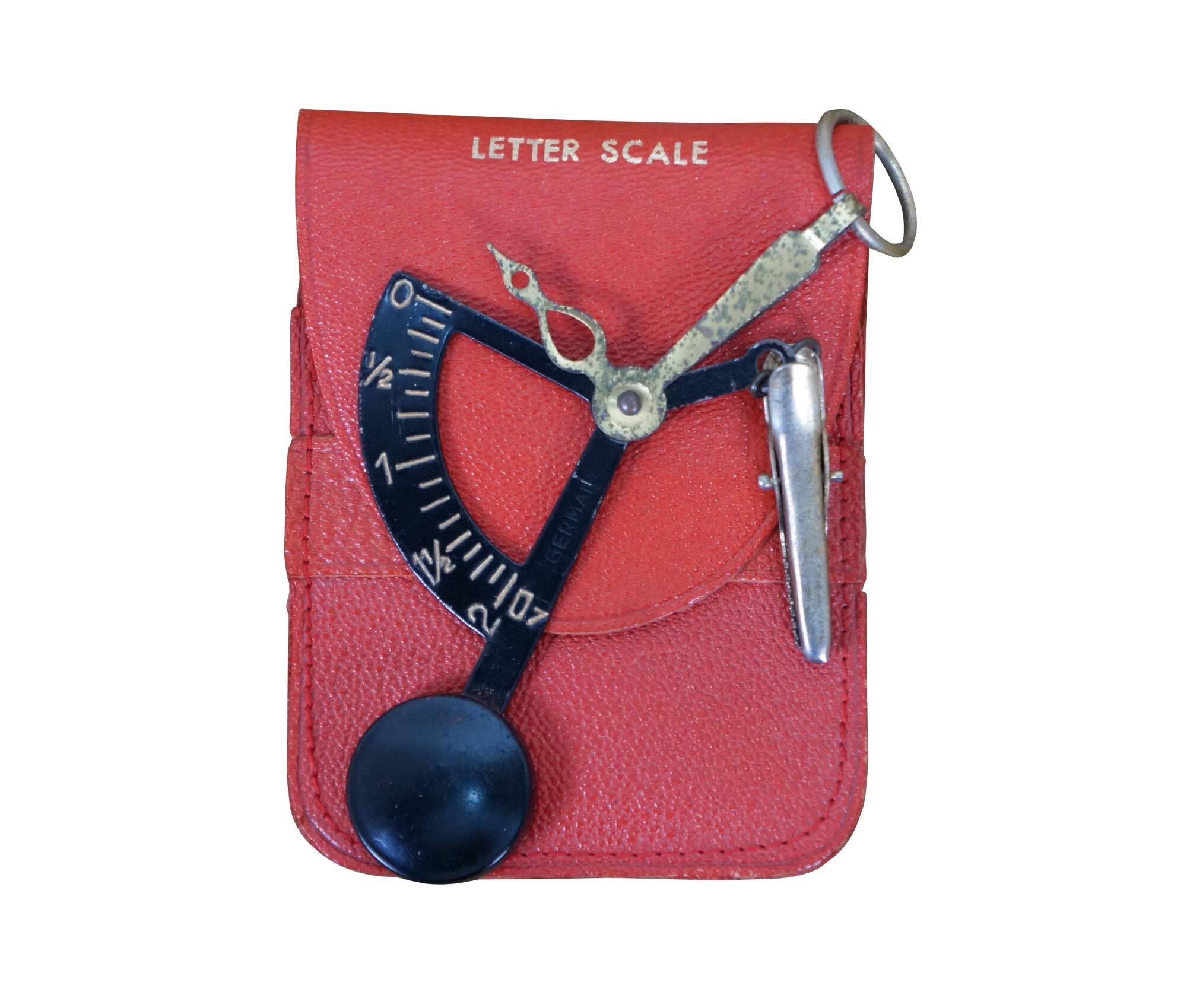 Vintage 20th century pocket sized hand held postal / letter scale. Suspends from the finger on a metal ring, brass weight indicator, black enameled weighted scale and alligator clip for the letter. Reads up to 2 oz. Includes red morocco leather case with extra slot for postage stamps.