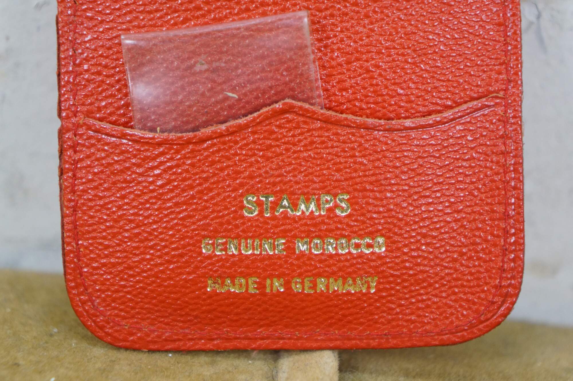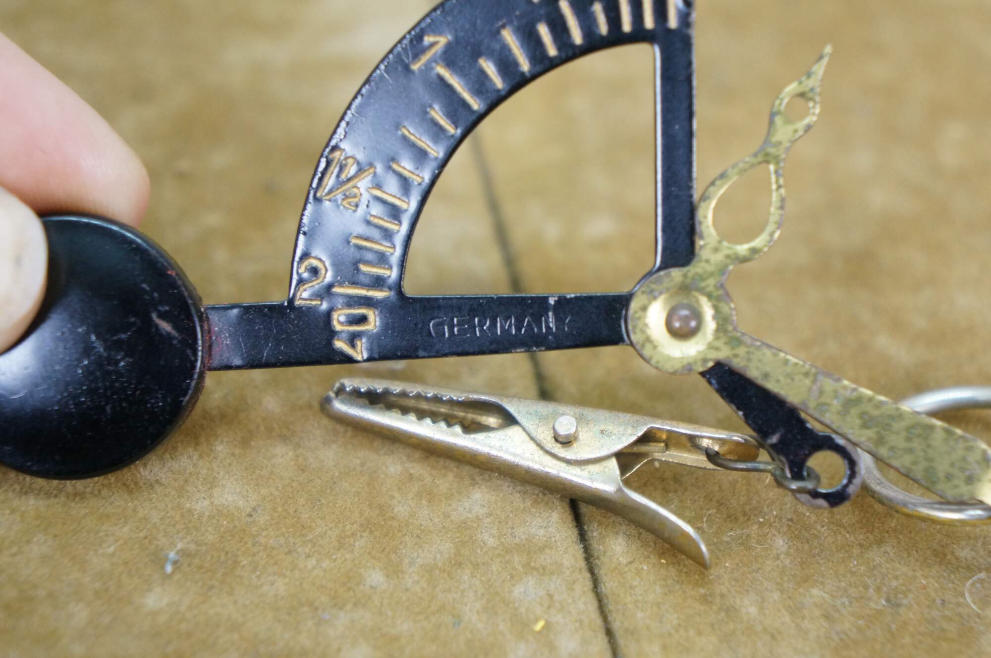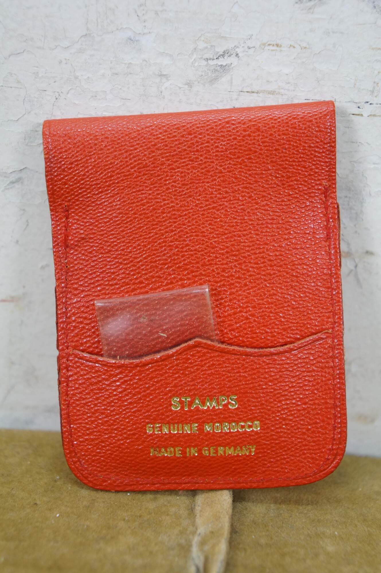 Vintage 20th century pocket sized hand held postal / letter scale. Suspends from the finger on a metal ring, brass weight indicator, black enameled weighted scale and alligator clip for the letter. Reads up to 2 oz. Includes red morocco leather case with extra slot for postage stamps.