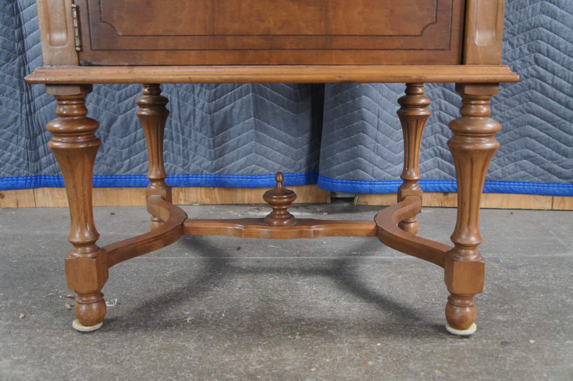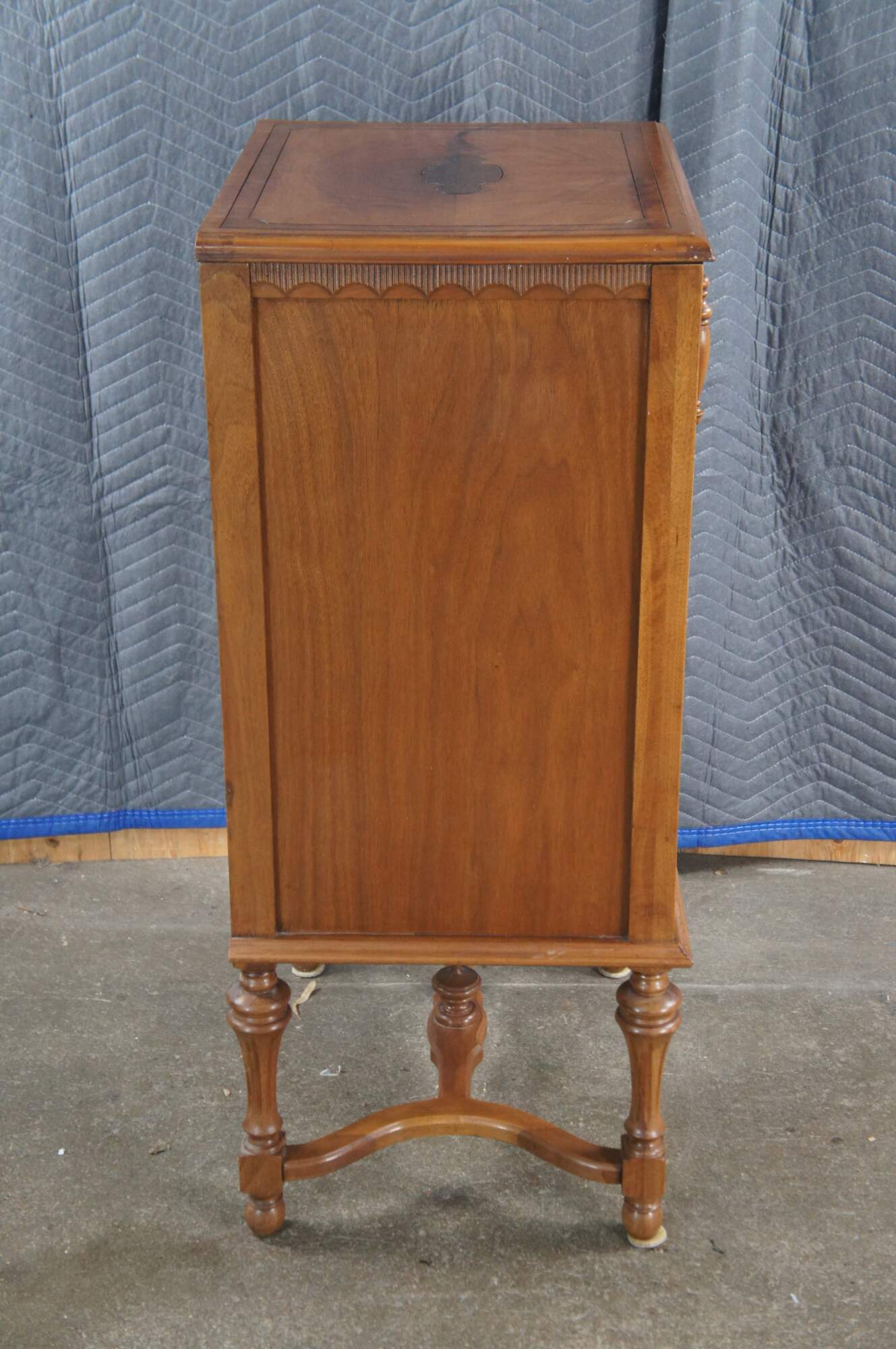 A beautiful early 20th Century Phonograph Console Cabinet. Made from walnut with matchbook burled front panels. The lid opens up to a fretwork carved front trim and a drop front where the speaker would have been The bottom cabinet opens for record stroage. The console is features a fluted and arcaded molding along the top and applied spindles along the front. The cabinet is supported by turned fluted and tapered legs connected by a trestle base with a finial. Ready for use with a modern record player and speaker swap.