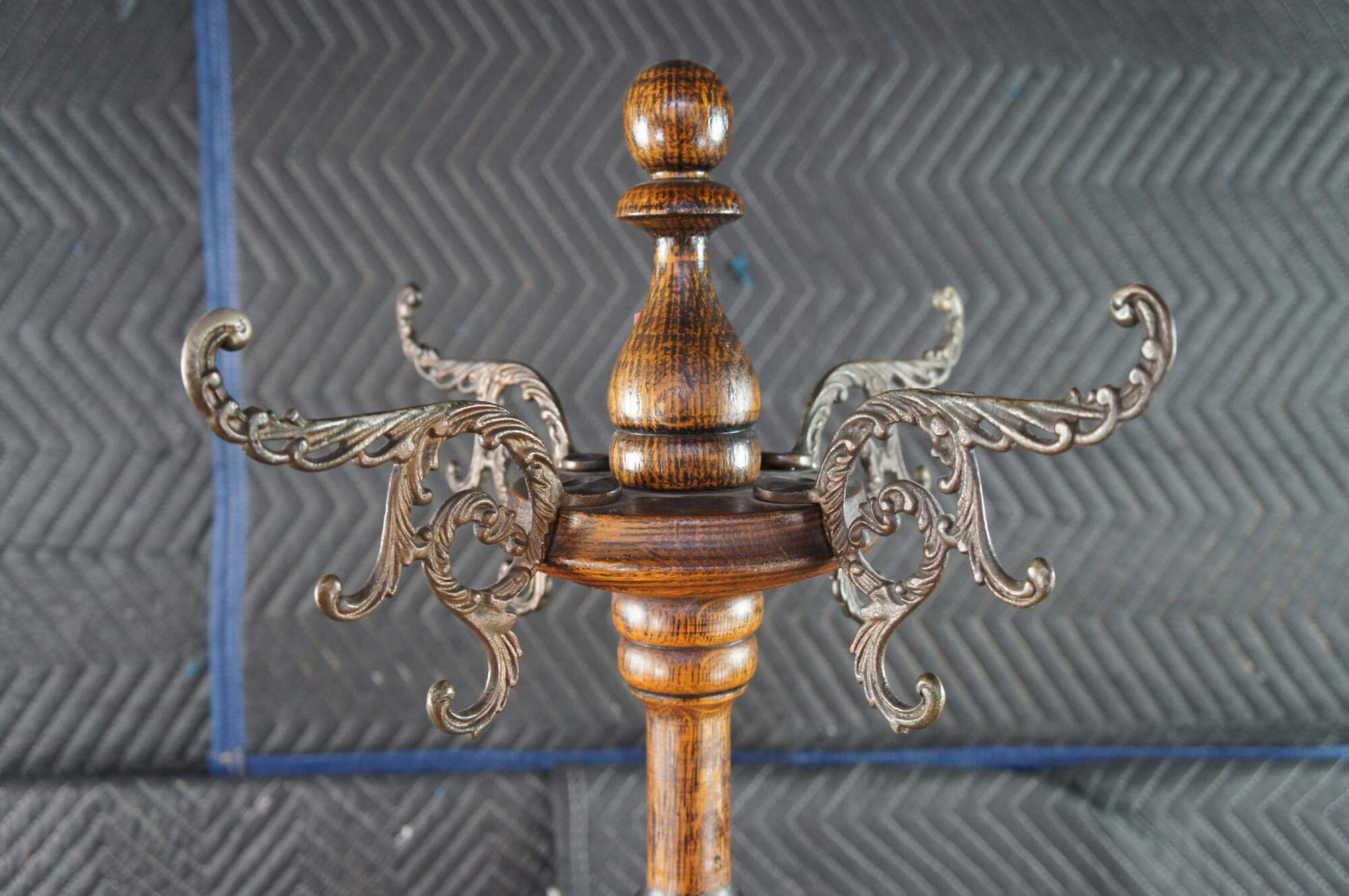 Antique Victorian coat rack / hall tree featuring pierced scrollwork hangers and a long turned ribbed post supported by four splay hoof style feet.