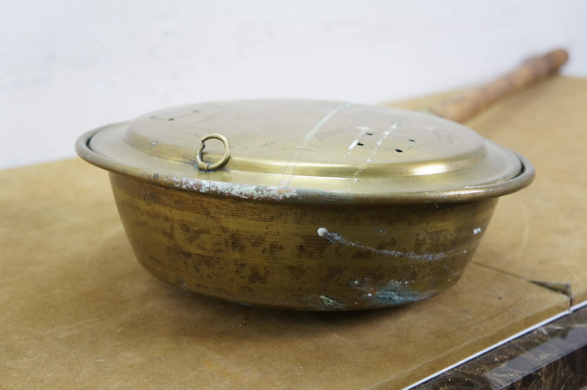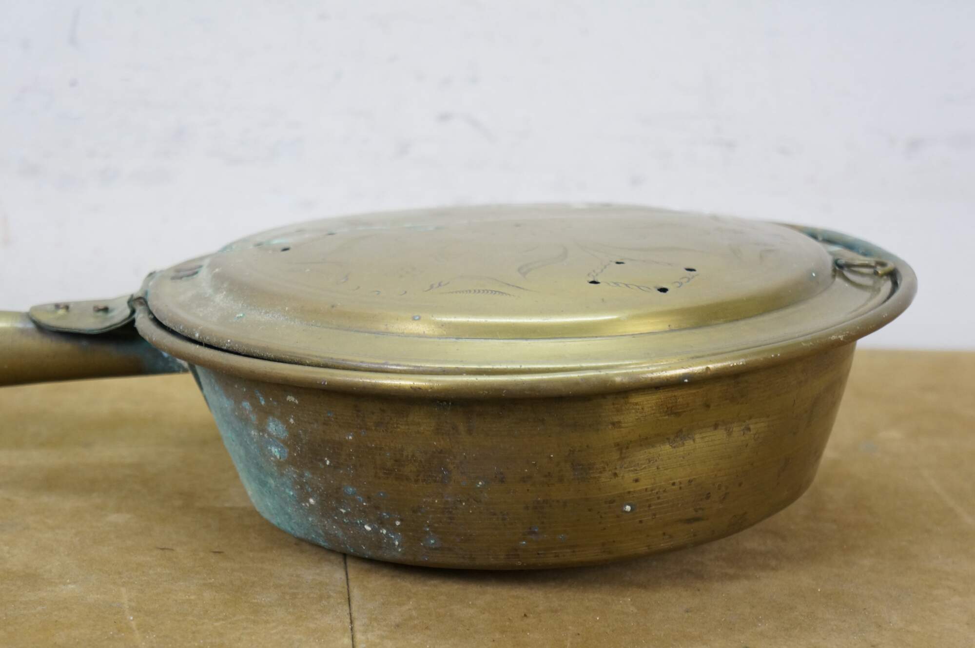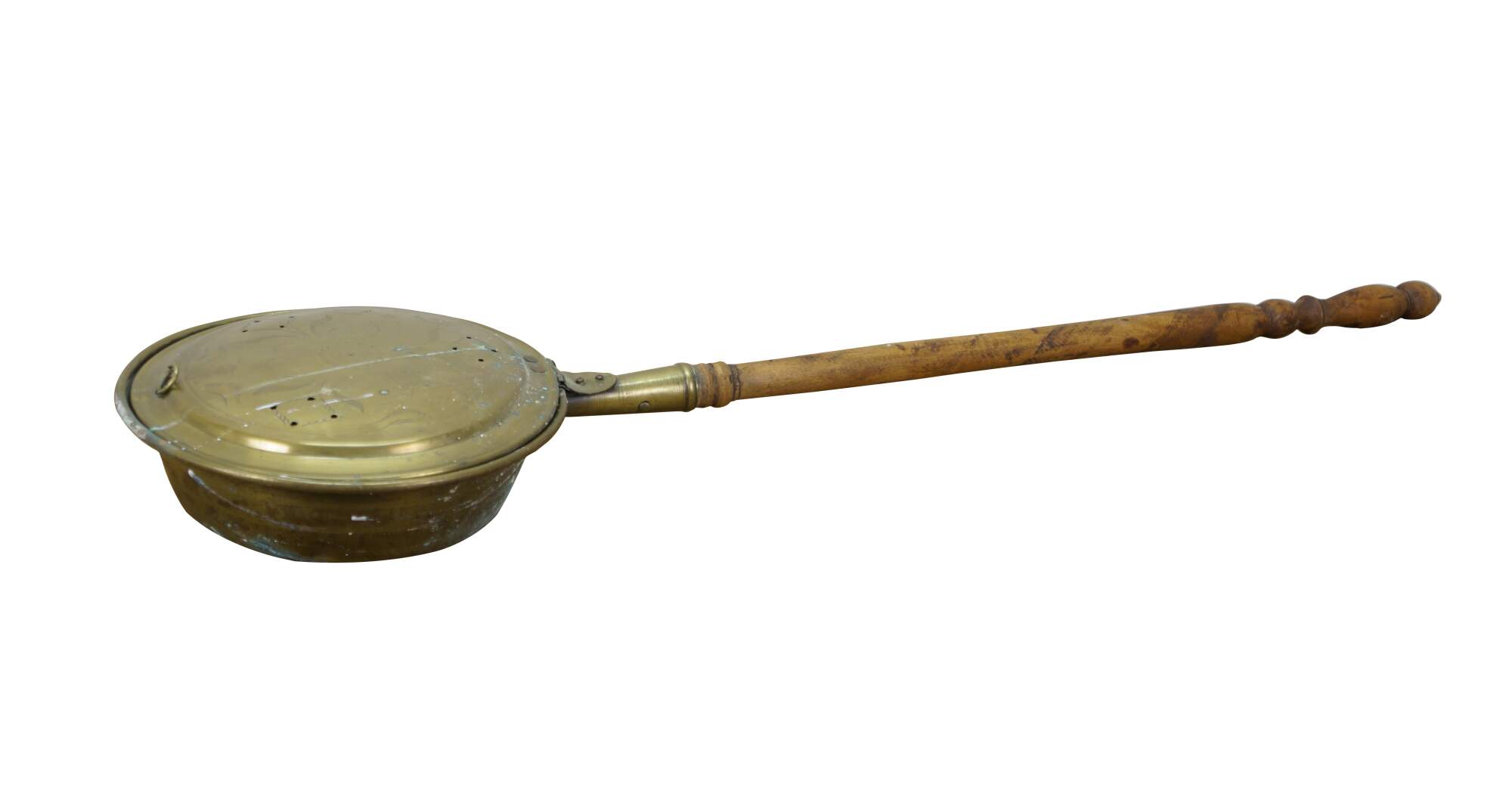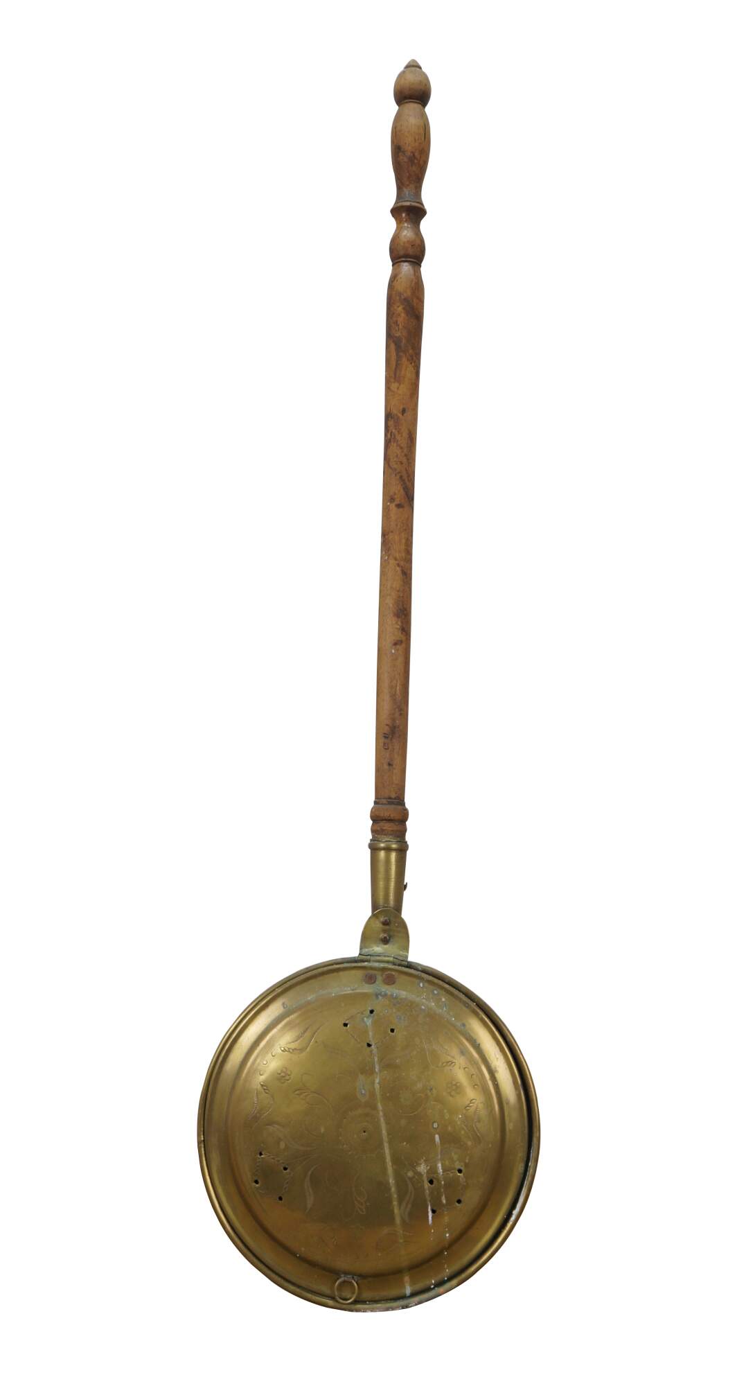 Vintage round brass bed warmer / warming pan with flip top lid etched with a simple floral design and pierced with three sets of ventilation holes. Turned wood handle.