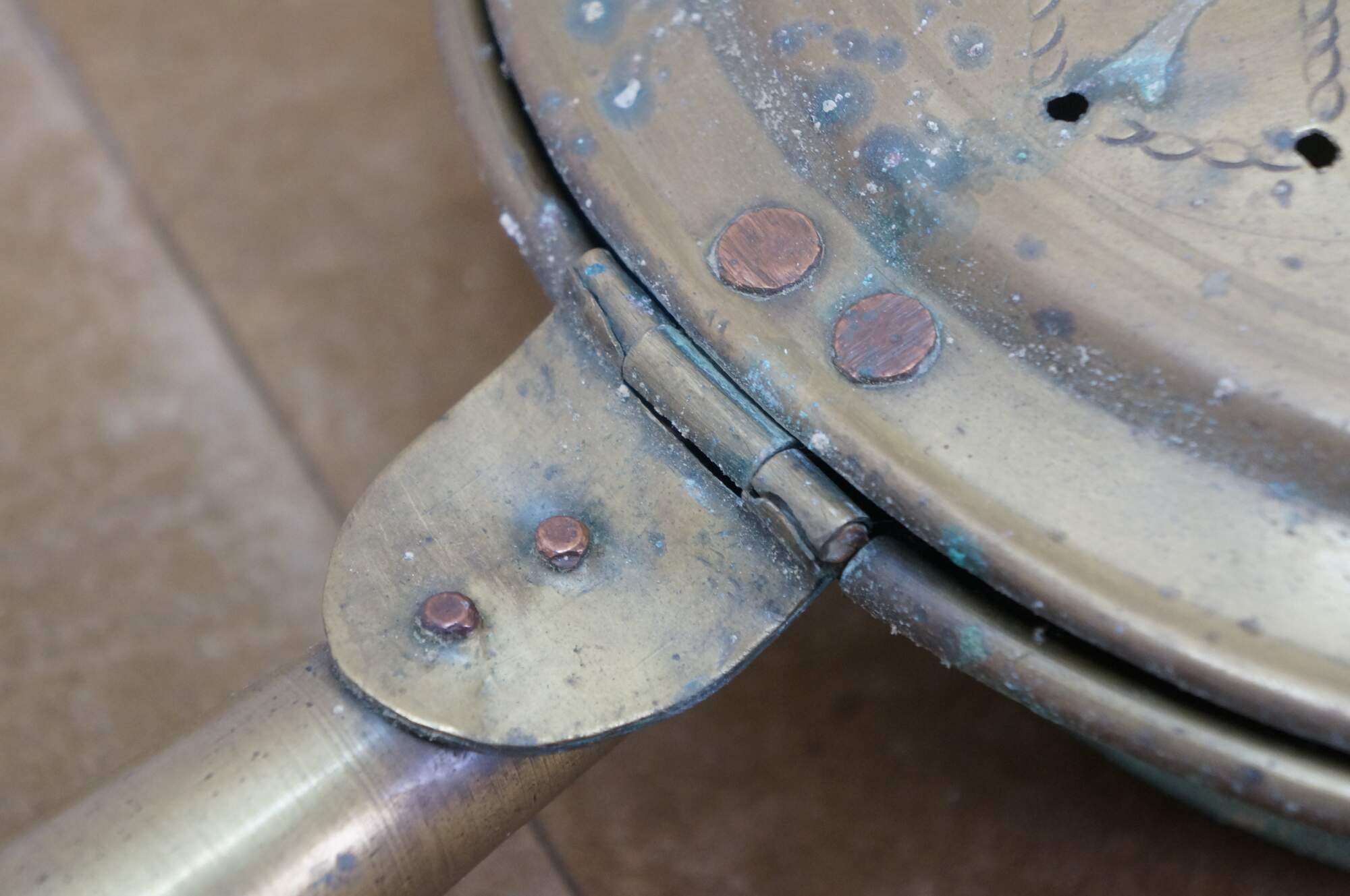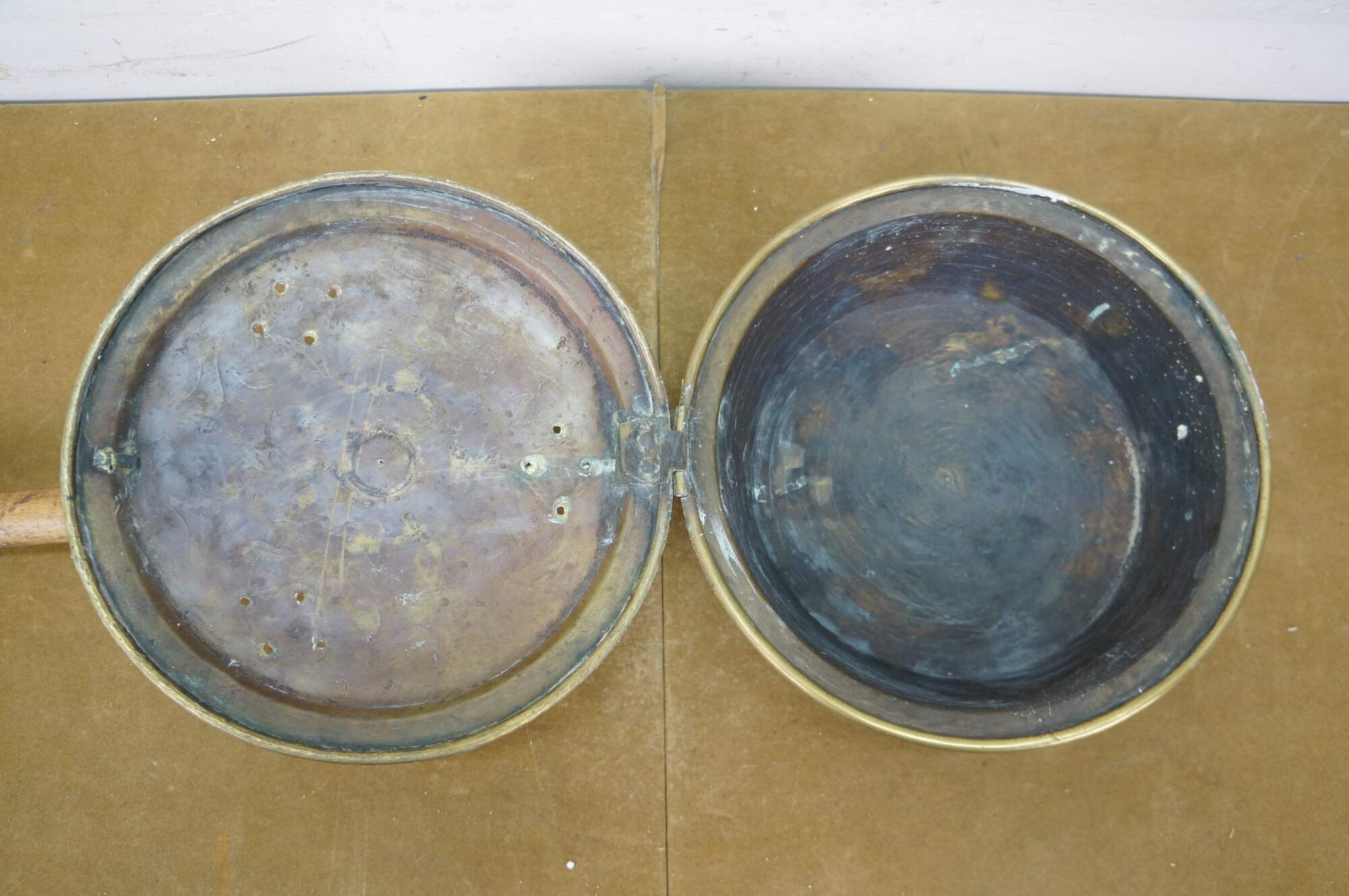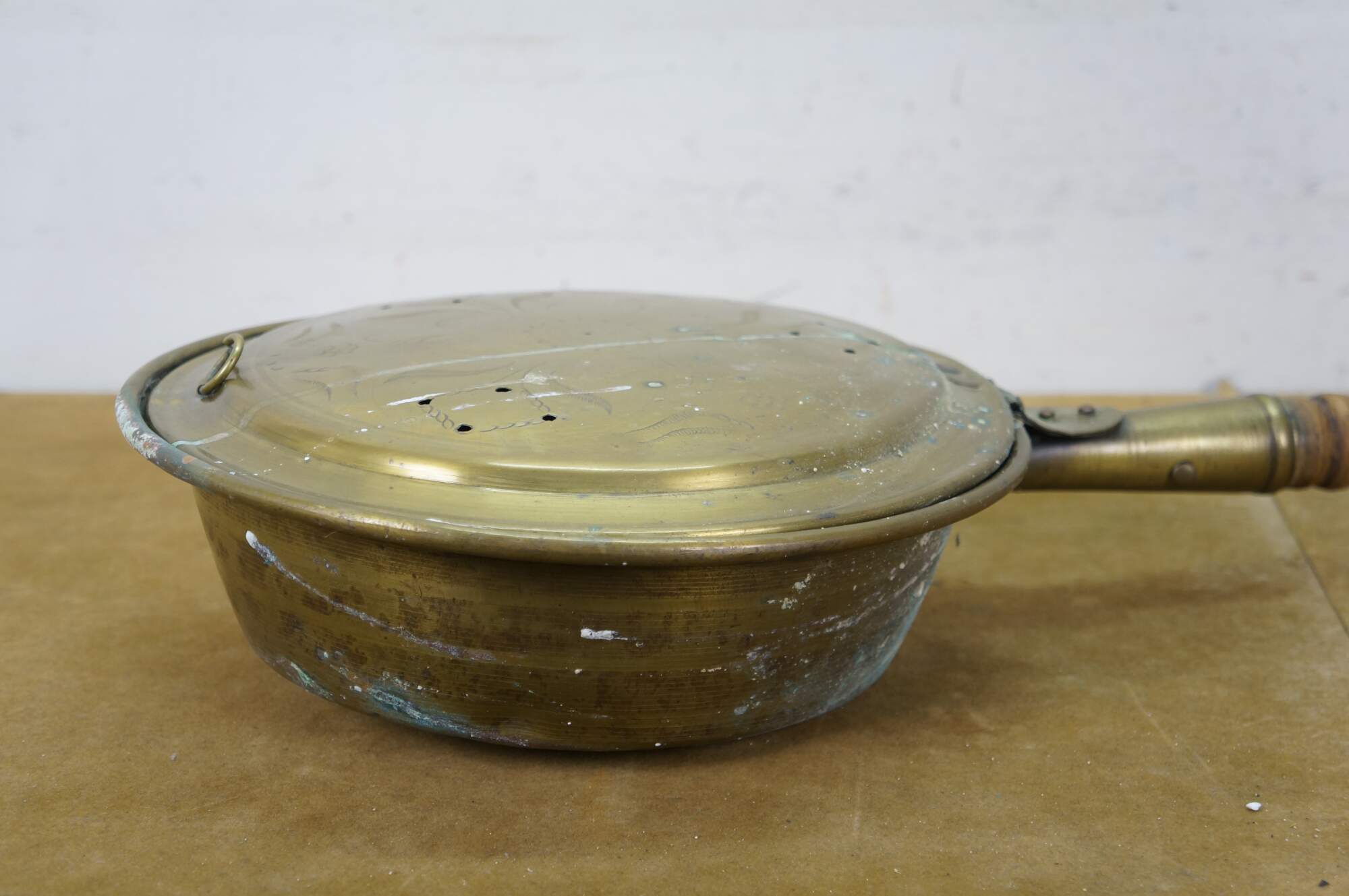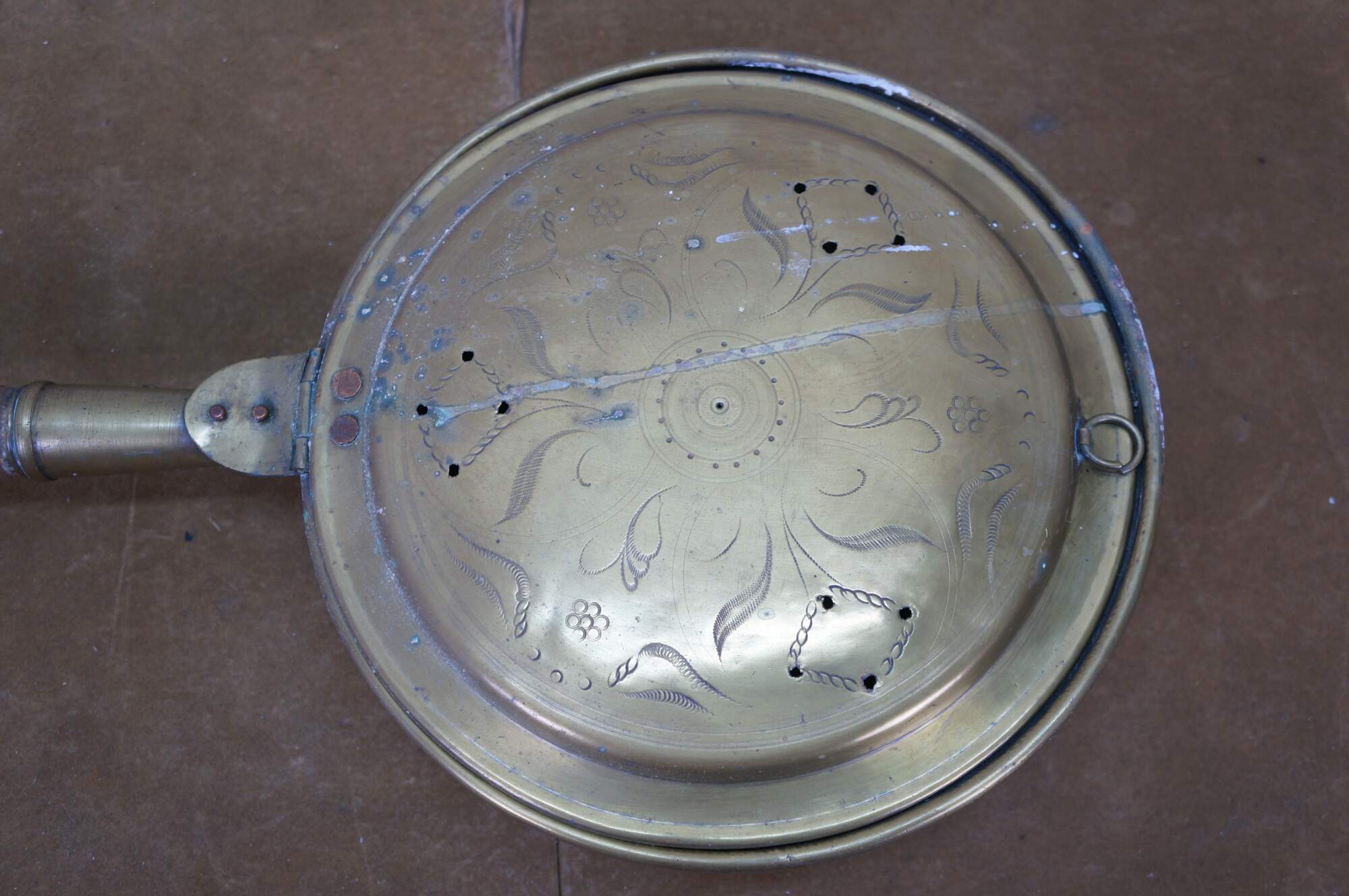 Vintage round brass bed warmer / warming pan with flip top lid etched with a simple floral design and pierced with three sets of ventilation holes. Turned wood handle.