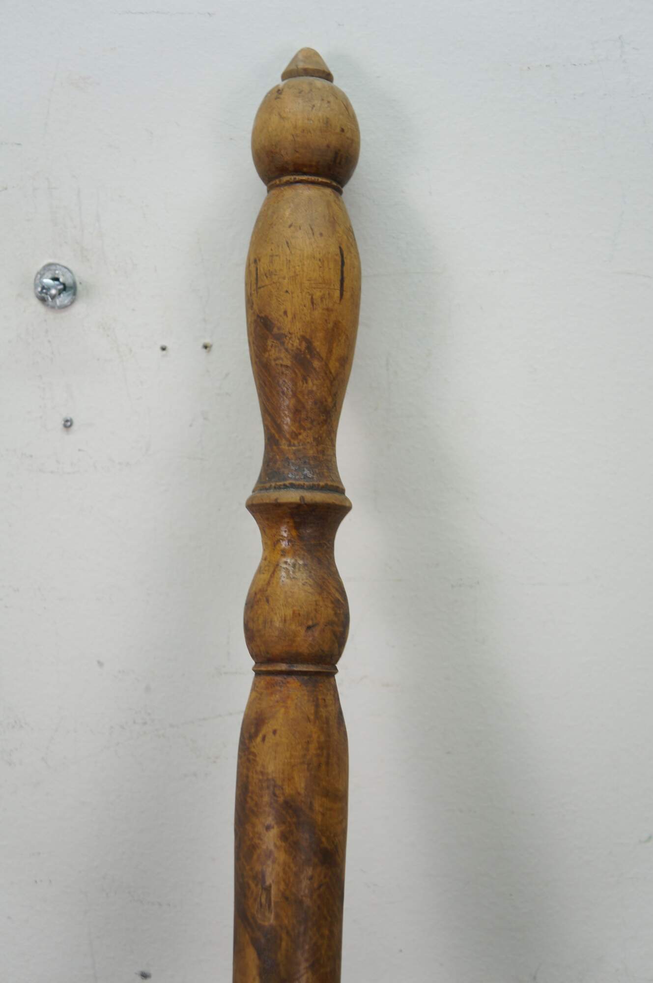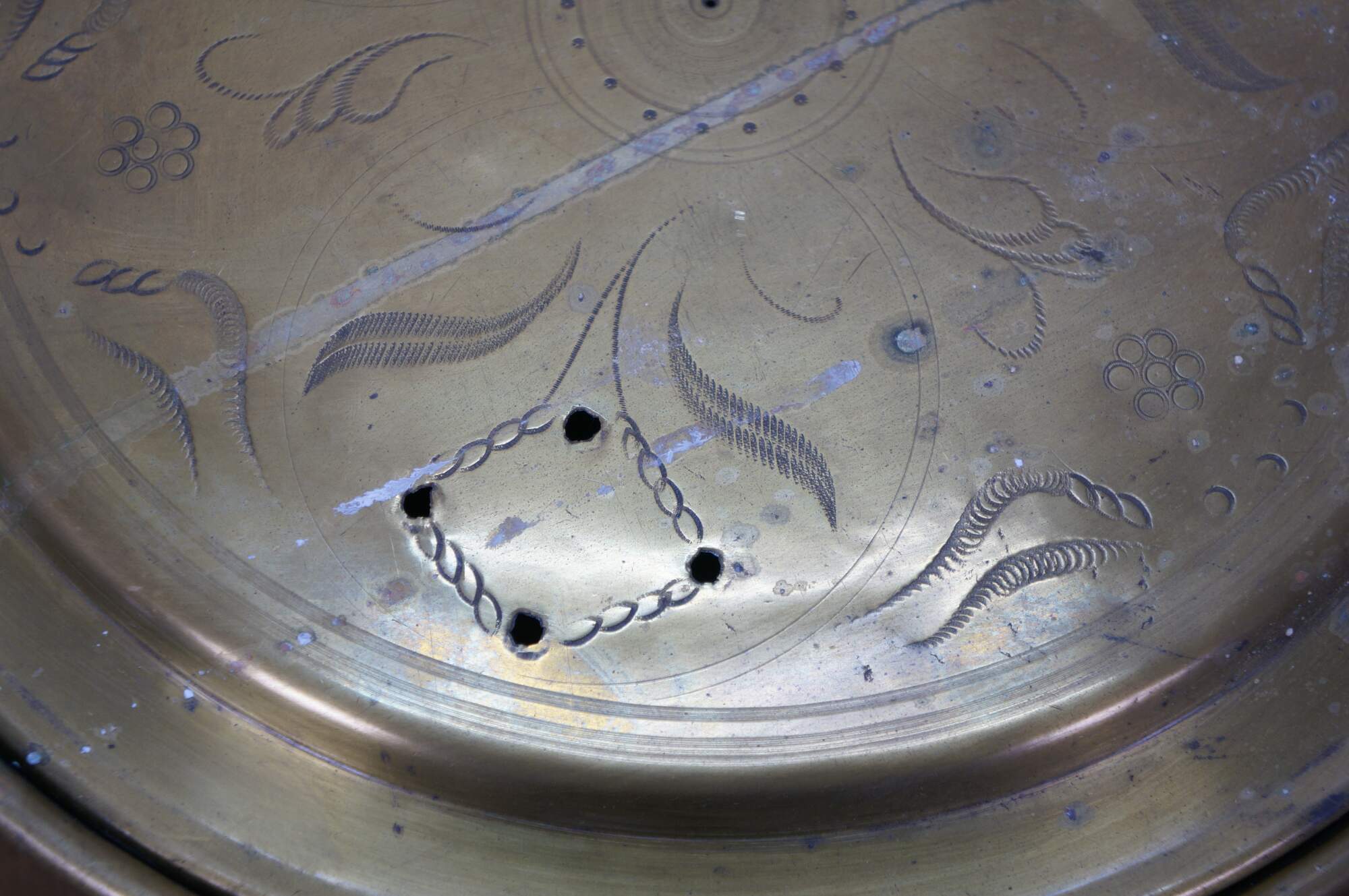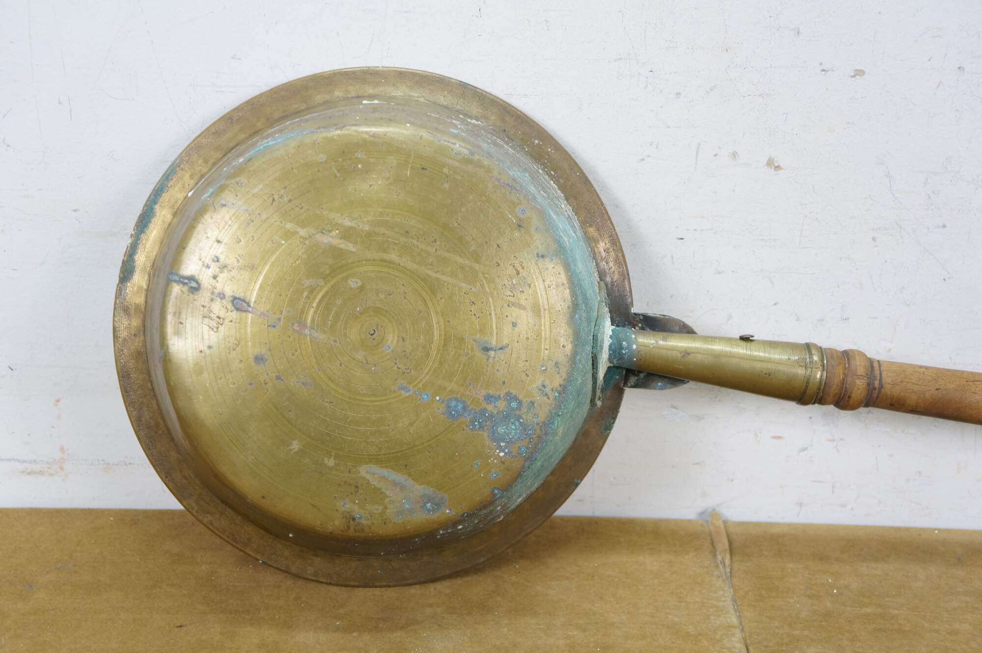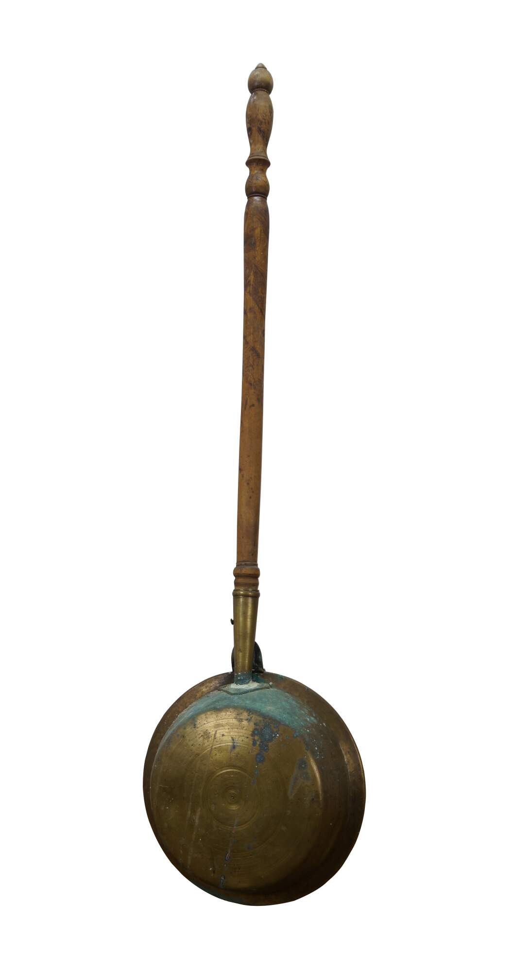 Vintage round brass bed warmer / warming pan with flip top lid etched with a simple floral design and pierced with three sets of ventilation holes. Turned wood handle.