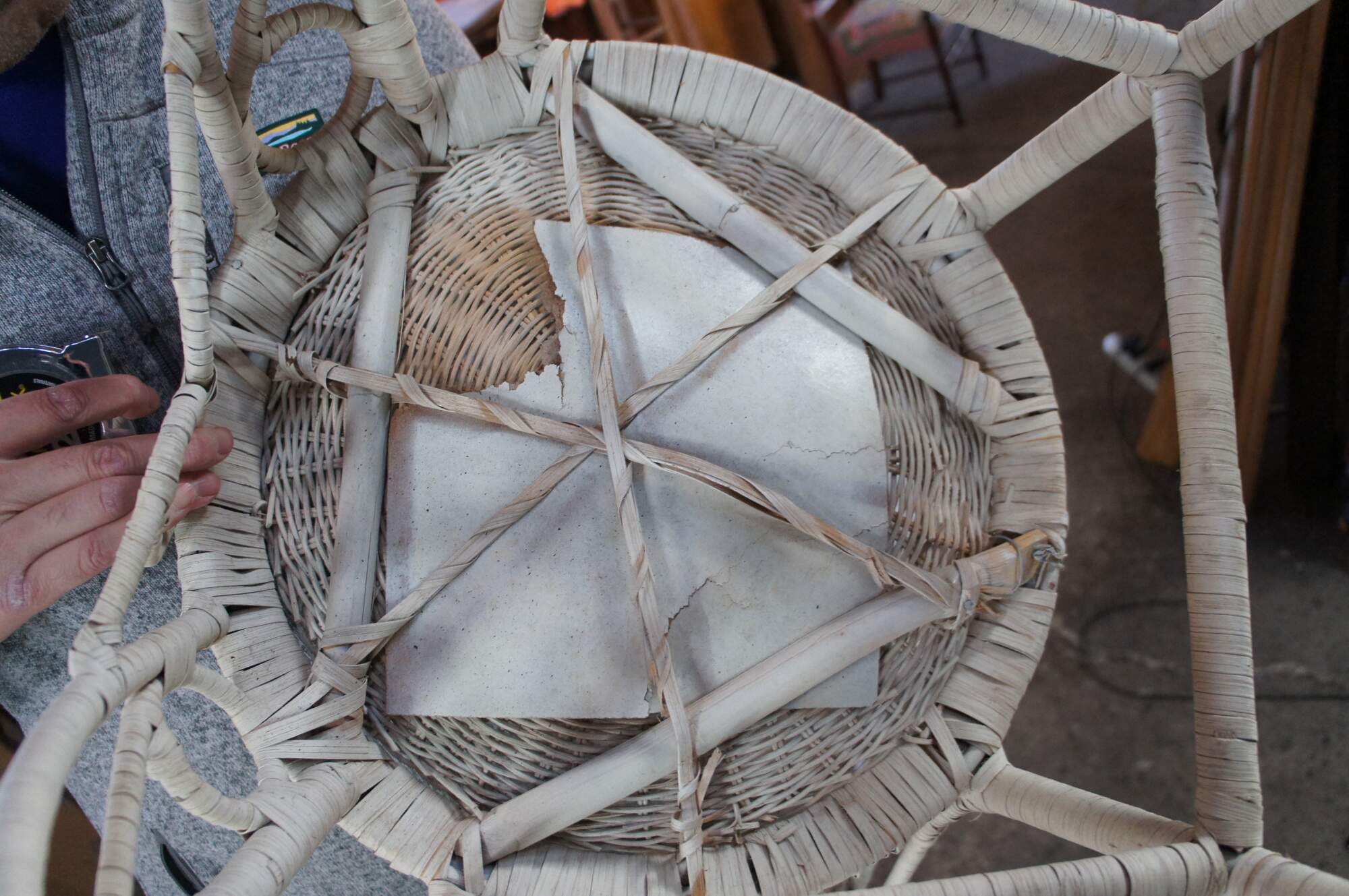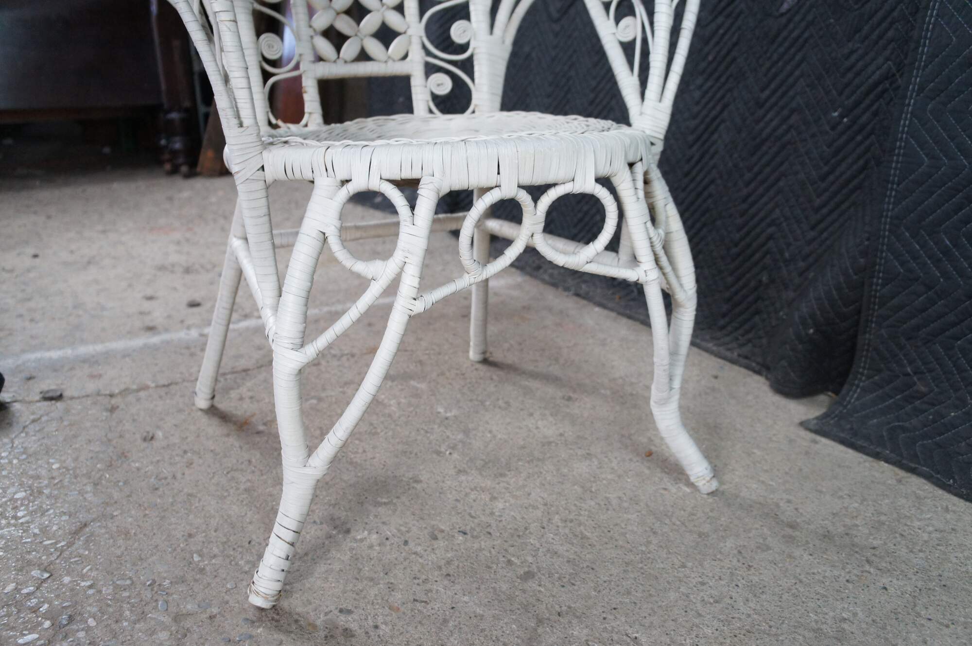 Antique Victorian woven wicker / rattan arm chair featuring a reticulated Peacock / fan back design with scrolled and beaded accents.