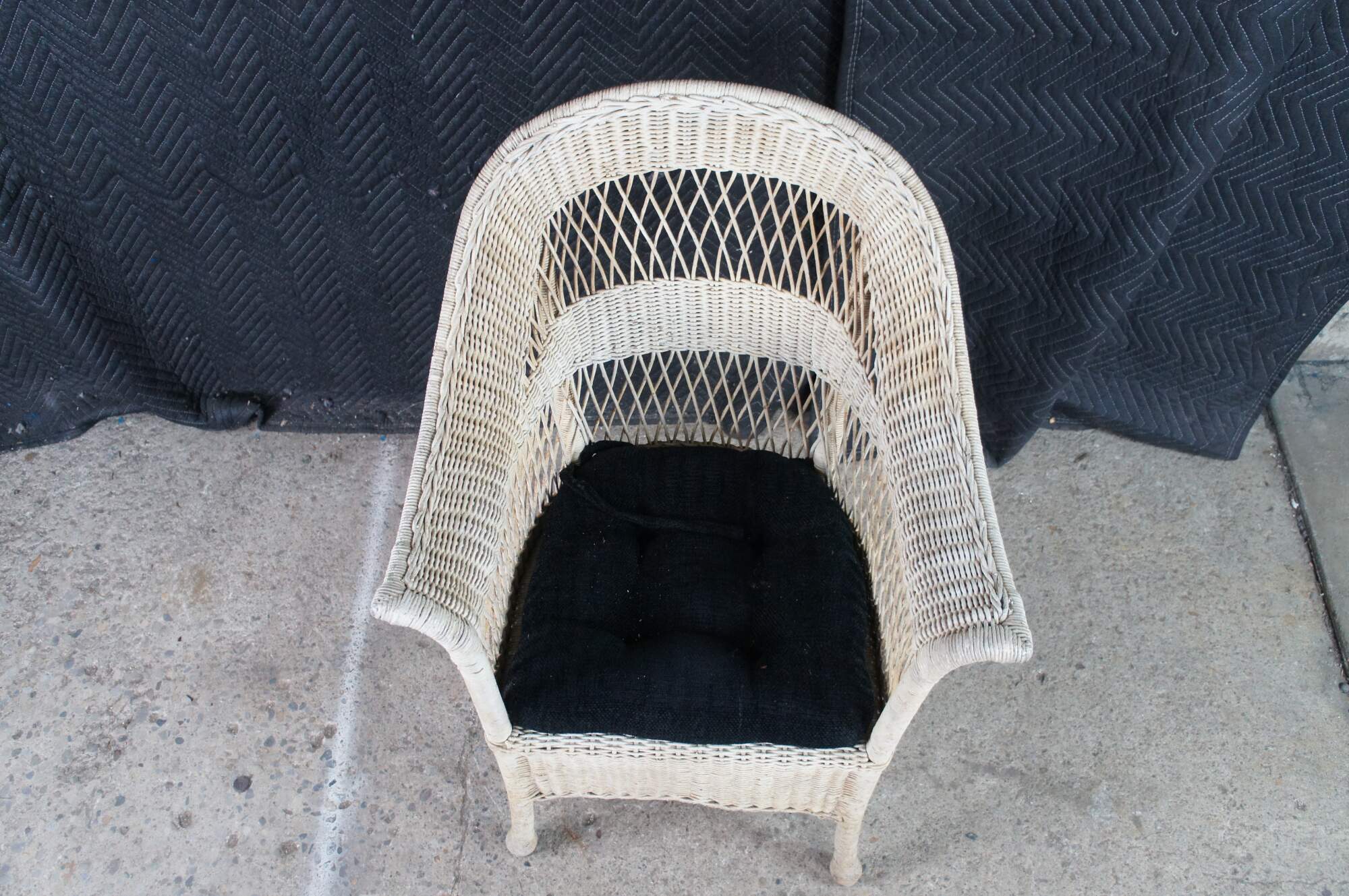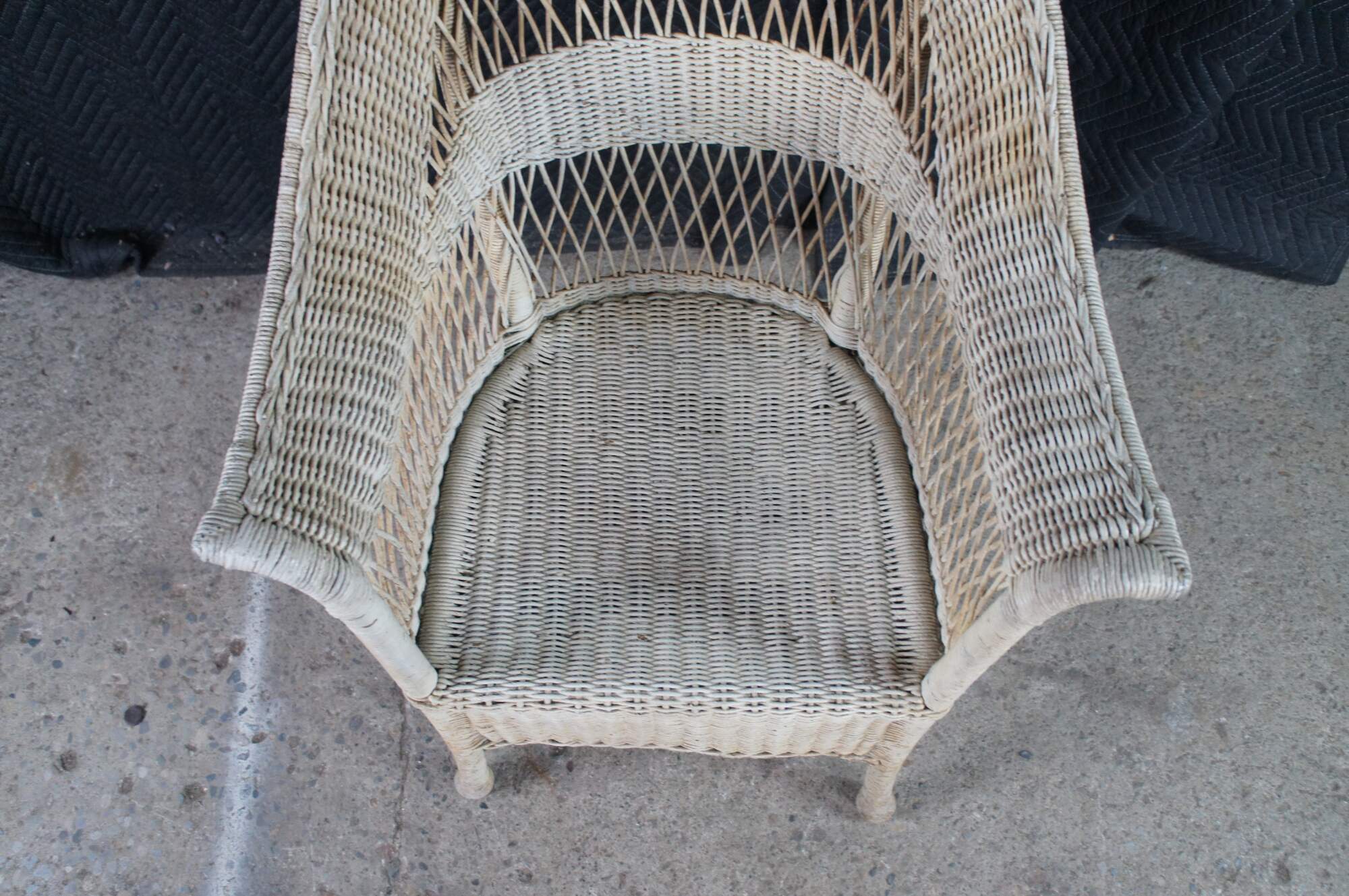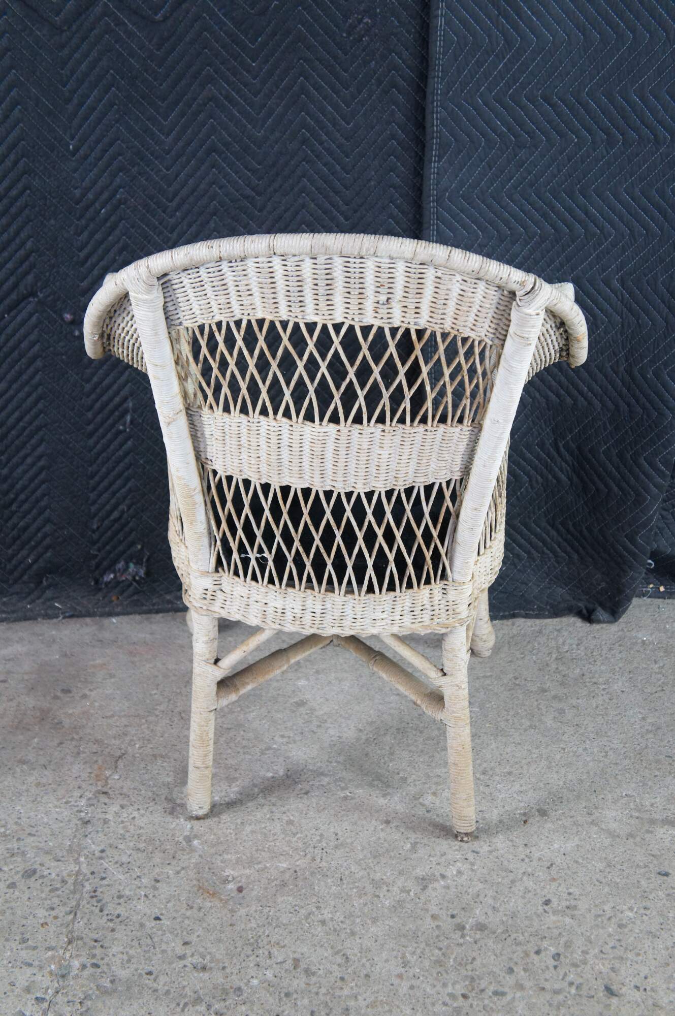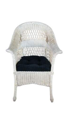 Antique woven wicker / rattan arm chair featuring a reticulated fan back design with flared arms and skirted front.