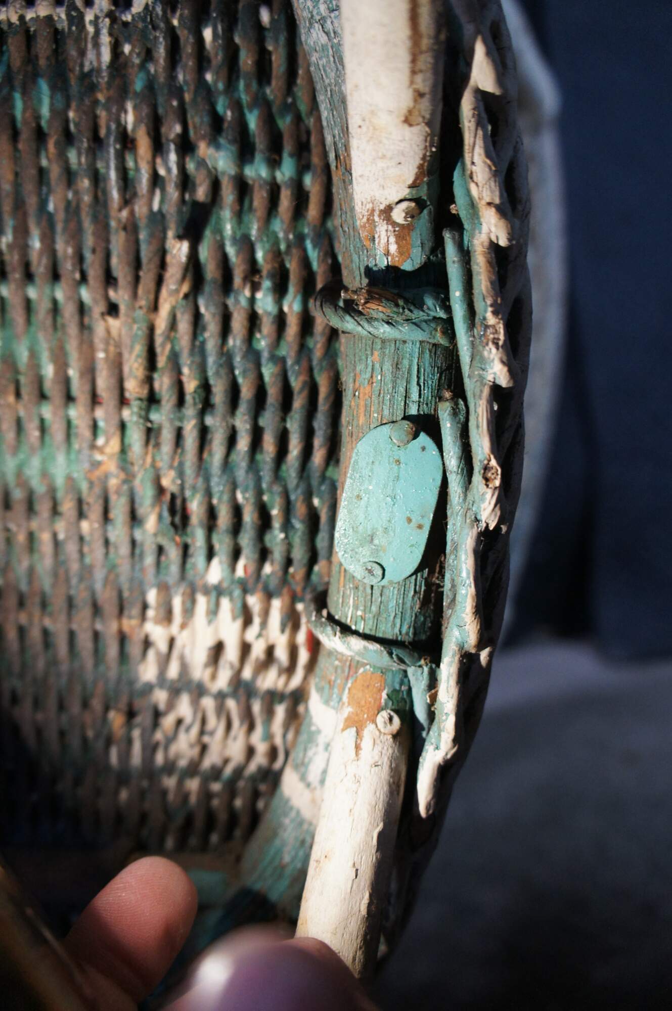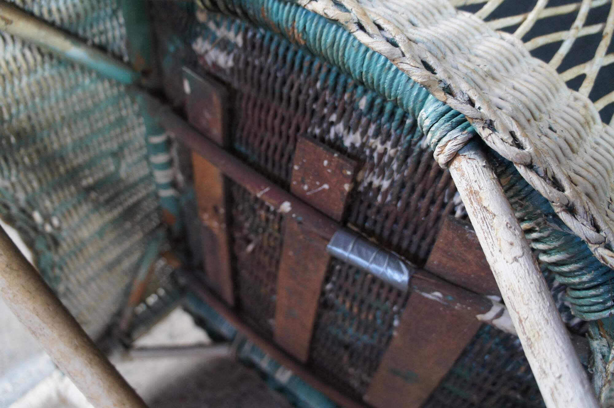 Structurally solid, older repaint with heavy distressing, fading, paint loss, finish loss, cracked support on base repaired with duct tape.