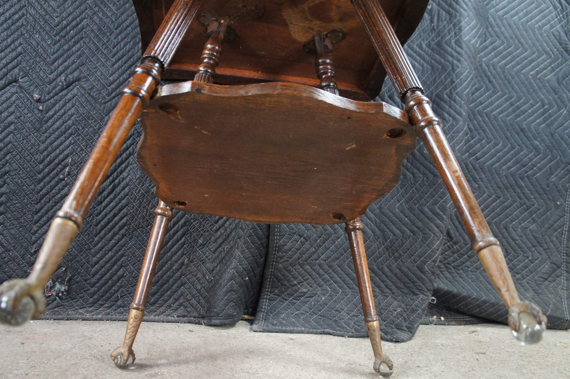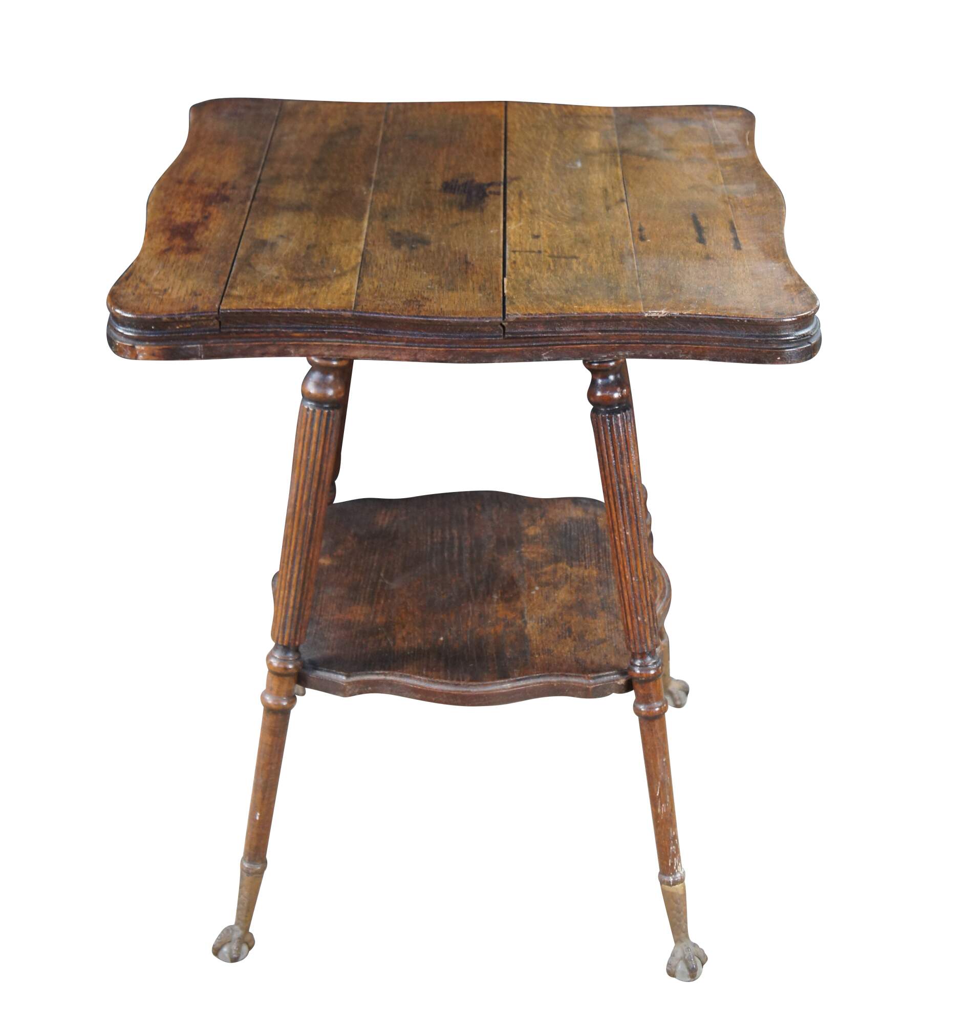 Antique Victorian Eastlake style parlor center pedestal table. Made of quartersawn oak featuring two tiers with serpentine accents connected by long turned and fluted legs with brass eagle claw and ball feet.