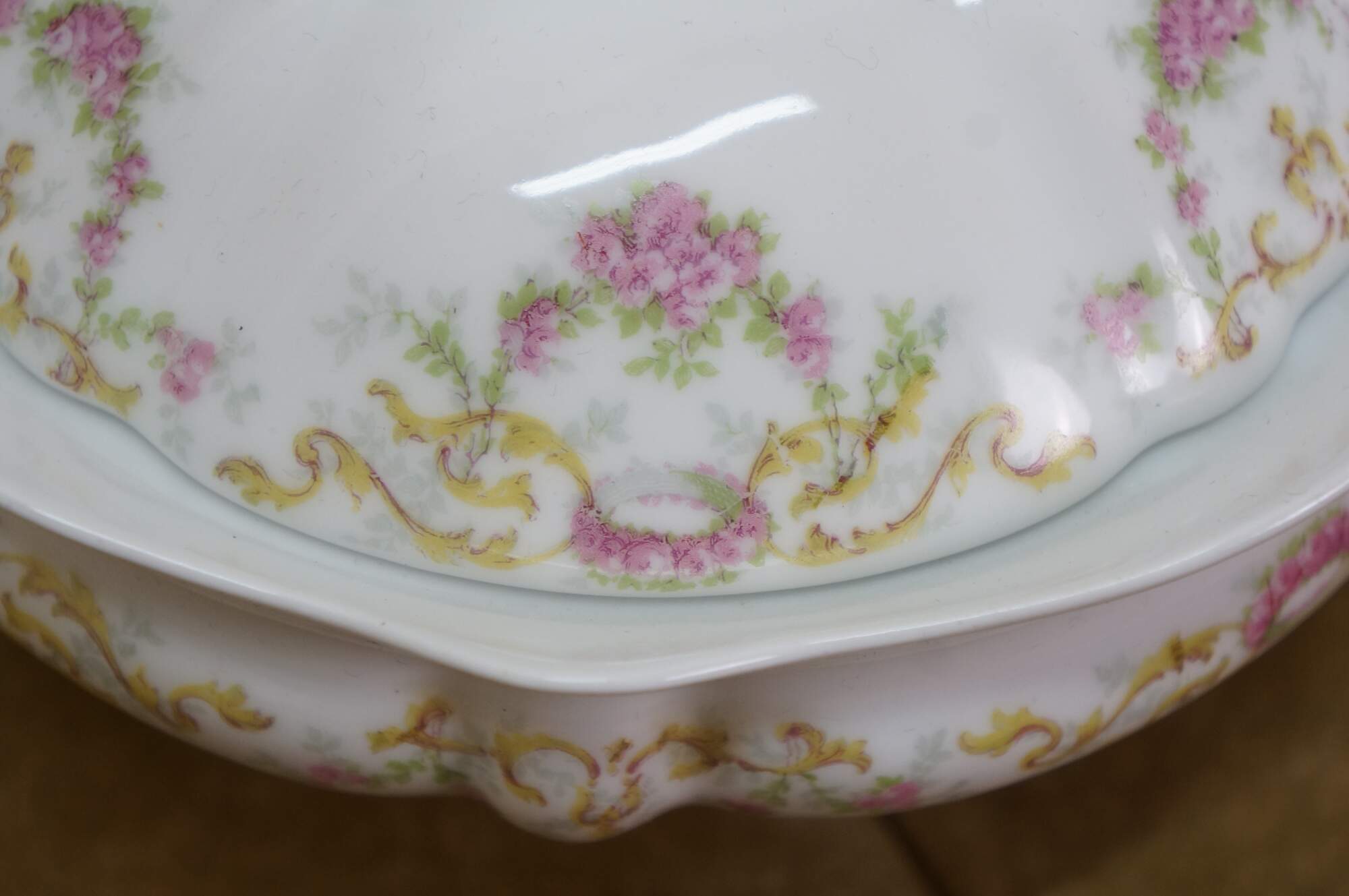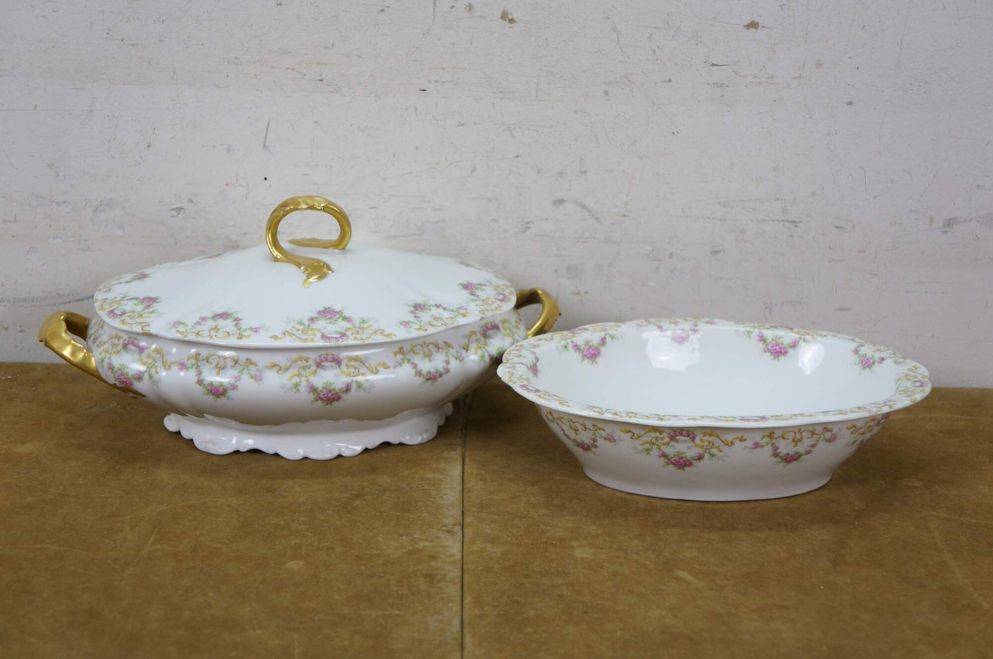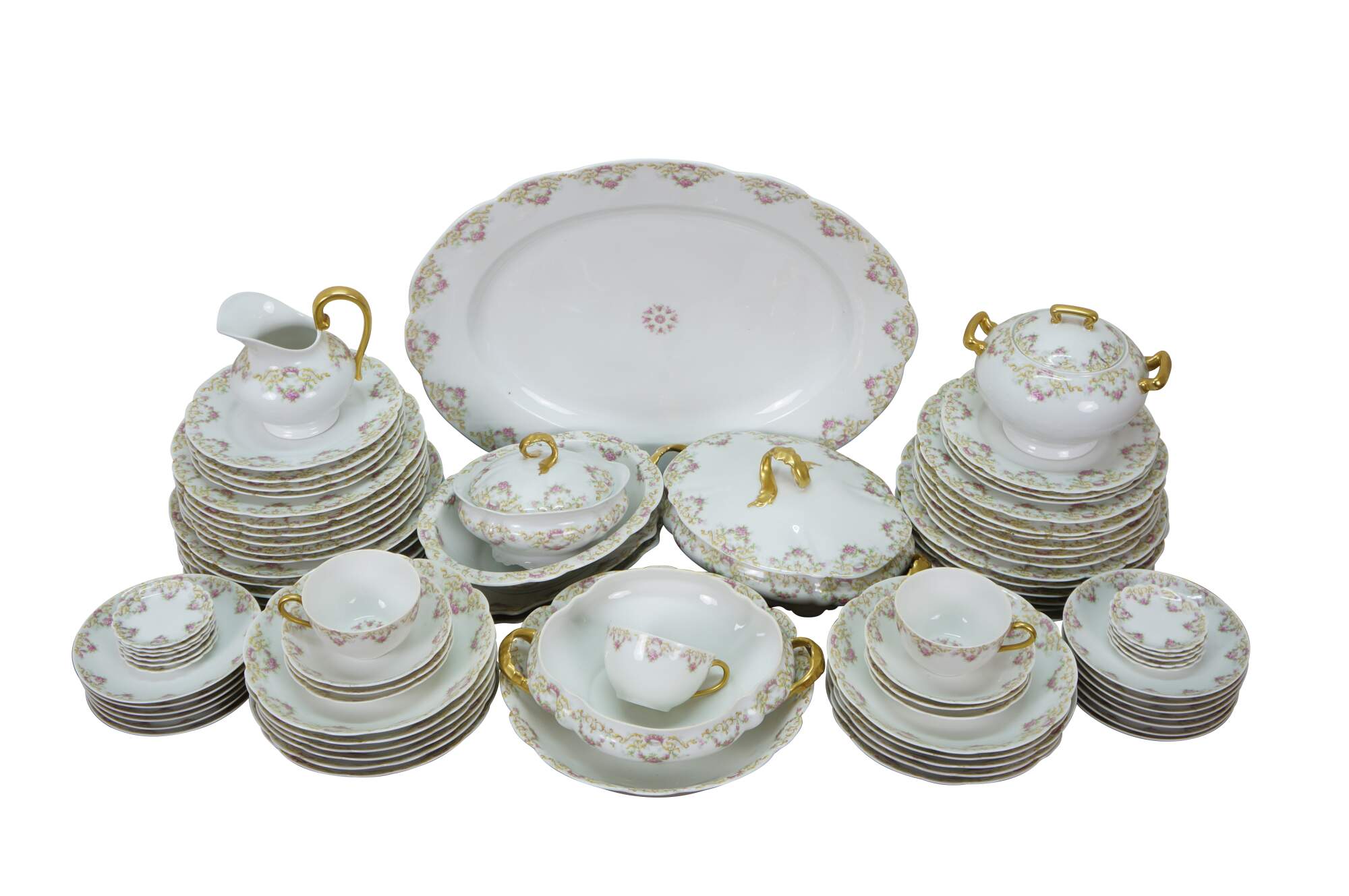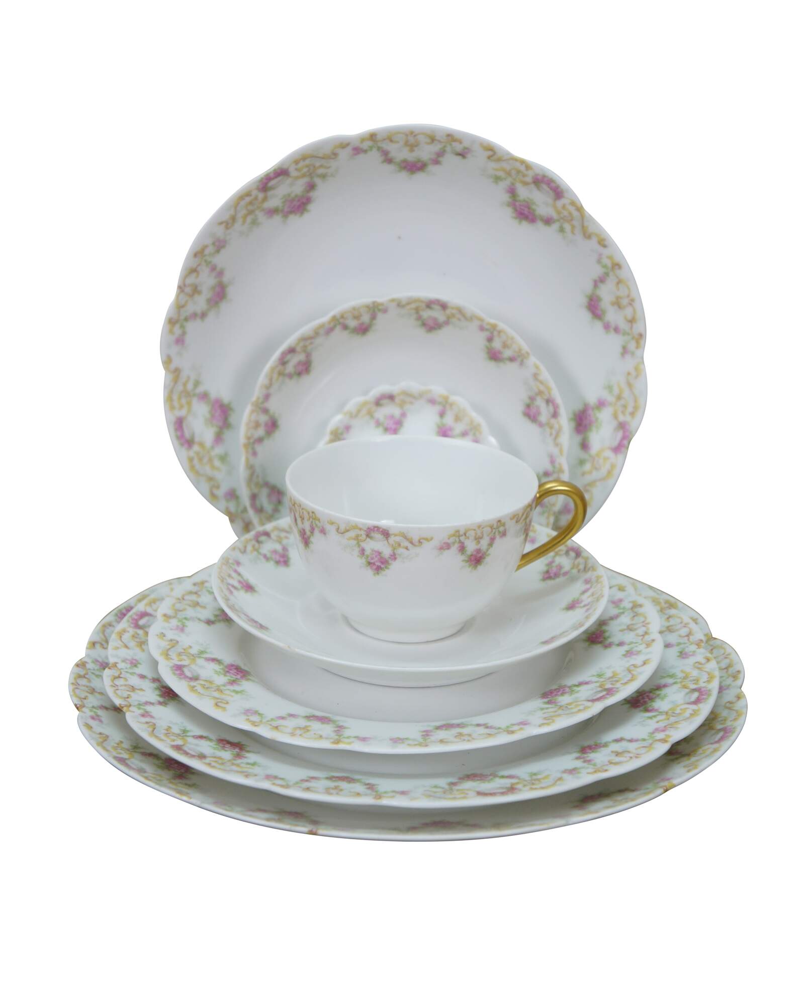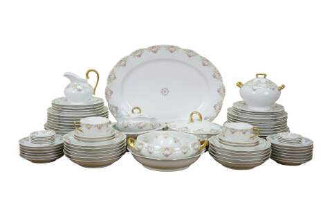 Vintage 20th century 89 piece set of porcelain dinnerware by T&V aka Tressemaines & Vogt. White porcelain with scalloped edges and a printed pattern of golden foliate swags and garlands of pink roses with a matching garland medallion at the center; gilt handles. Set includes: Oval Platter, Lidded Oval Dish, Handled Serving Bowl, Oval Serving Bowl, Round Serving Bowl, 2 Oval Serving Plates, 12 Dinner Plates, 12 Salad Plates; 7 Bread Plates; 11 Soup Bowls, 6 Custard Dishes, 13 Saucers, Lidded Sugar Bowl, 3 Pc Butter Bowl, Creamer, 3 Teacups, 11 Bone Dishes.