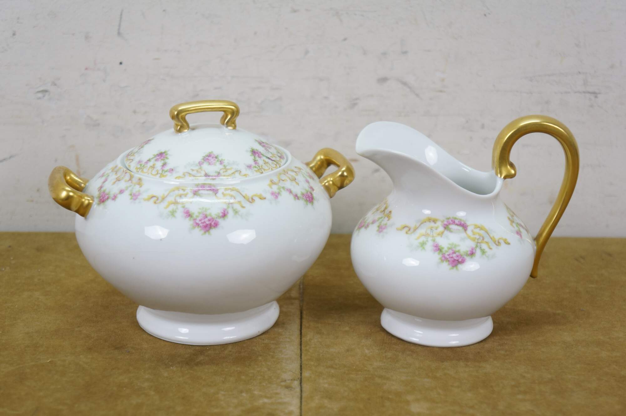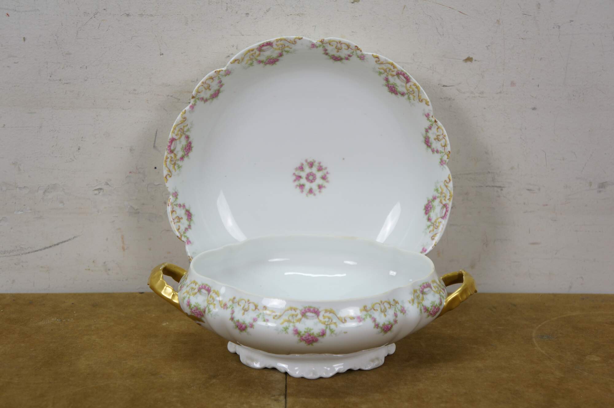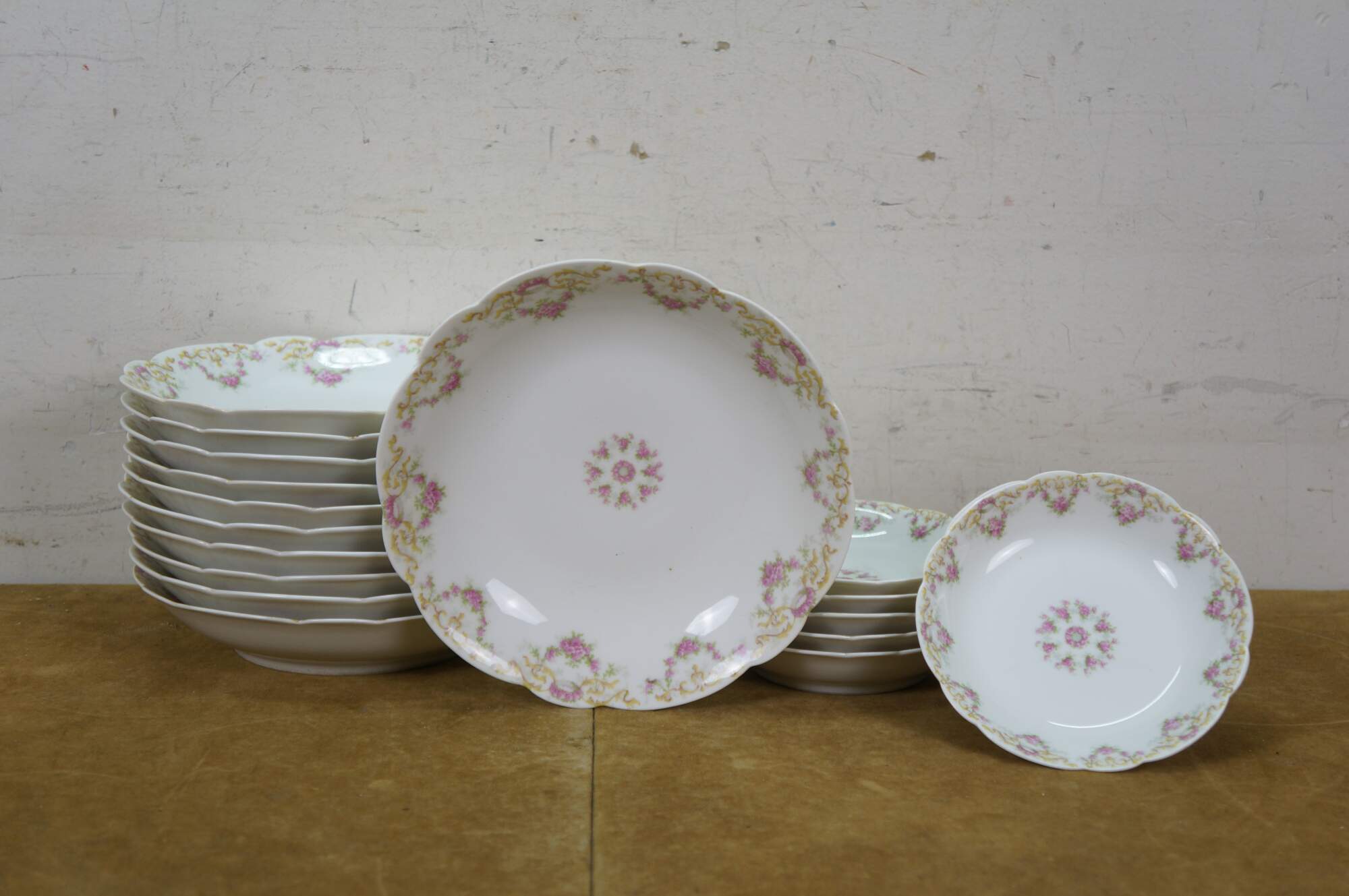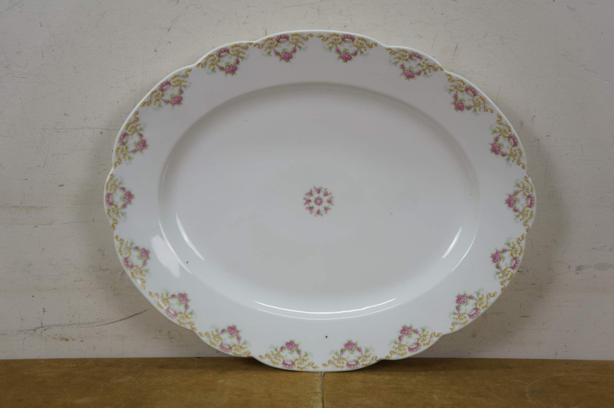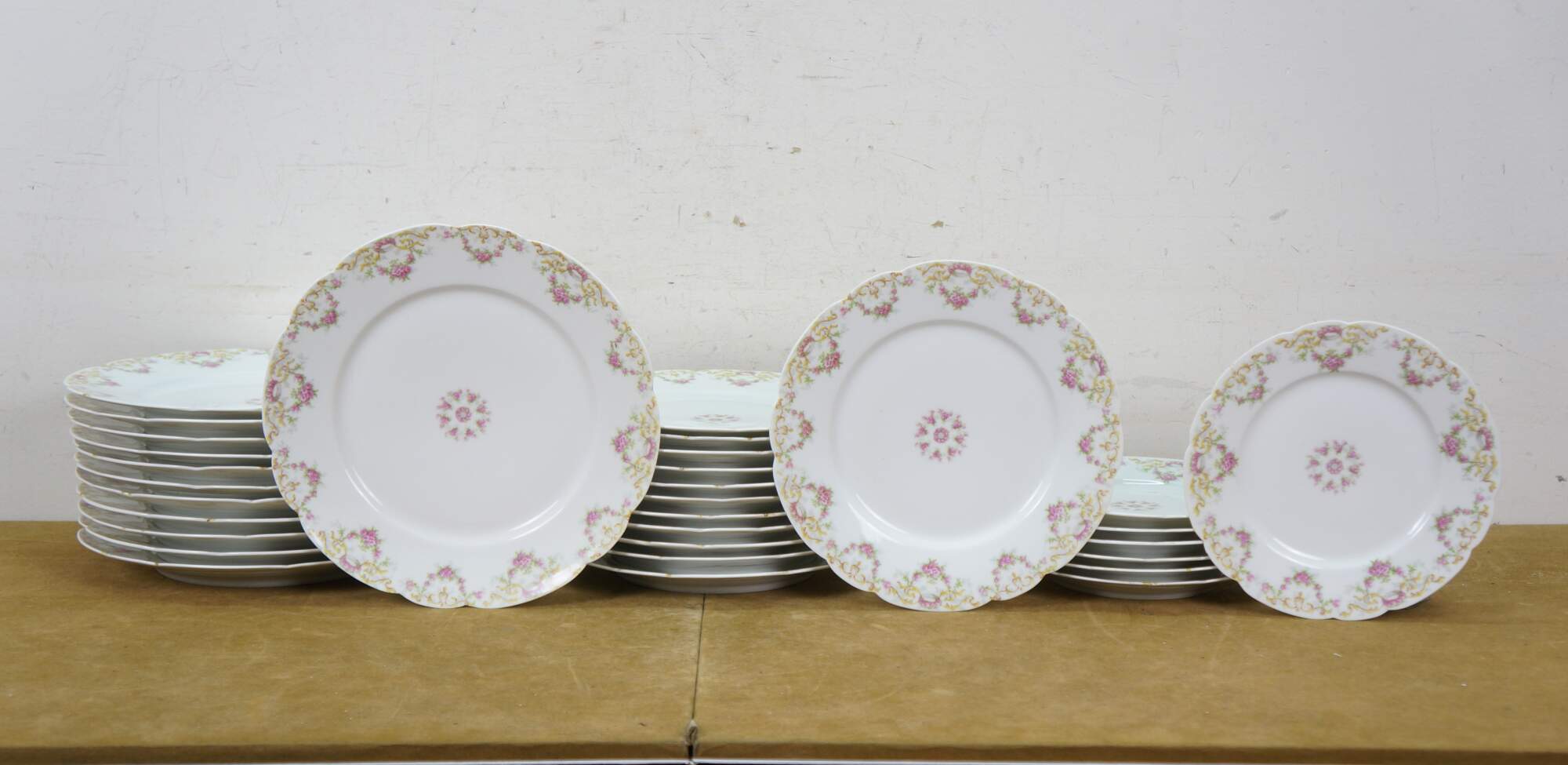 Vintage 20th century 89 piece set of porcelain dinnerware by T&V aka Tressemaines & Vogt. White porcelain with scalloped edges and a printed pattern of golden foliate swags and garlands of pink roses with a matching garland medallion at the center; gilt handles. Set includes: Oval Platter, Lidded Oval Dish, Handled Serving Bowl, Oval Serving Bowl, Round Serving Bowl, 2 Oval Serving Plates, 12 Dinner Plates, 12 Salad Plates; 7 Bread Plates; 11 Soup Bowls, 6 Custard Dishes, 13 Saucers, Lidded Sugar Bowl, 3 Pc Butter Bowl, Creamer, 3 Teacups, 11 Bone Dishes.