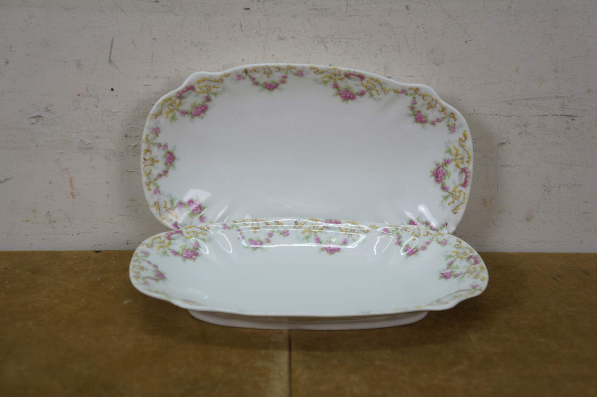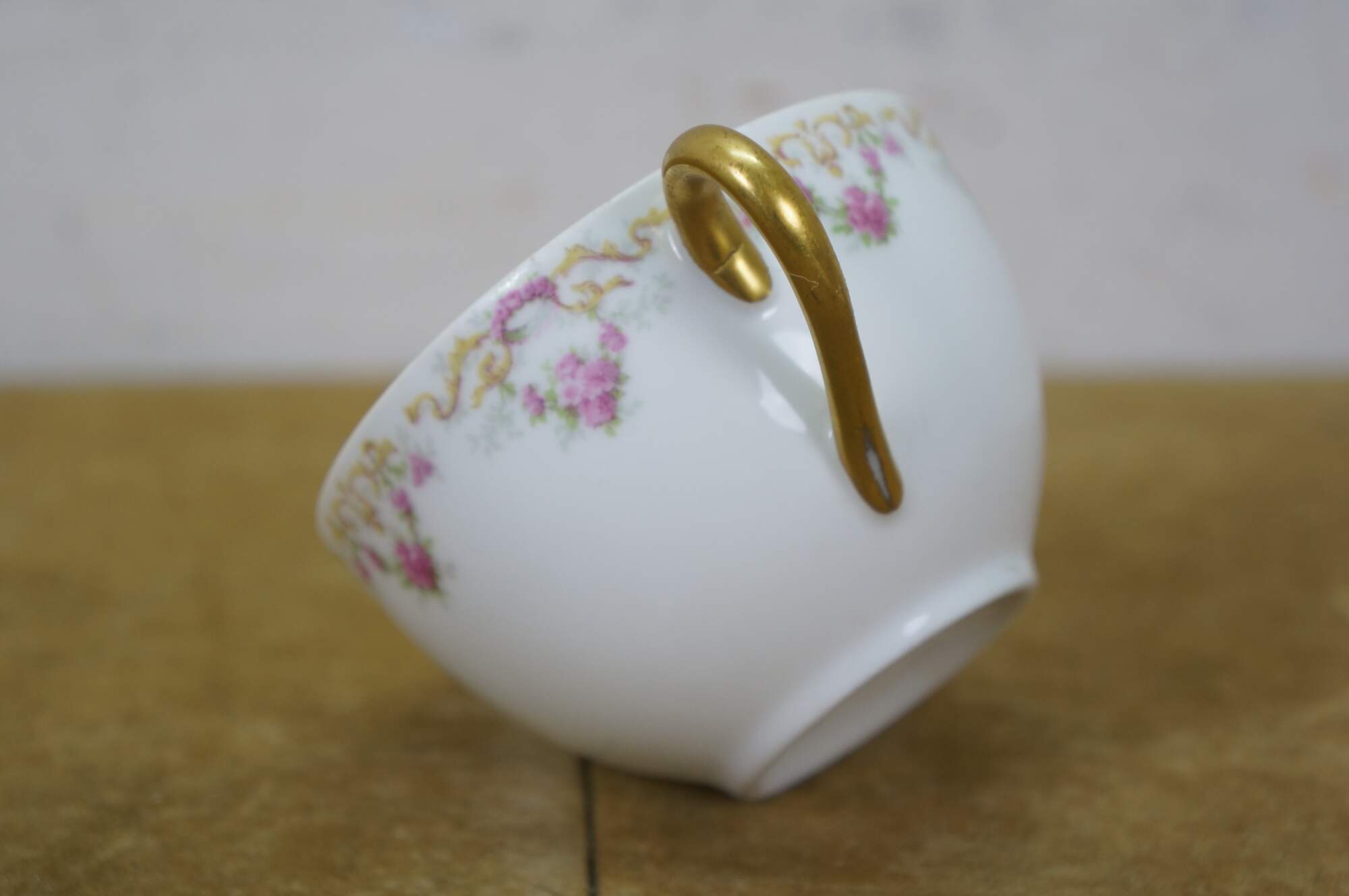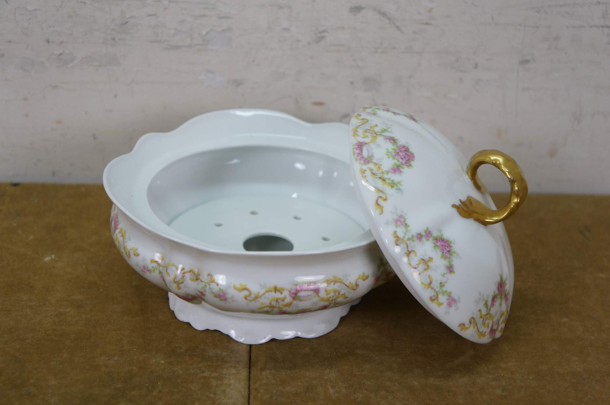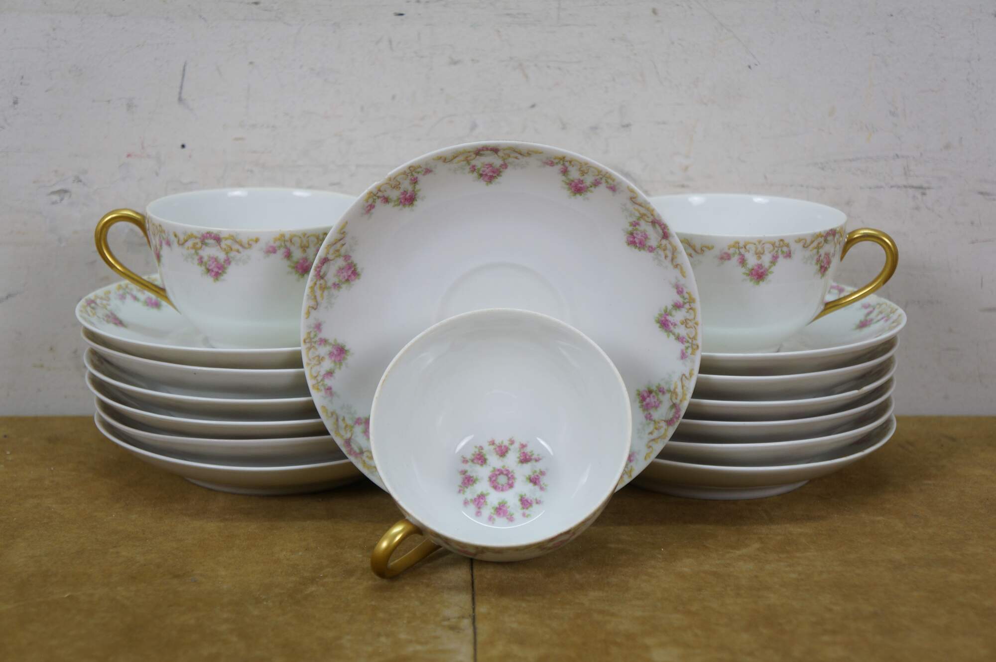 Vintage 20th century 89 piece set of porcelain dinnerware by T&V aka Tressemaines & Vogt. White porcelain with scalloped edges and a printed pattern of golden foliate swags and garlands of pink roses with a matching garland medallion at the center; gilt handles. Set includes: Oval Platter, Lidded Oval Dish, Handled Serving Bowl, Oval Serving Bowl, Round Serving Bowl, 2 Oval Serving Plates, 12 Dinner Plates, 12 Salad Plates; 7 Bread Plates; 11 Soup Bowls, 6 Custard Dishes, 13 Saucers, Lidded Sugar Bowl, 3 Pc Butter Bowl, Creamer, 3 Teacups, 11 Bone Dishes.
