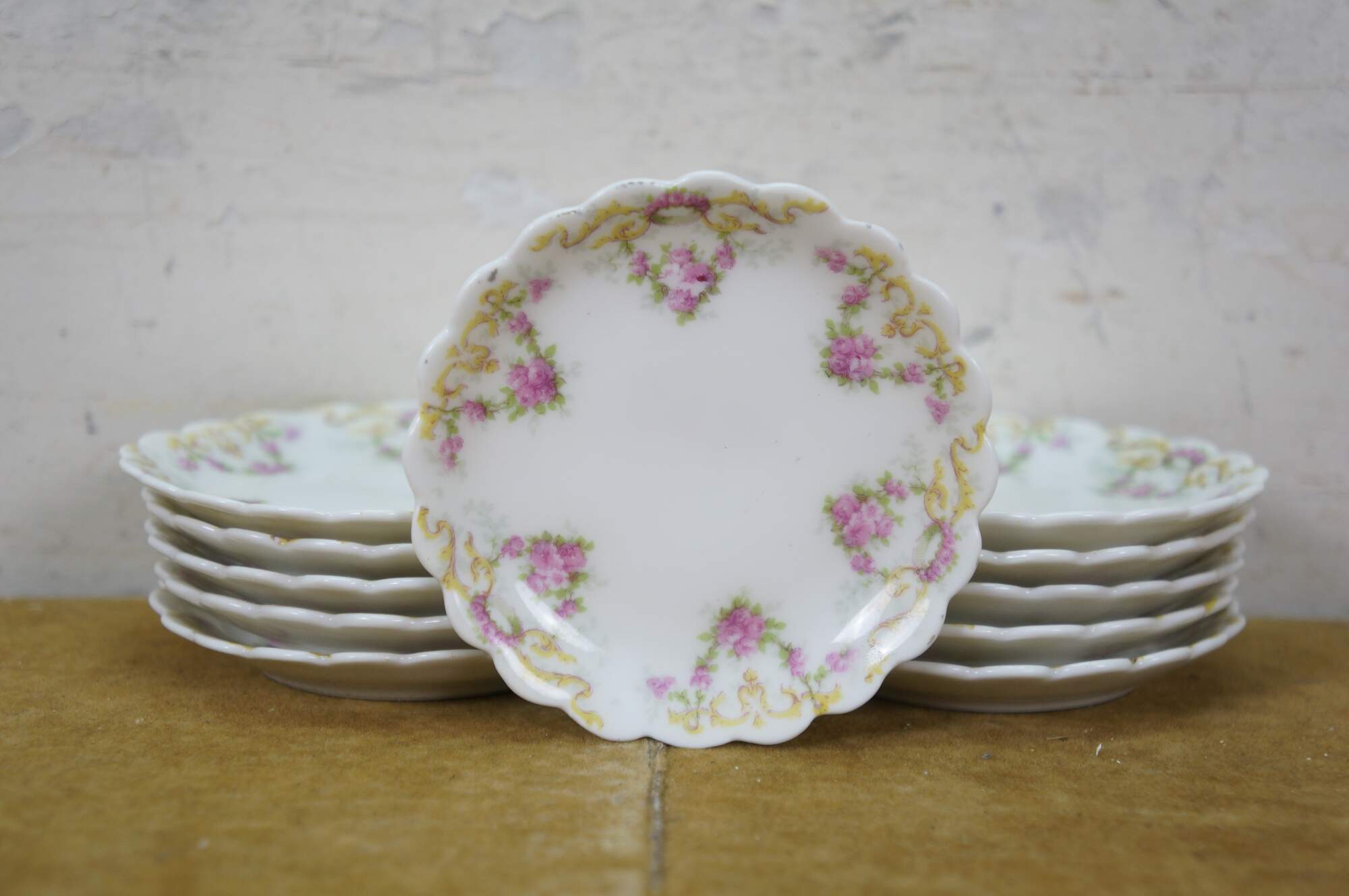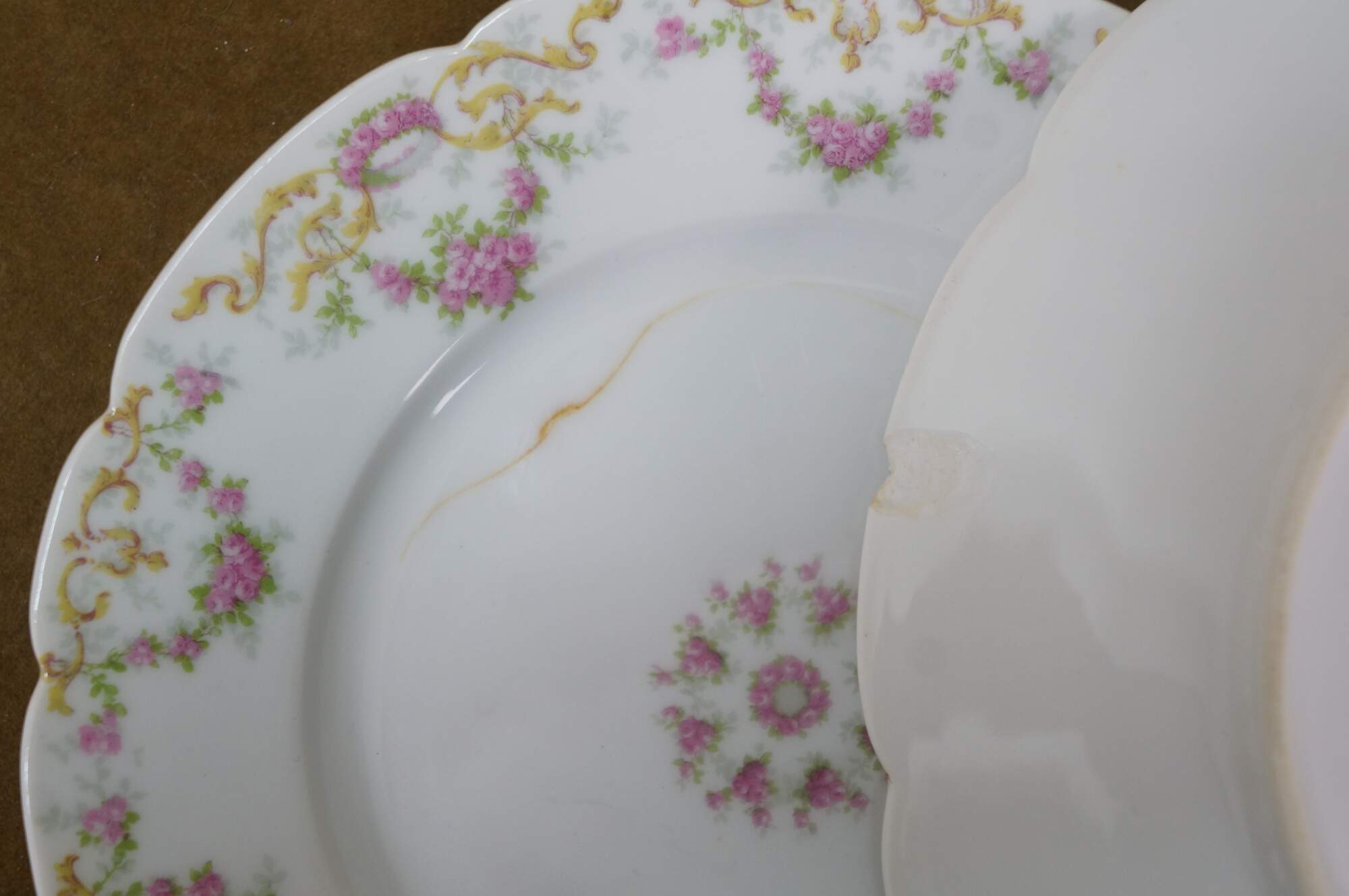 Good Overall - Chips on 3 salad pates, 2 bread plates, 1 soup bowl base, 3 saucers, platter base; small cracks, 2 bread plates, 1 custard dish
