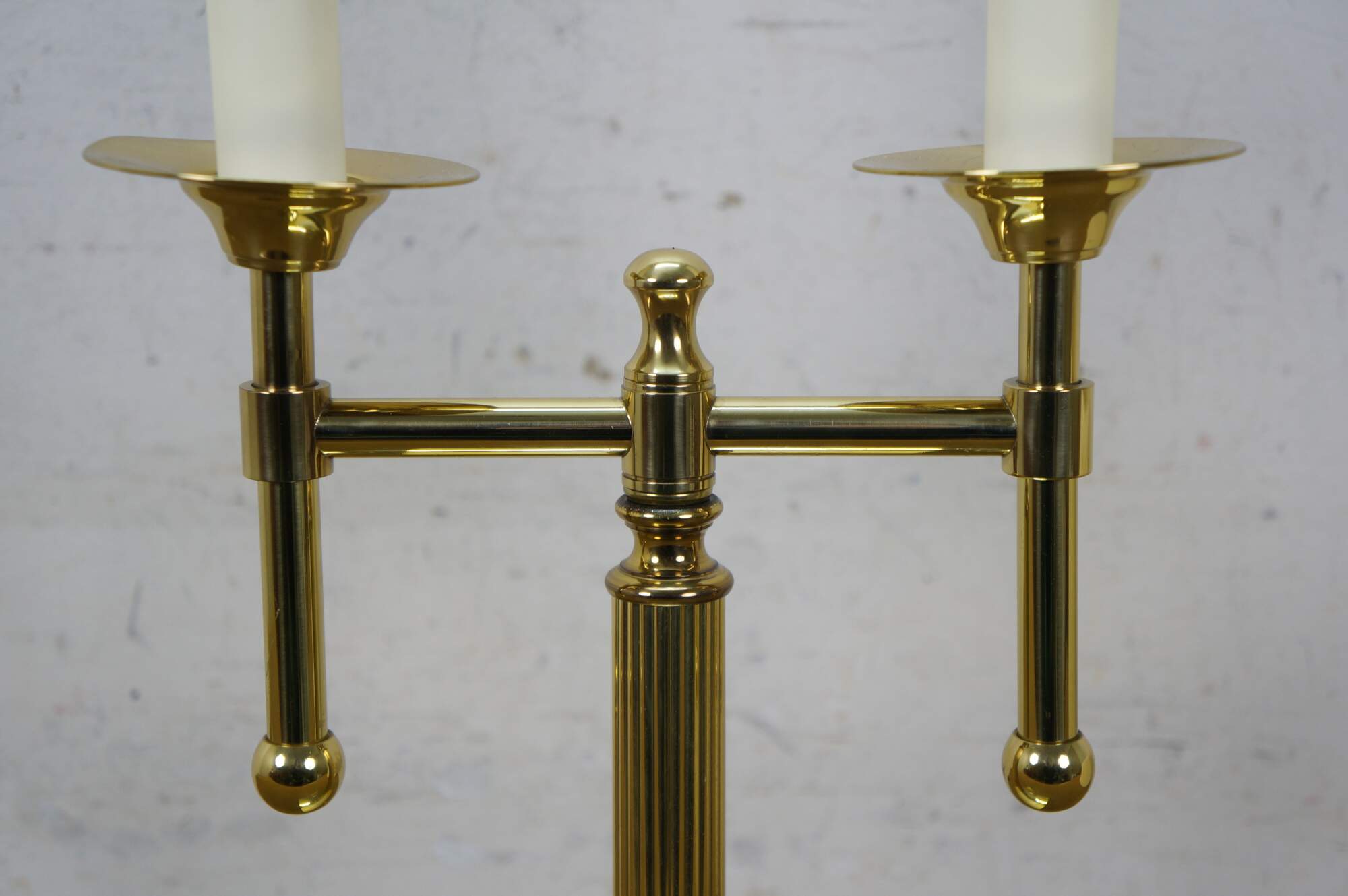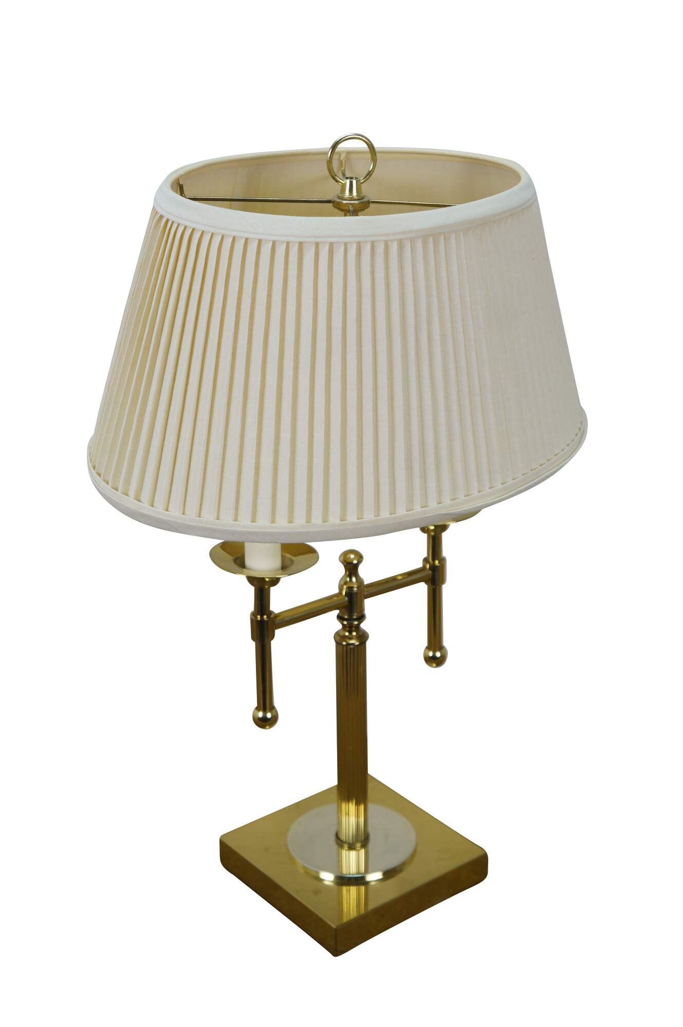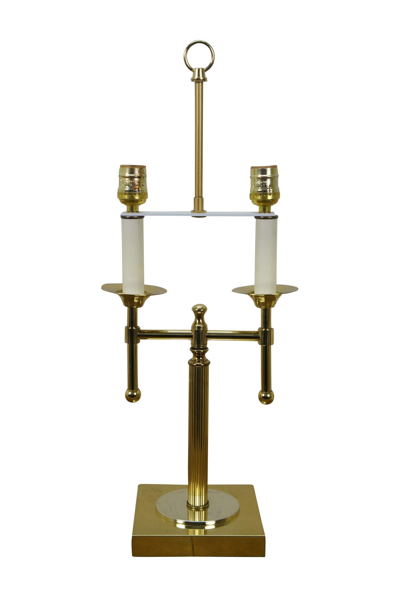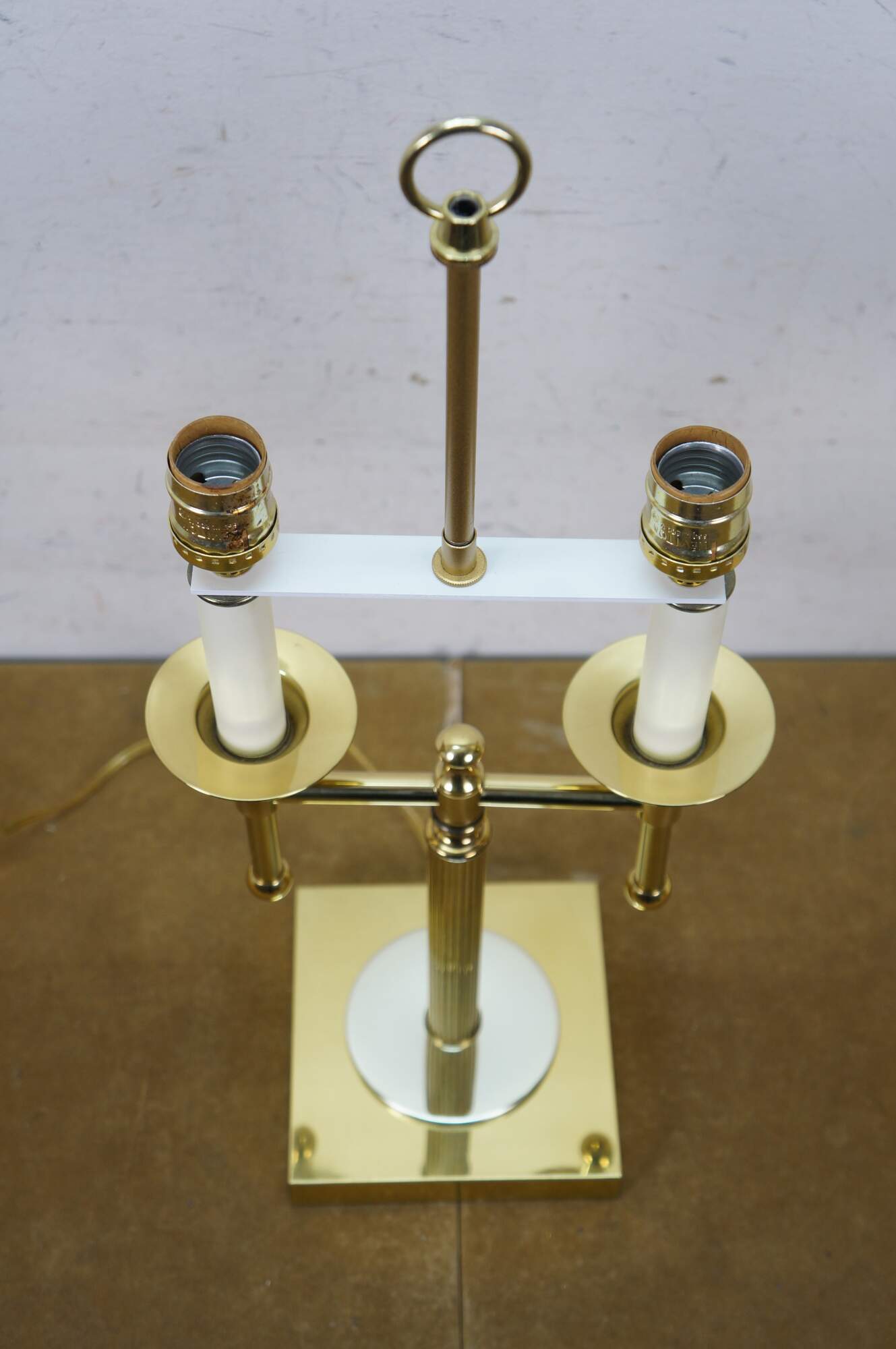 Vintage 1999 Robert Abbey brass French bouillotte style table lamp. Bright lacquered brass; square base and fluted center column supporting two faux candlestick arms. Ring shaped finial and white fabric shade. Switch on cord.