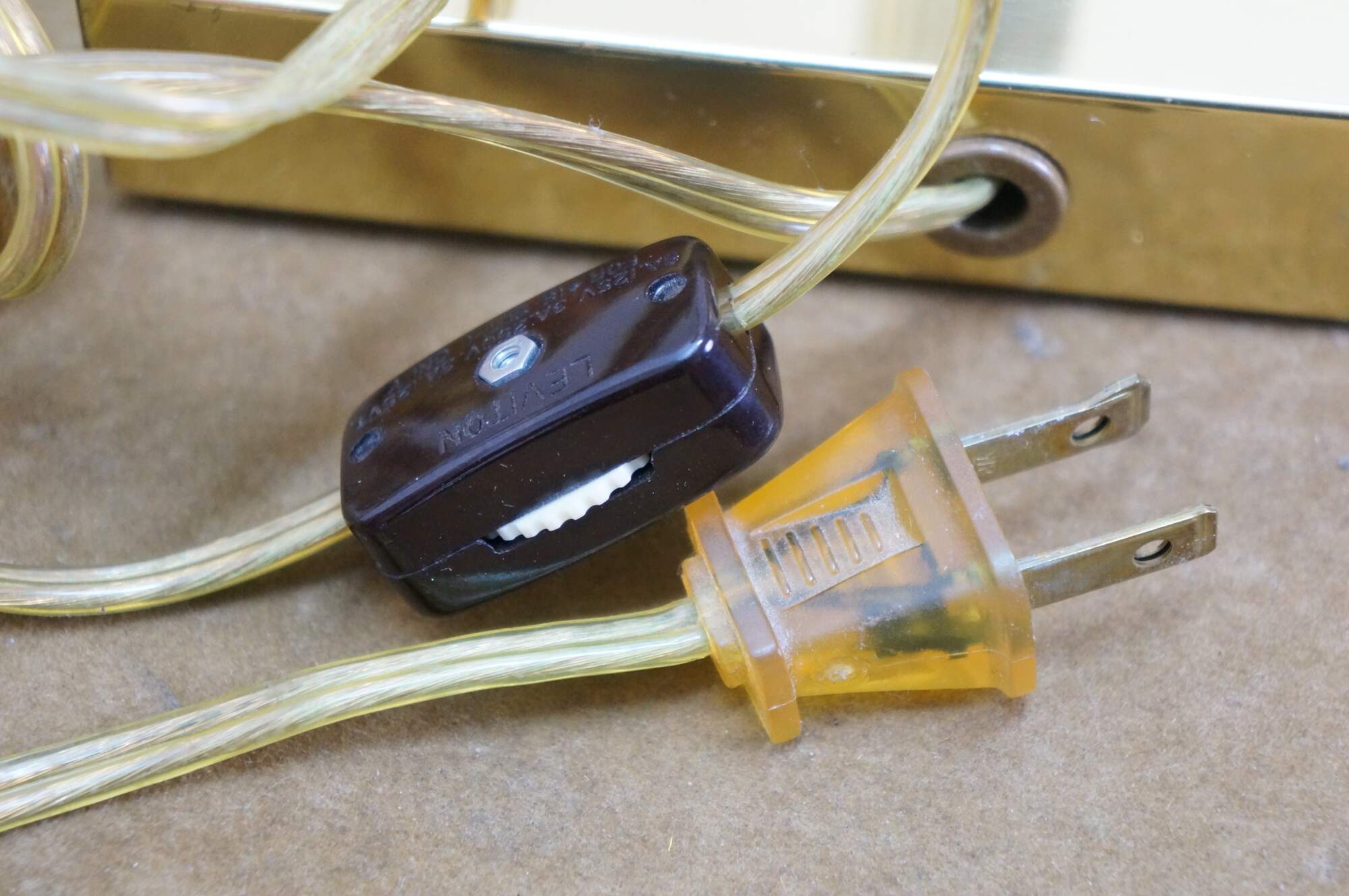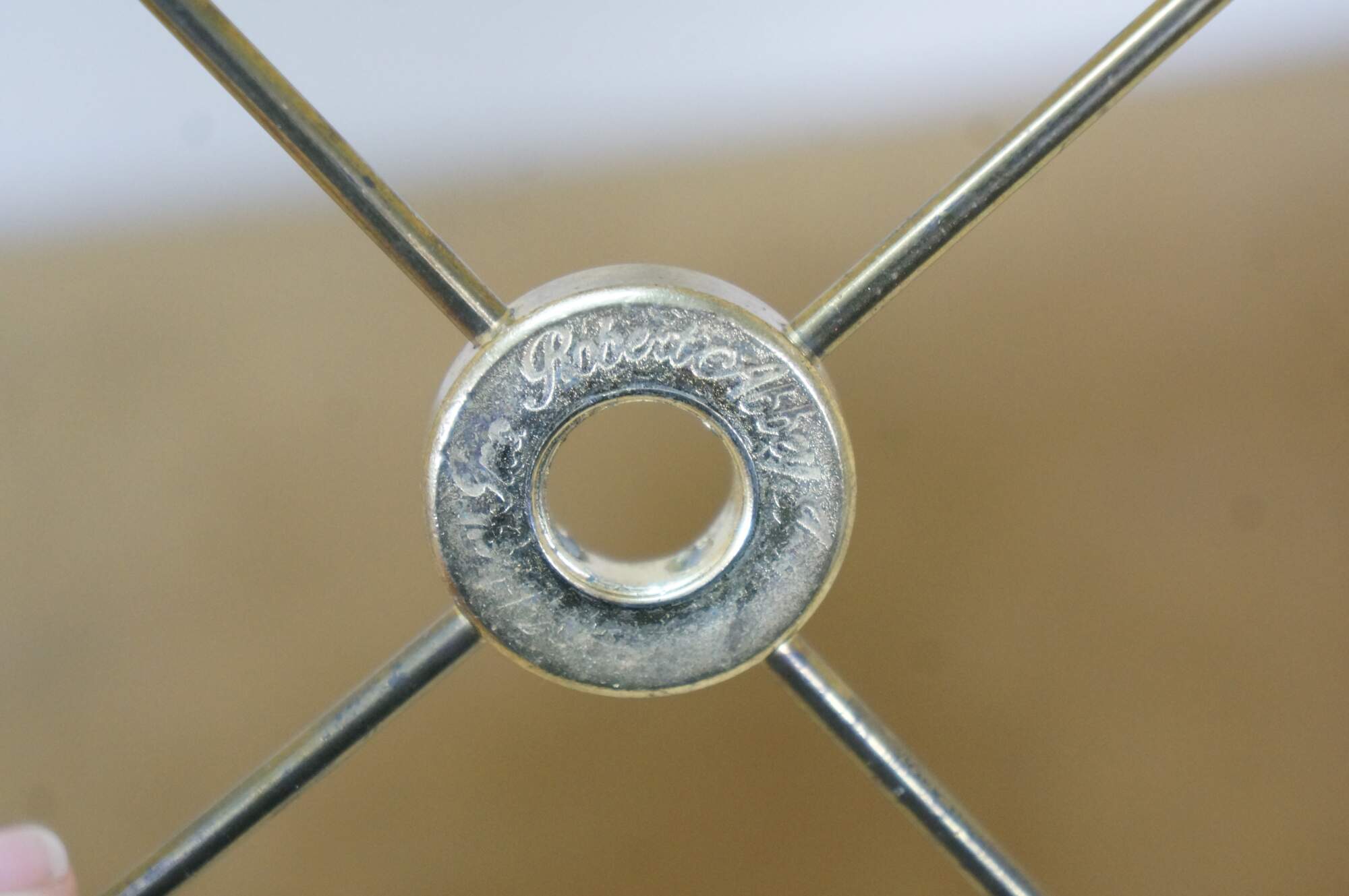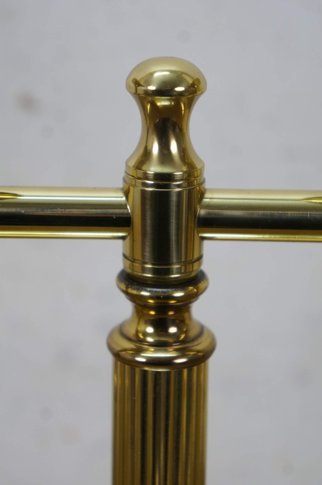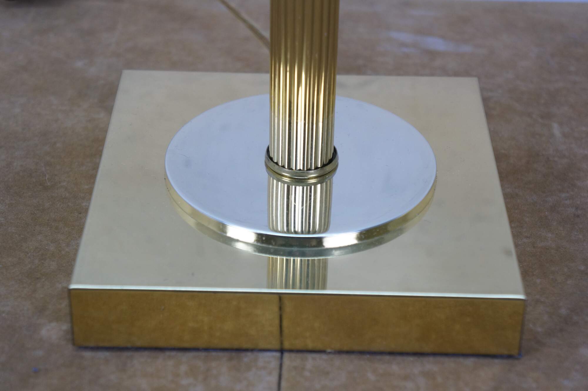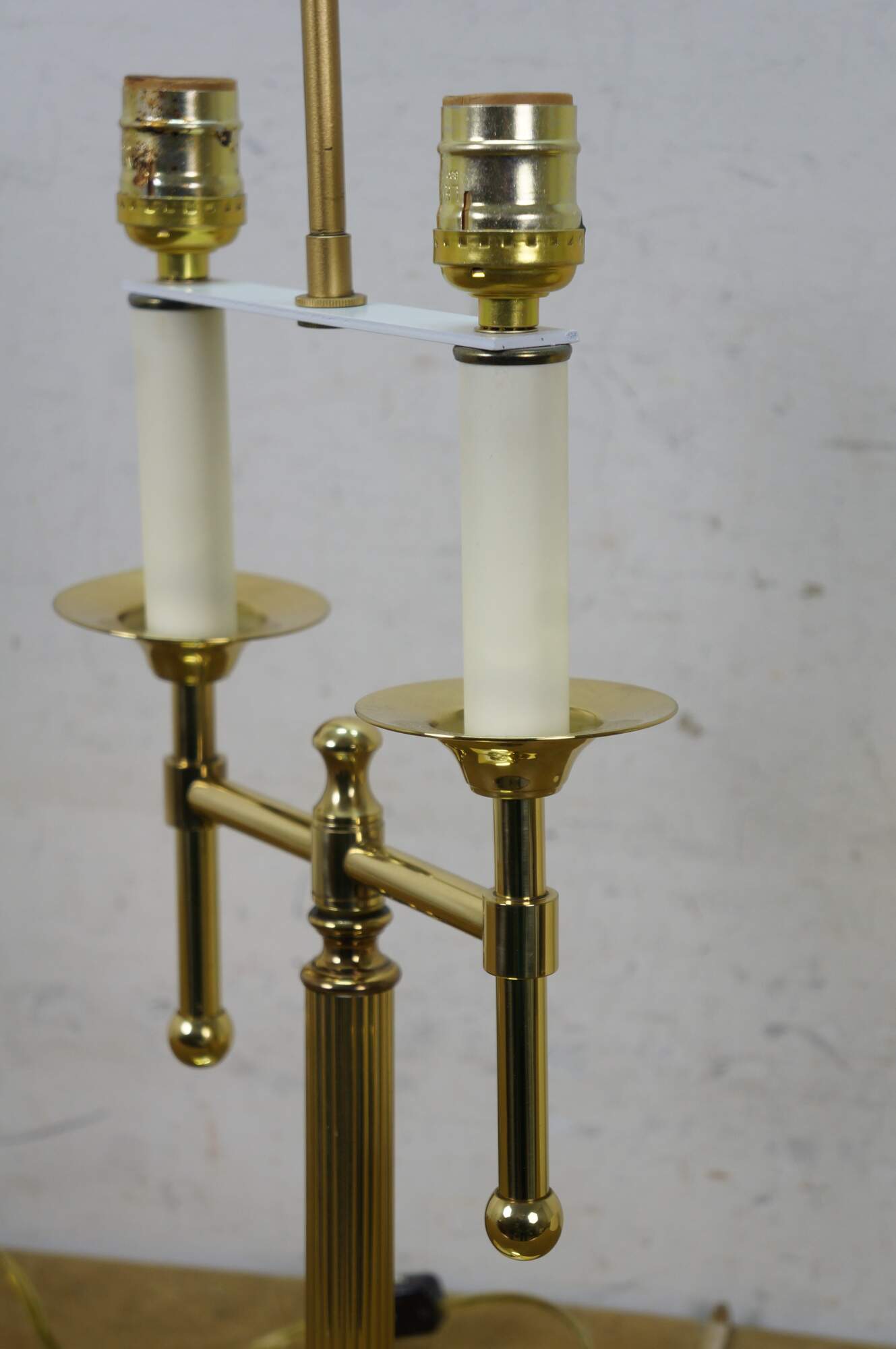 Vintage 1999 Robert Abbey brass French bouillotte style table lamp. Bright lacquered brass; square base and fluted center column supporting two faux candlestick arms. Ring shaped finial and white fabric shade. Switch on cord.