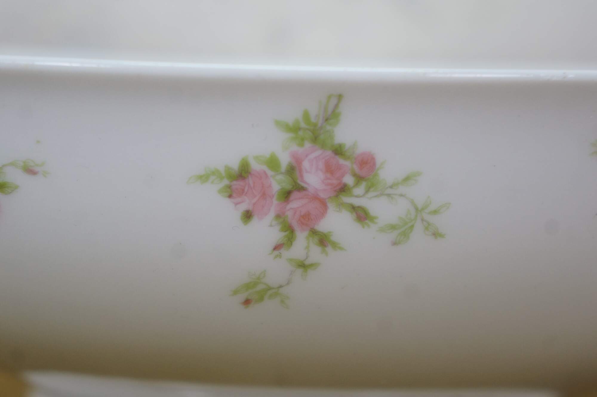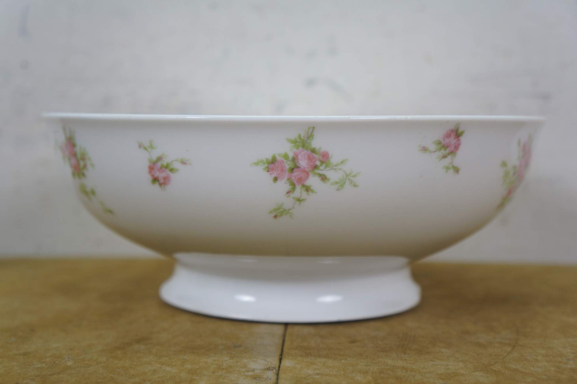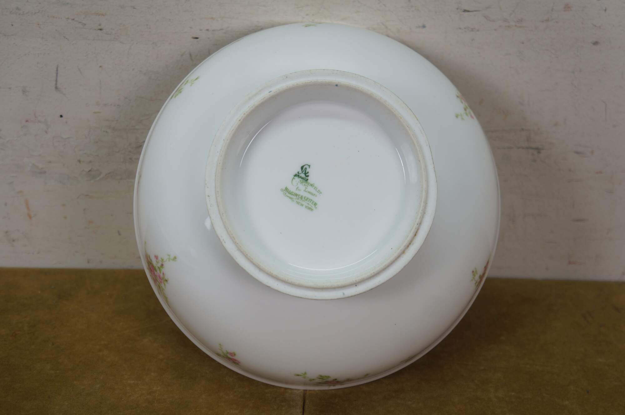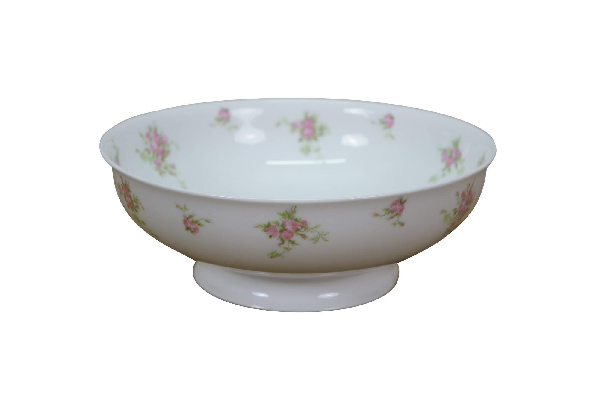 Early 20th century salad plates and serving bowl by Charles Ahrenfeldt for Higgins & Seiter, New York. White French Limoges porcelain decorated with clusters of pink roses. 9 plates, 1 bowl.