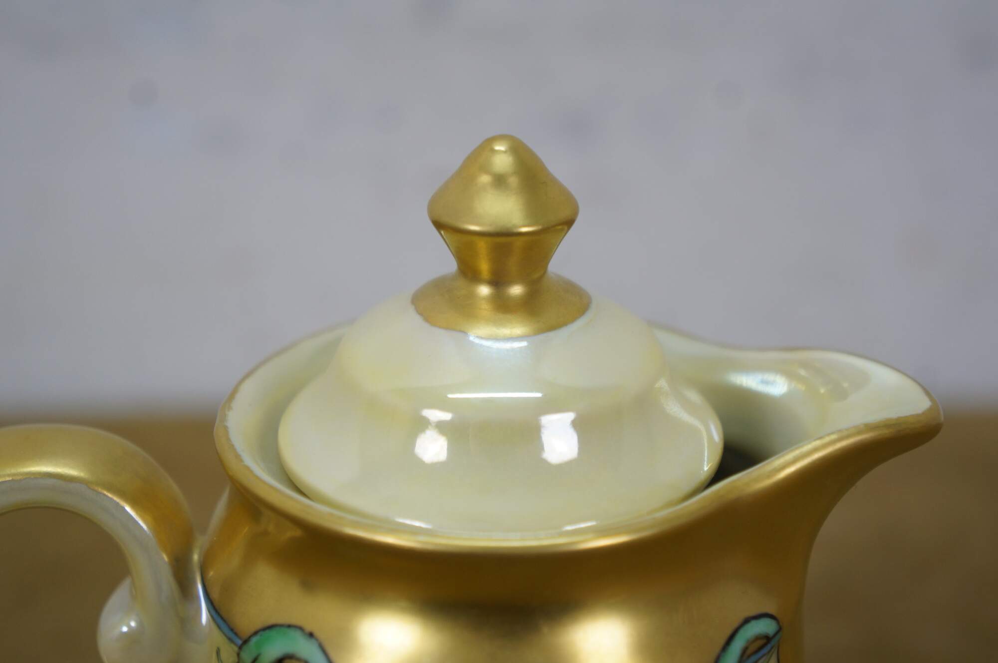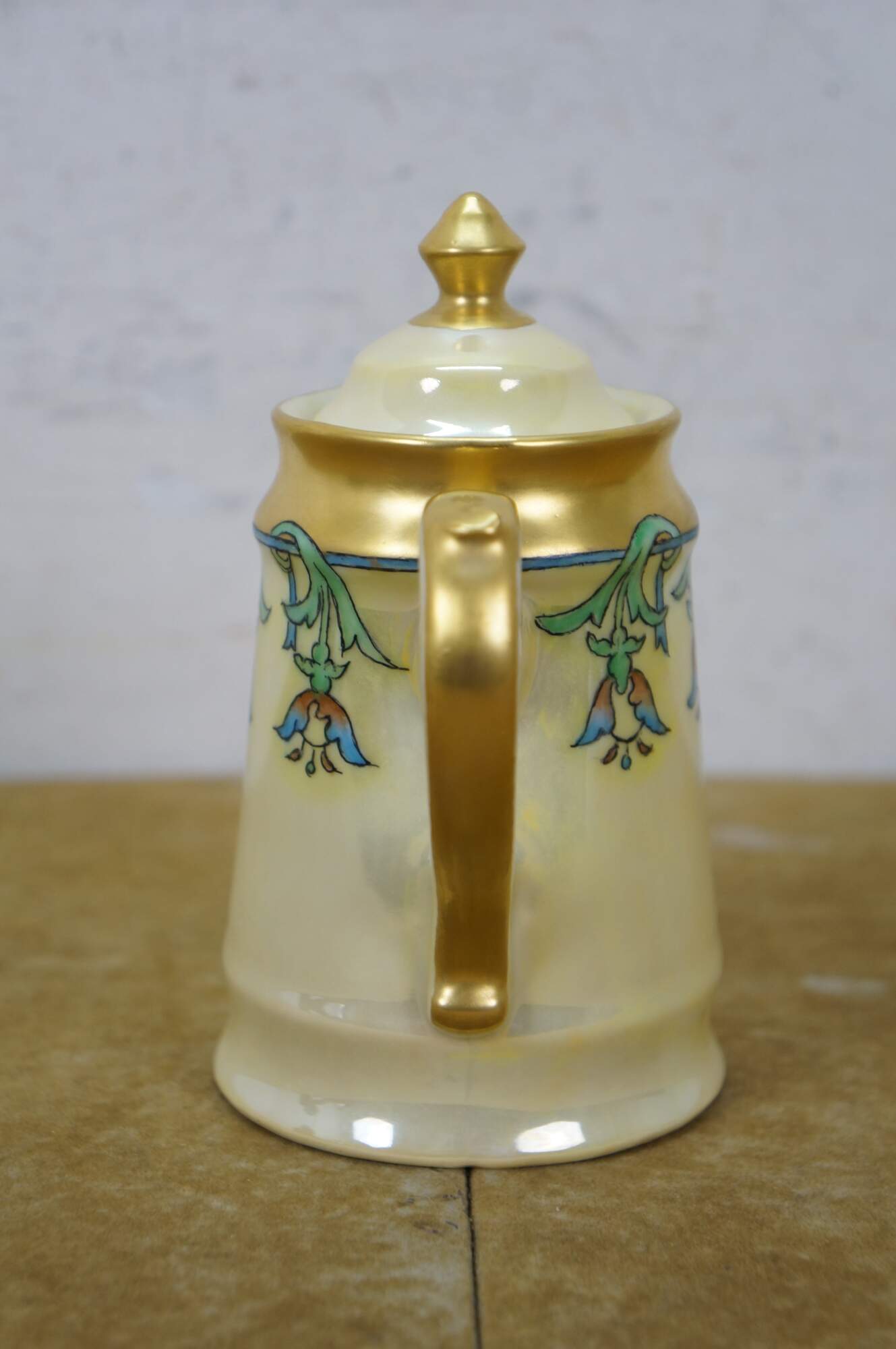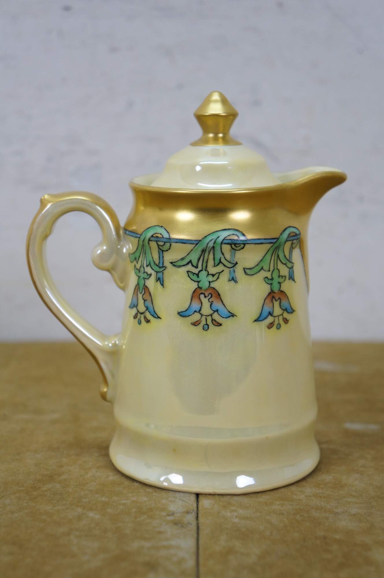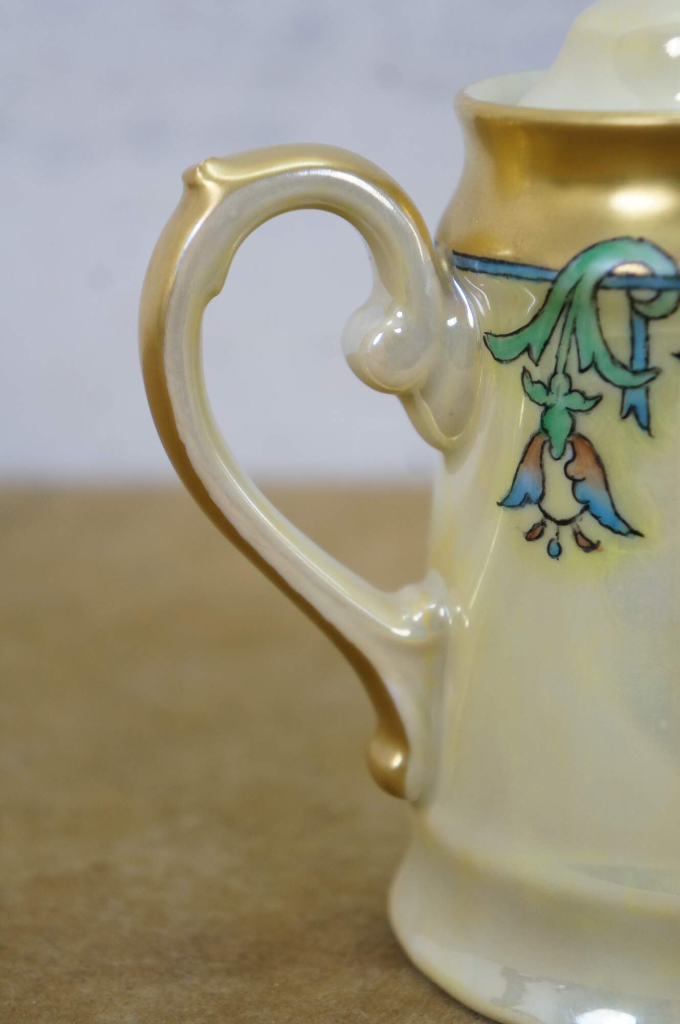 Late 19th to early 20th century pale yellow lustreware porcelain miniature teapot / creamer / syrup pitcher with lid. Gilt details and hand painted trim of dropping art nouveau / art deco style lilies. Signed on base Cara L. Willis.