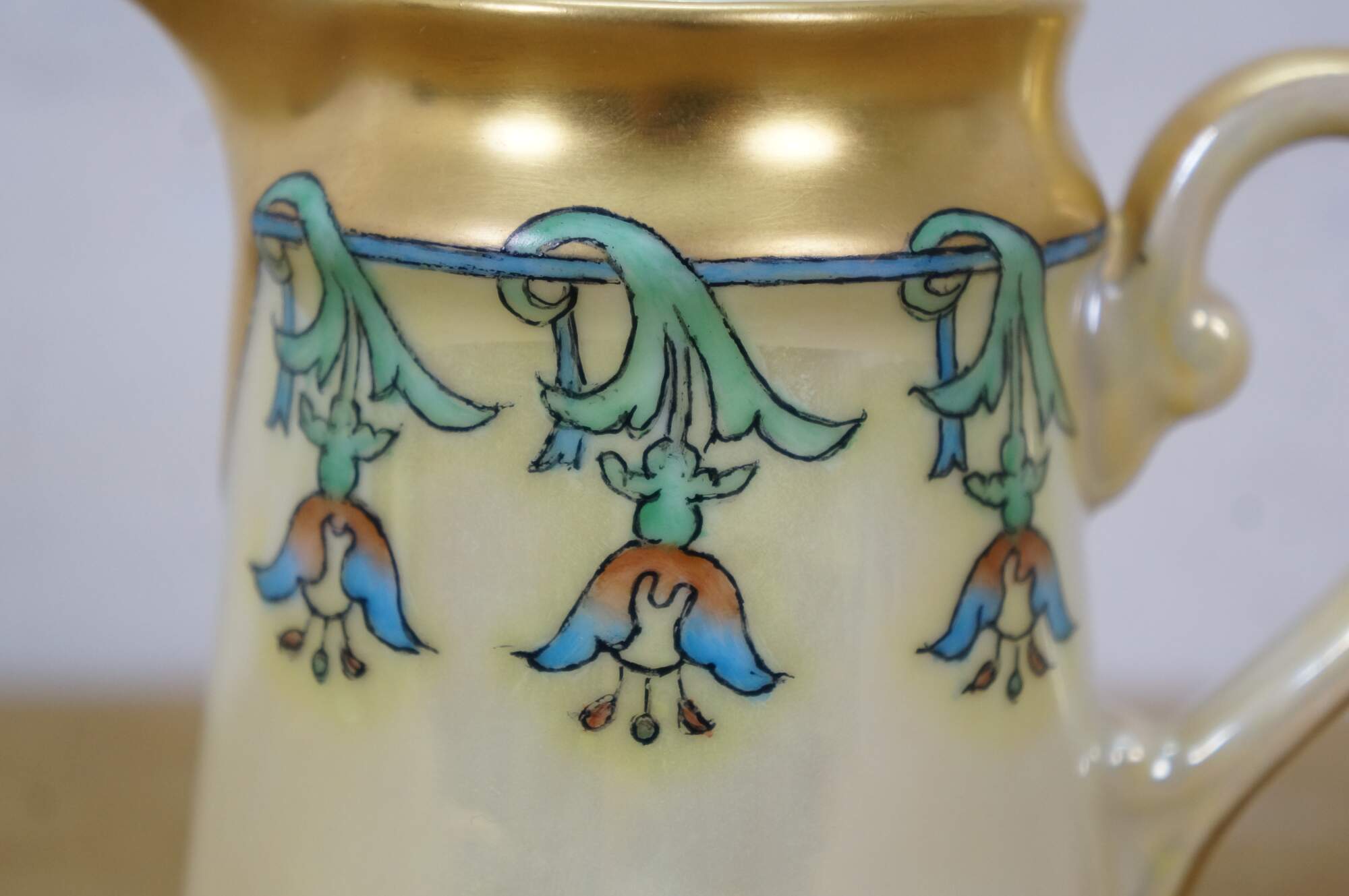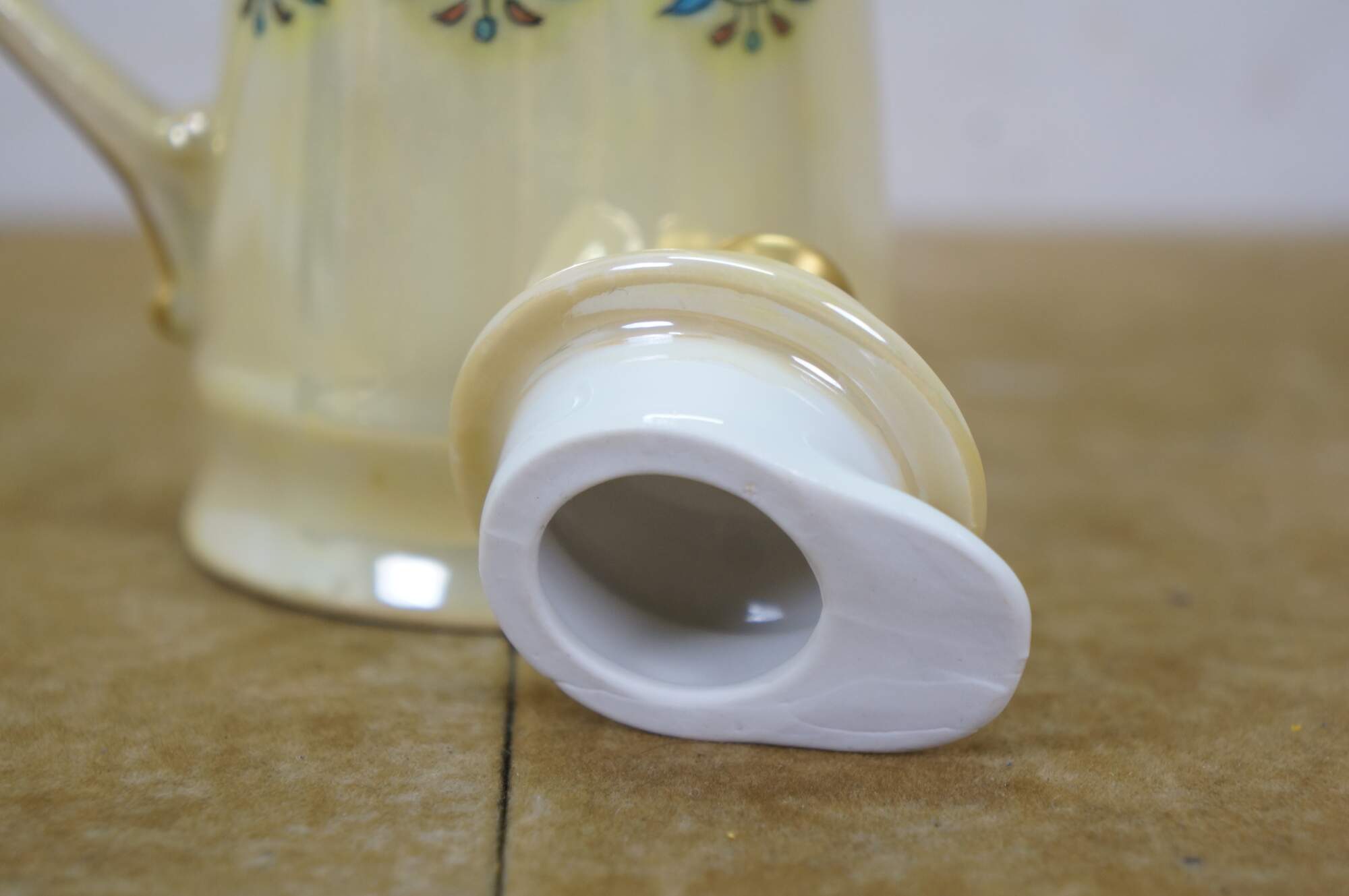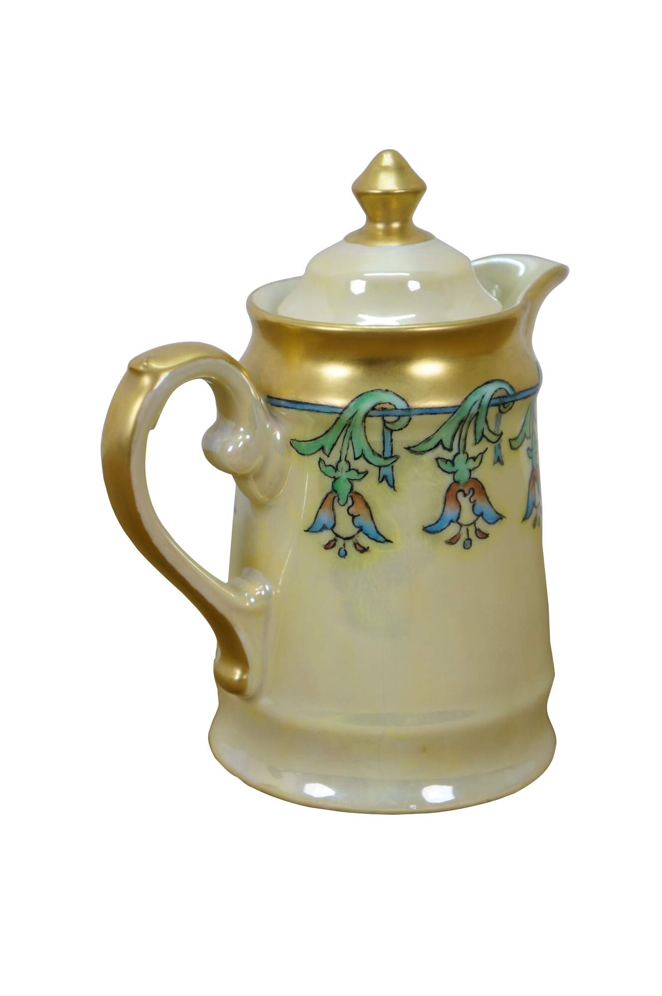 Late 19th to early 20th century pale yellow lustreware porcelain miniature teapot / creamer / syrup pitcher with lid. Gilt details and hand painted trim of dropping art nouveau / art deco style lilies. Signed on base Cara L. Willis.