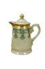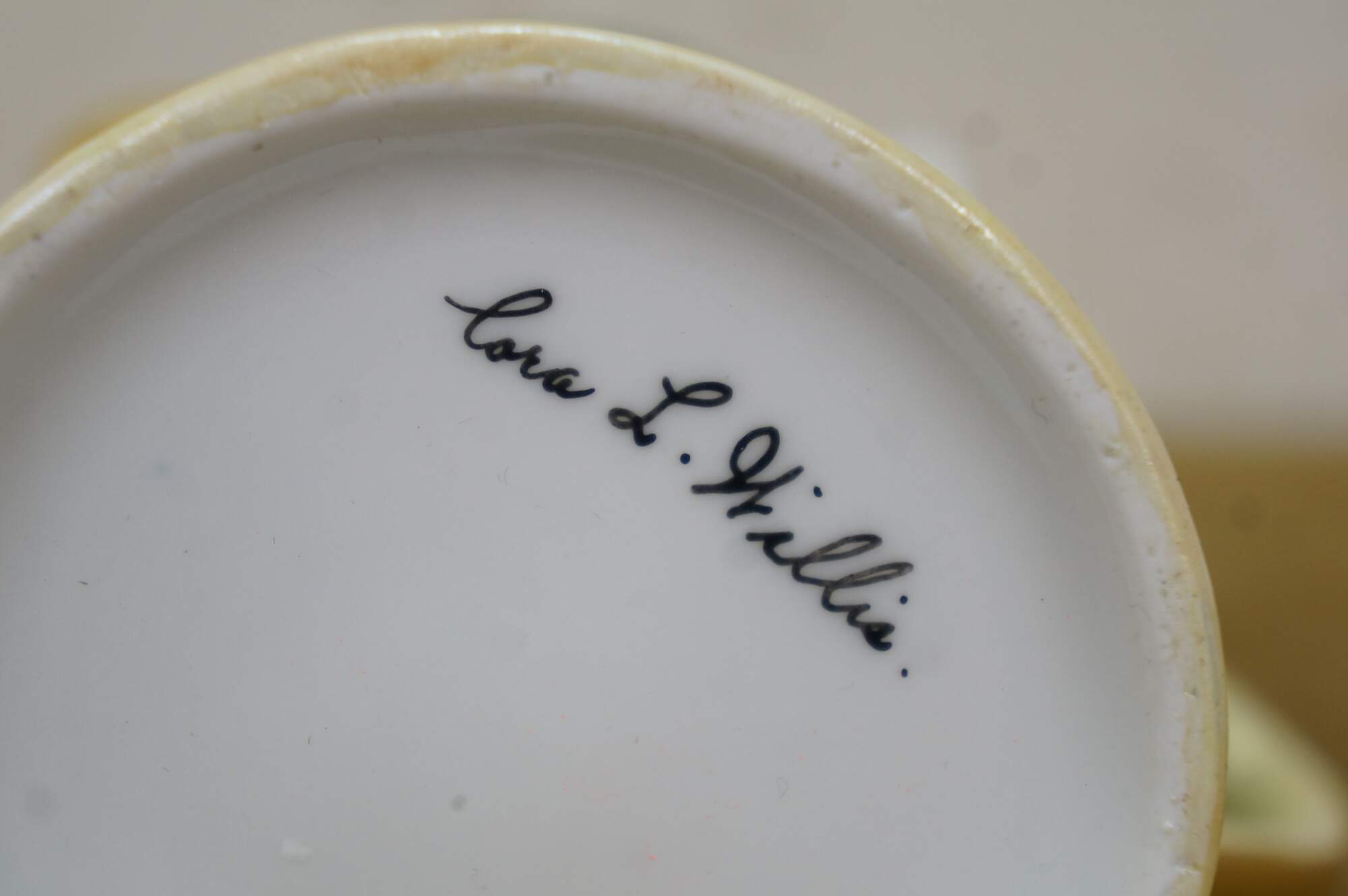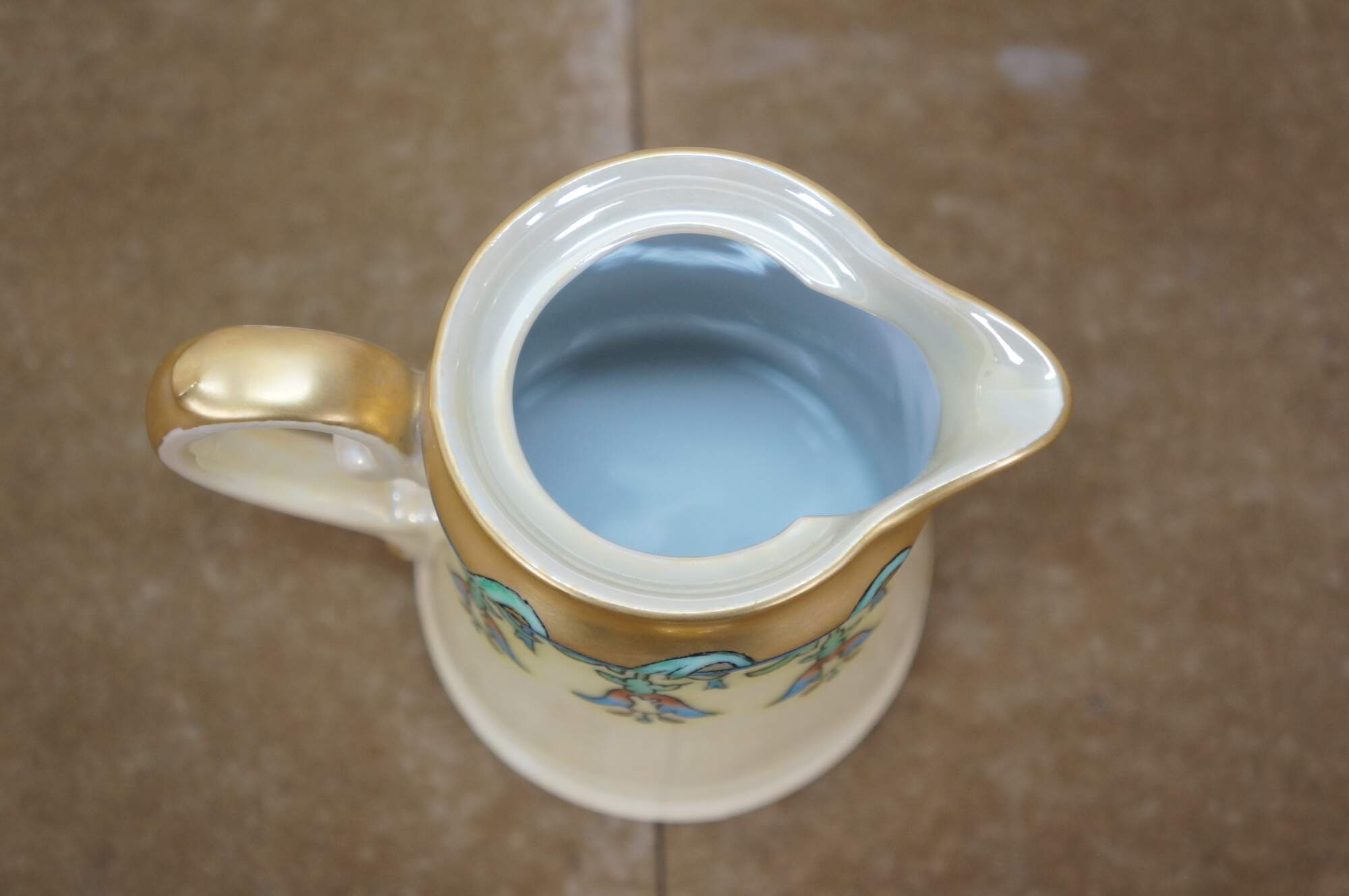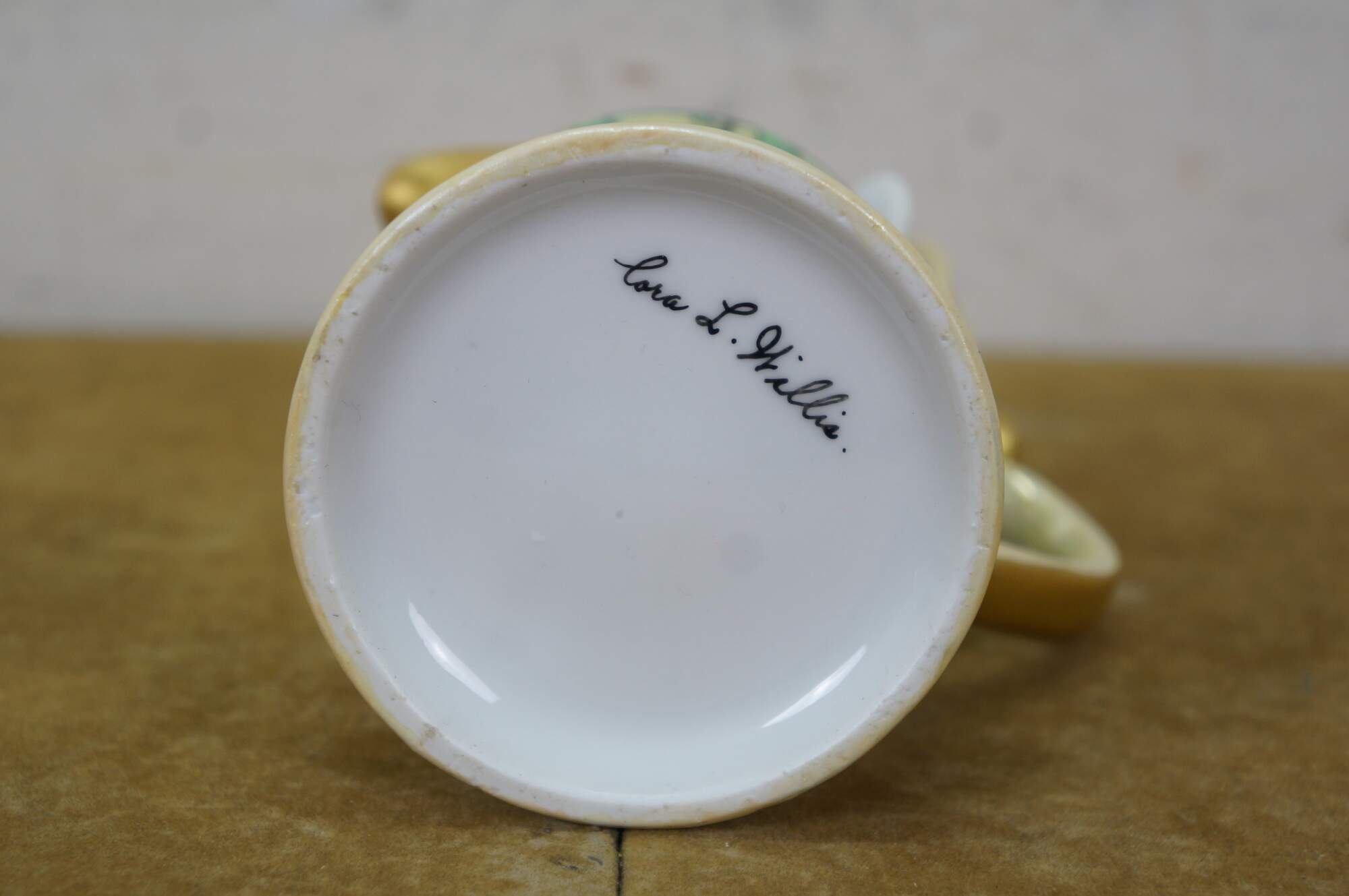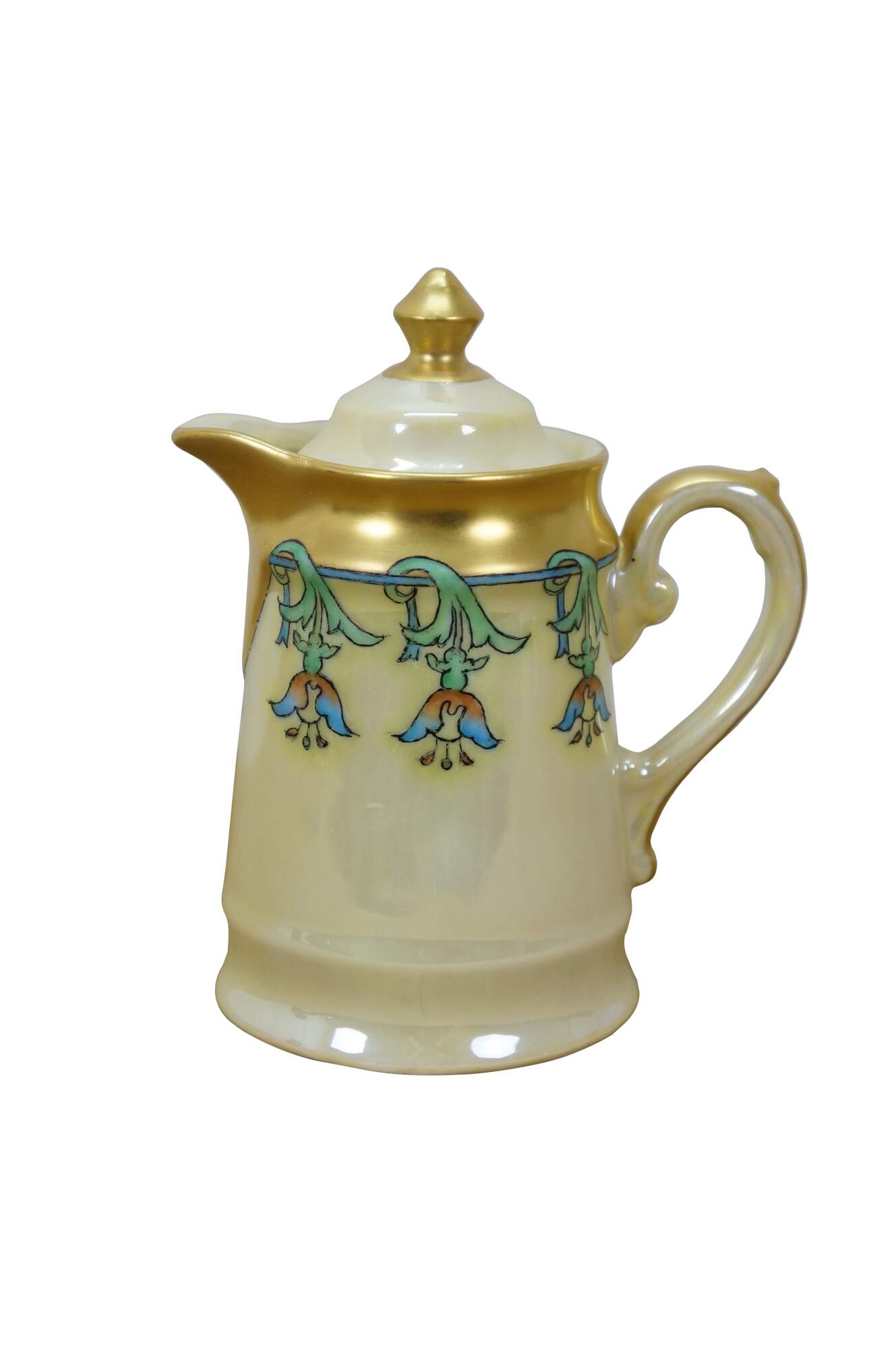 Late 19th to early 20th century pale yellow lustreware porcelain miniature teapot / creamer / syrup pitcher with lid. Gilt details and hand painted trim of dropping art nouveau / art deco style lilies. Signed on base Cara L. Willis.