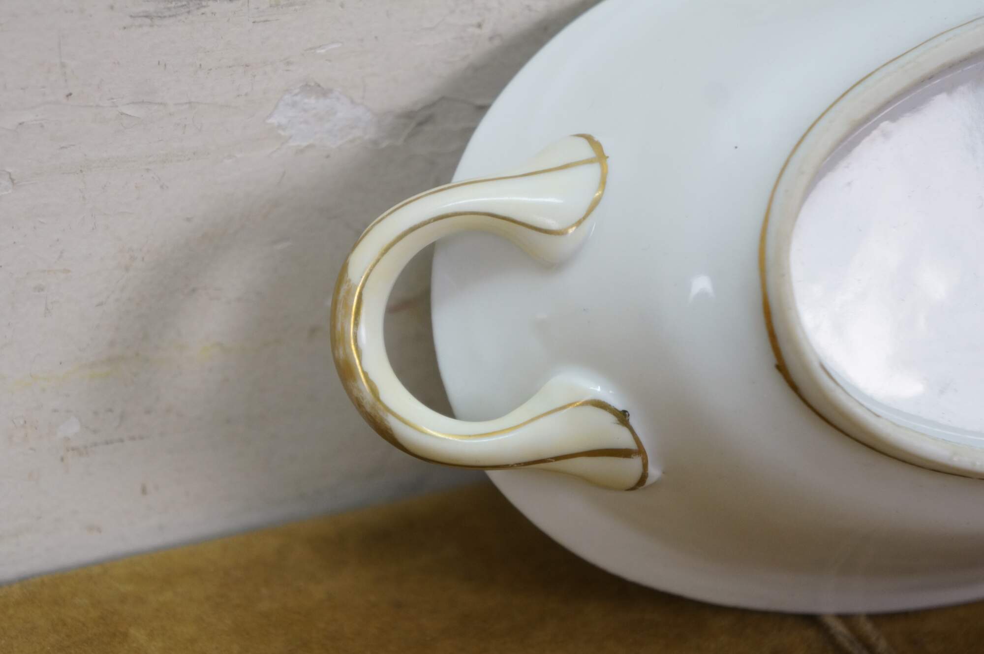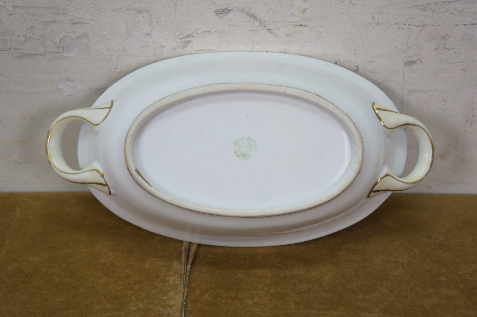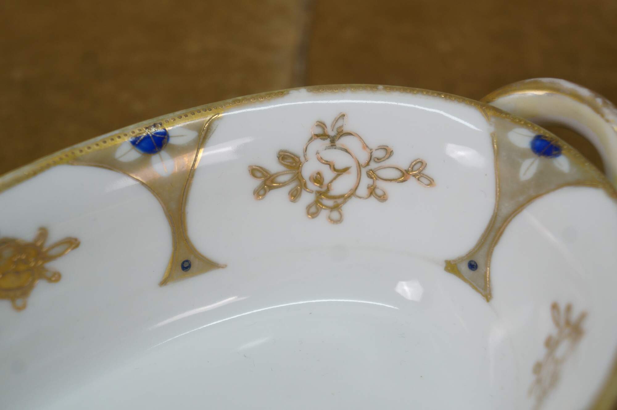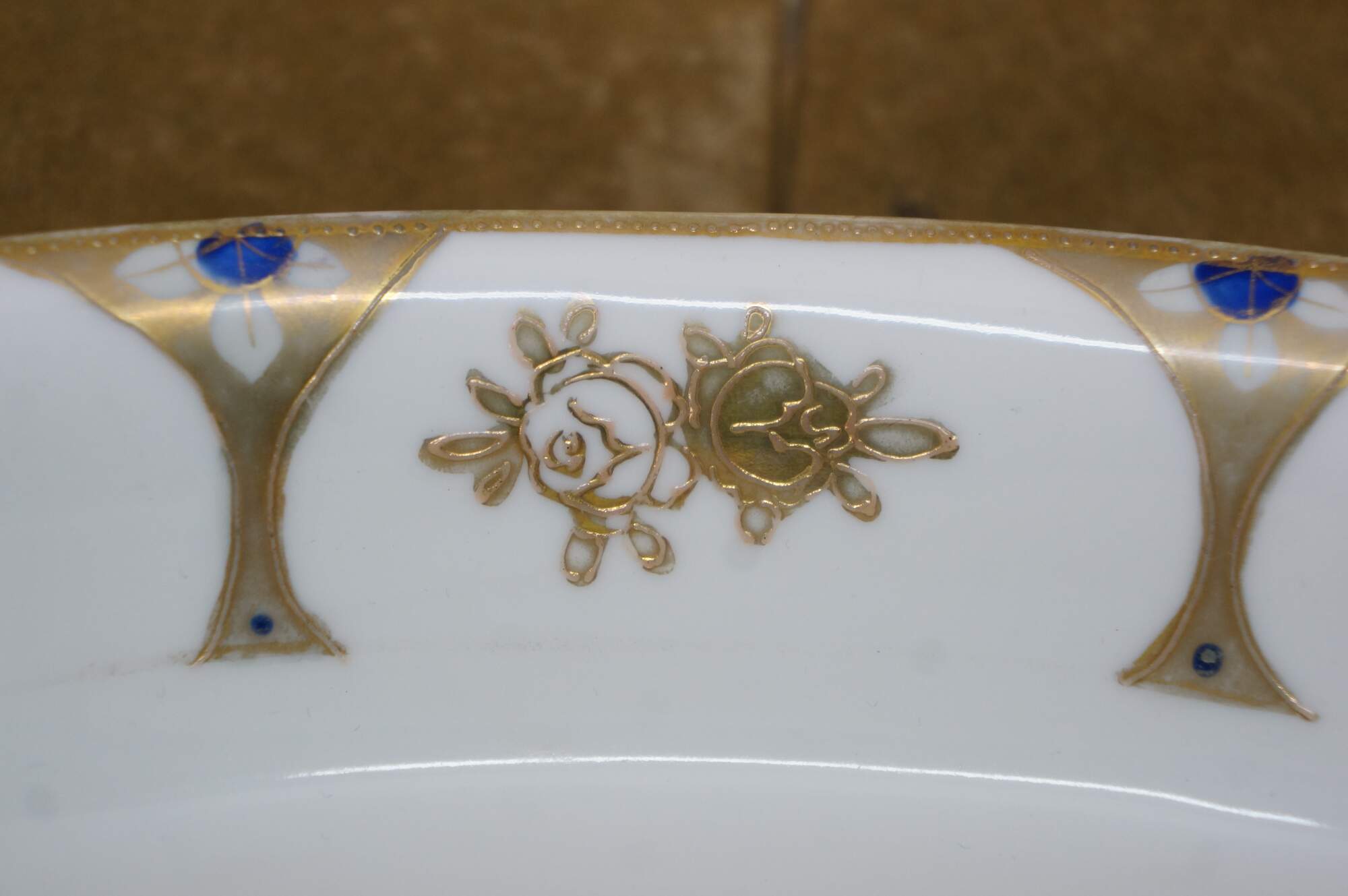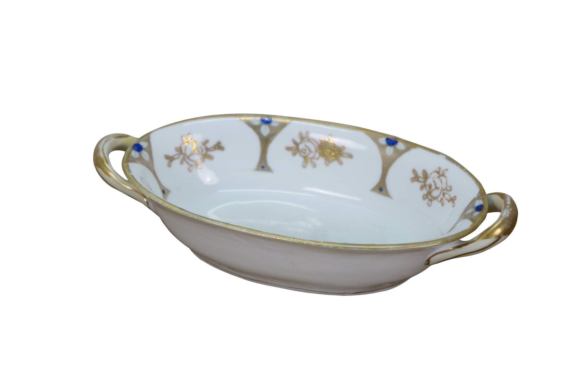 Early 20th century Noritake porcelain serving dish - over shape with two handles, decorated with a gold and cobalt blue design of martini shapes and moriage roses. Mark used circa 1911-1921.