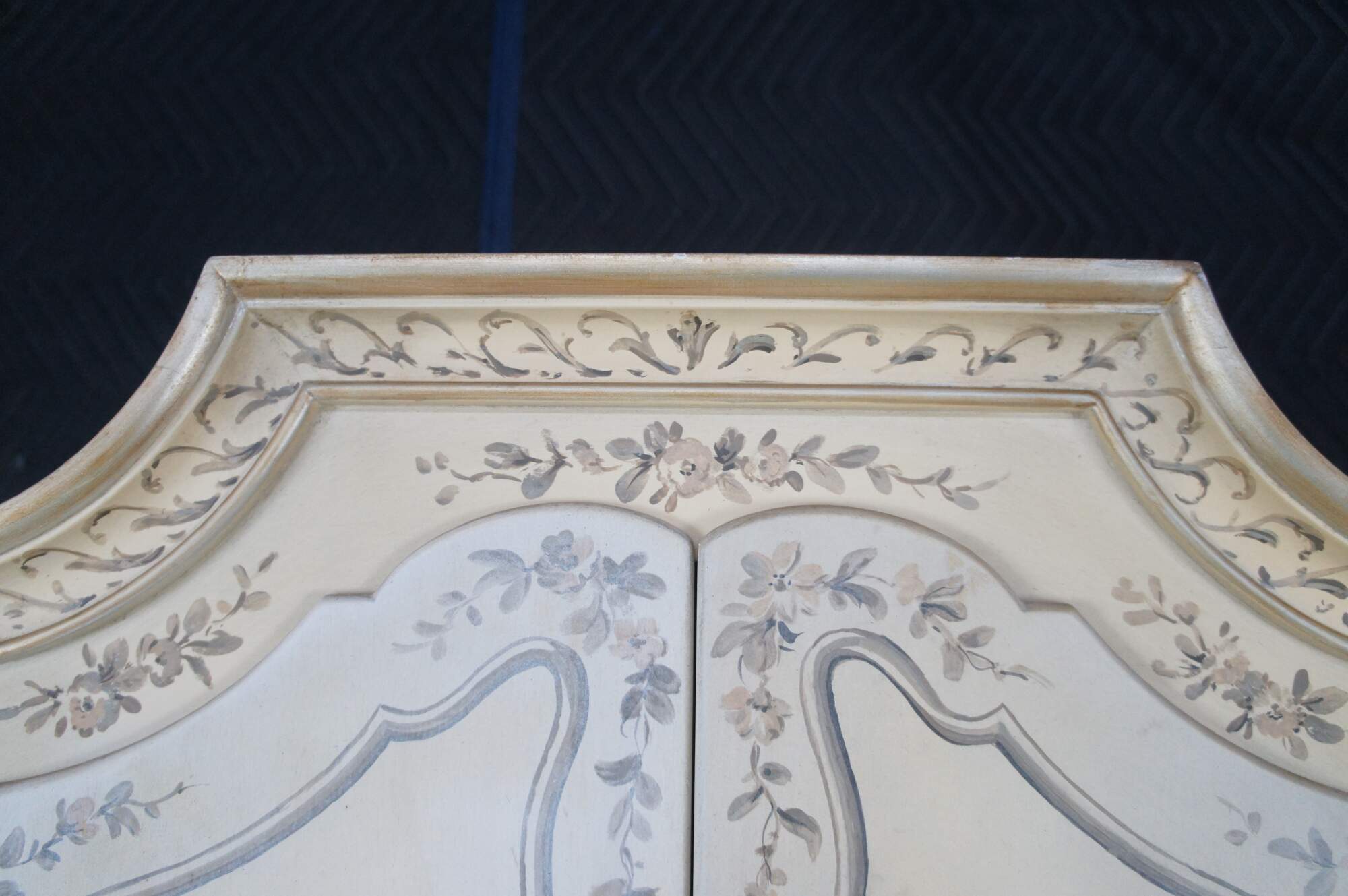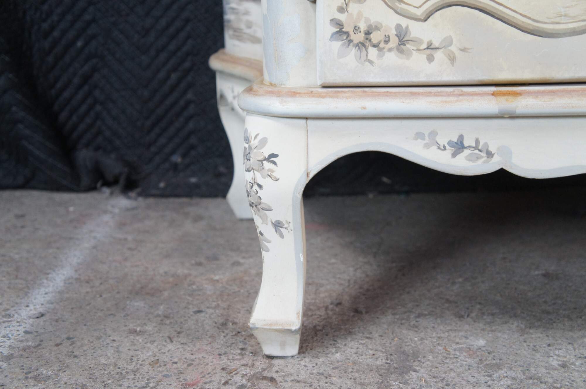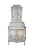 A beautiful Venetian style secretary desk, circa 1970s. Features classic Italian form with an off-white finish and chinoiserie toile landscapes. The piece includes a petite bookcase along the top with two shelves over a drop front secretary desk that opens to cubies and drawers. The cabinet base opens to one shelf. The case is supported by cabriole legs. A fun addition to any space.