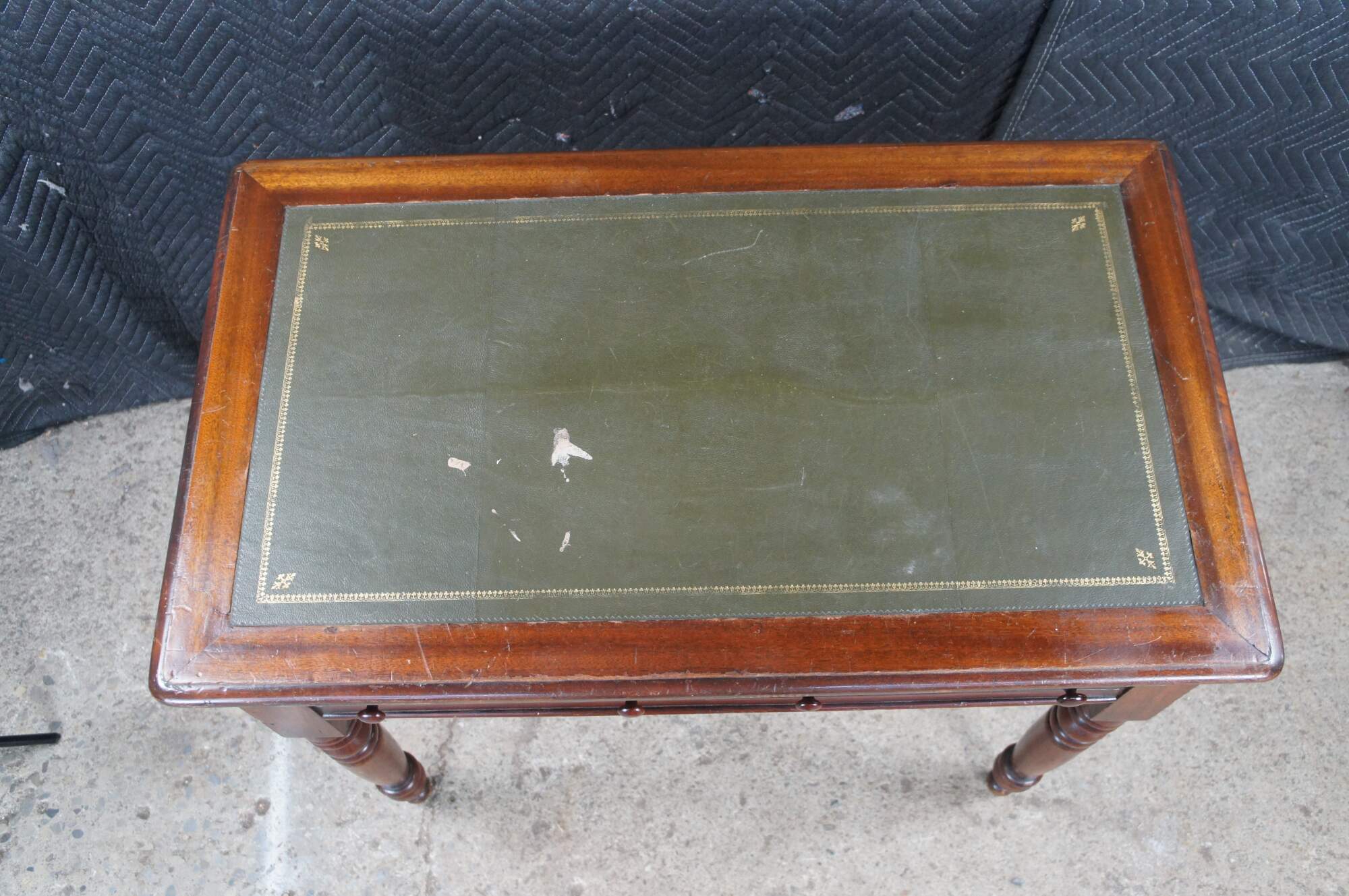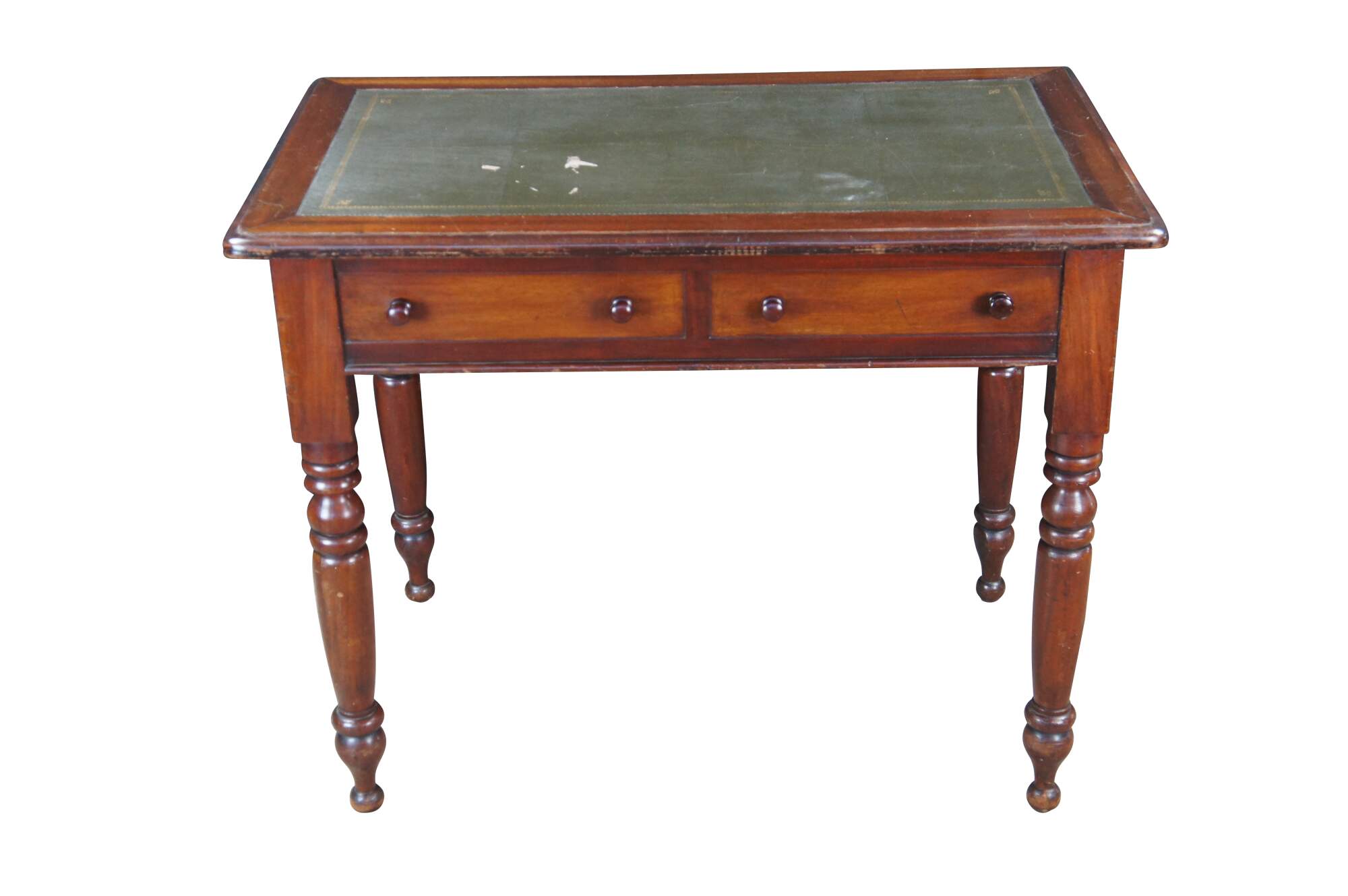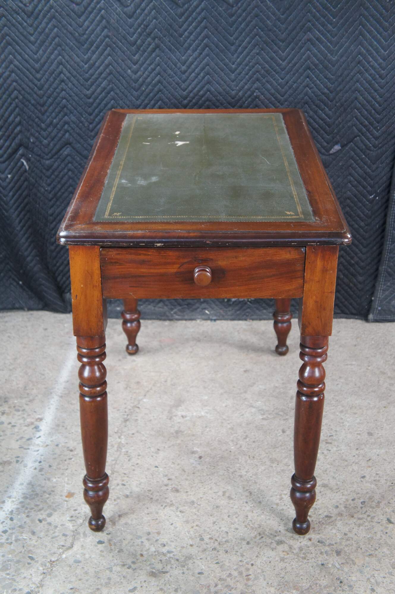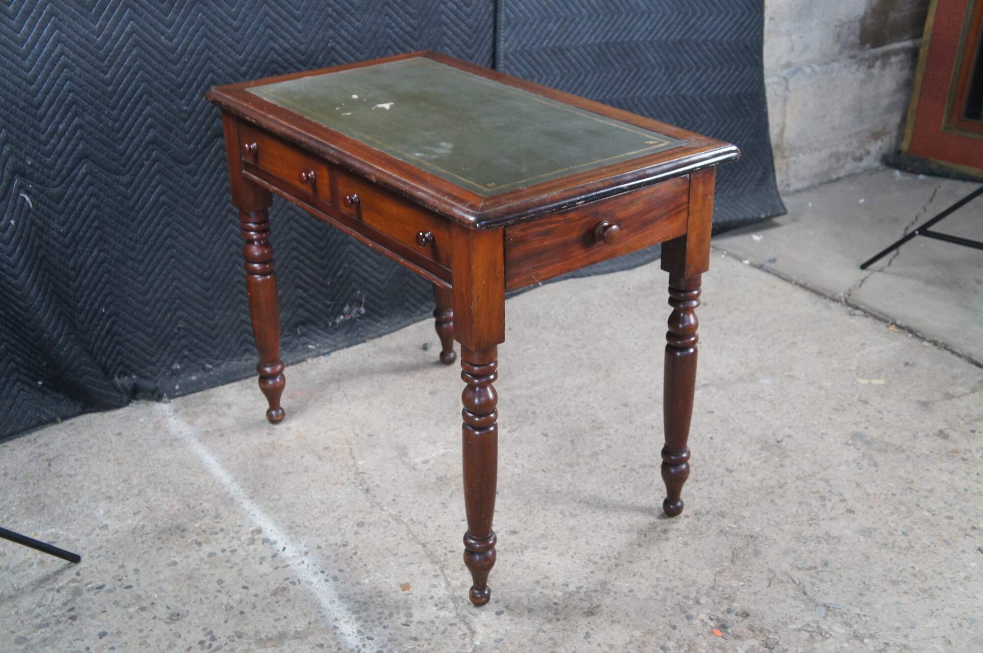 An exceptional early 19th Century William IV Writing Table. Features a rectangular form with green tooled leather inset top over a frieze of two false drawers. Along the right side of the desk is a pull for a hand dovetailed drawer with compartment. This drawer originally was hidden and would have been accessed via the groove along its underside. At some point in the 20th century a hand turned wooden pull was added. The desk is supported by four turned legs with ribbed accents and arrow feet. Whether it is used as a library table. writing desk, console it'll make a charming addition to any space.