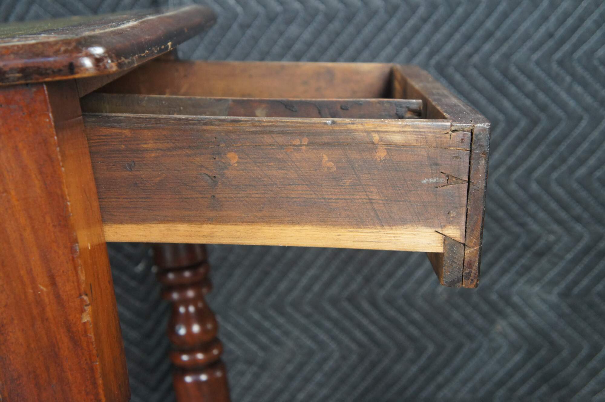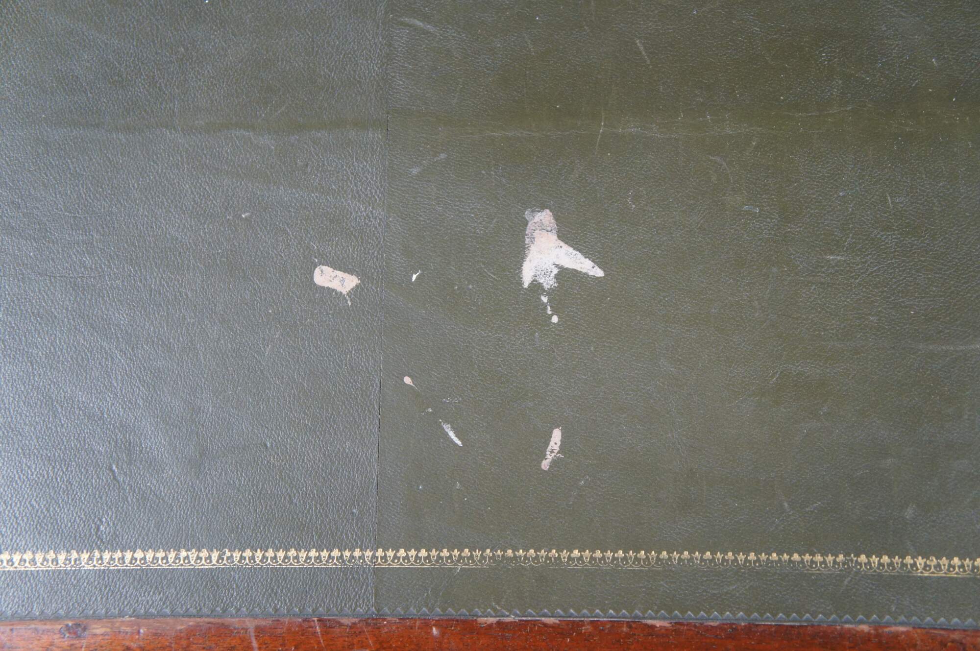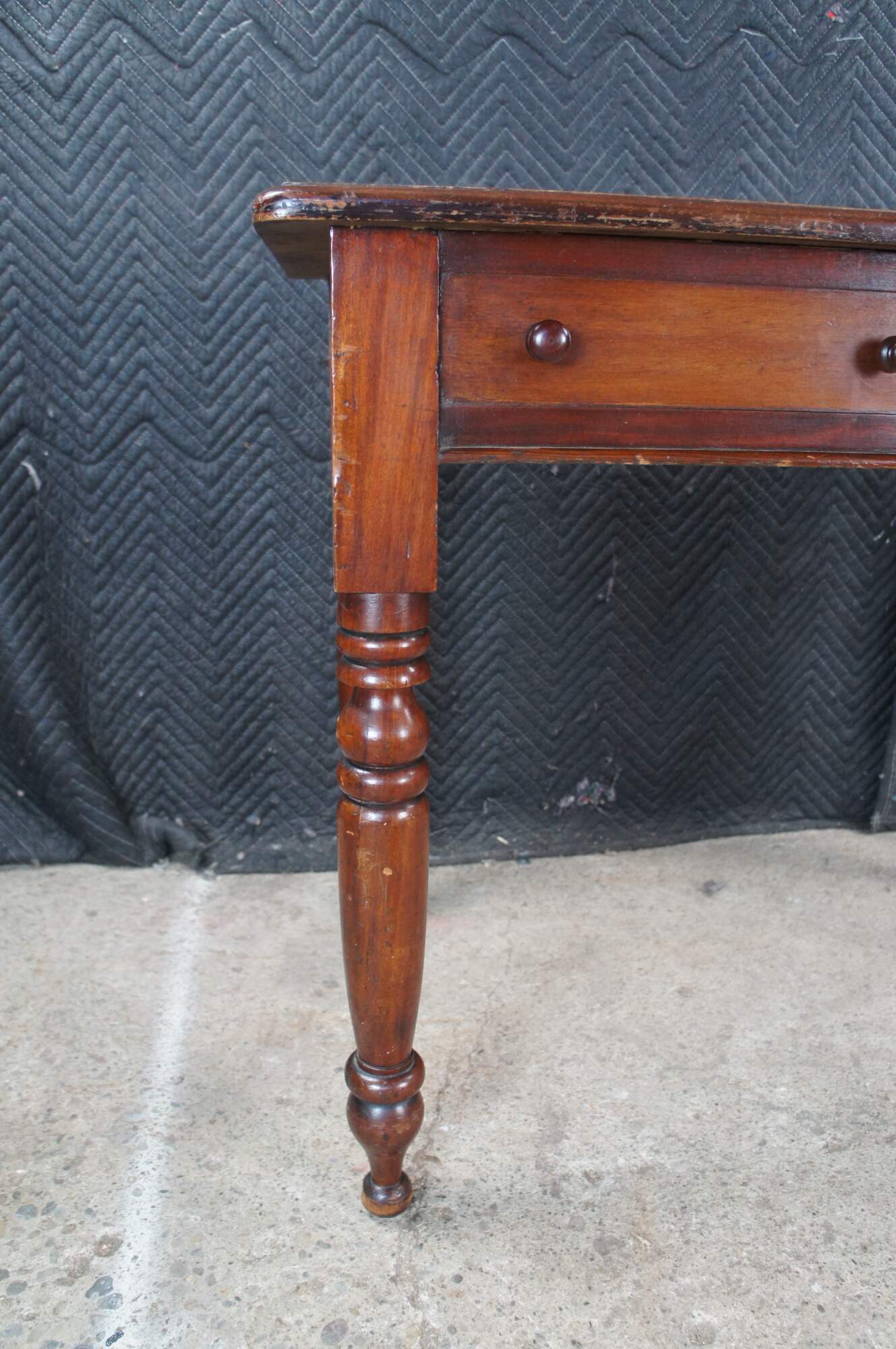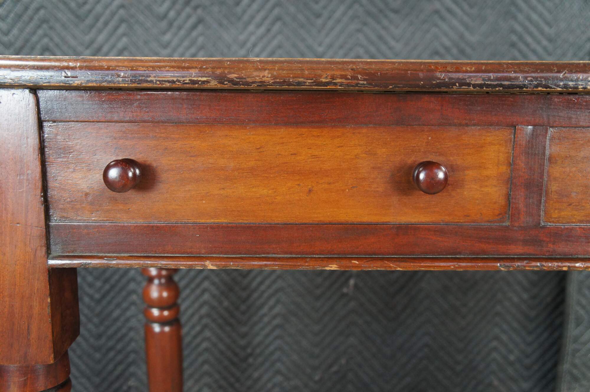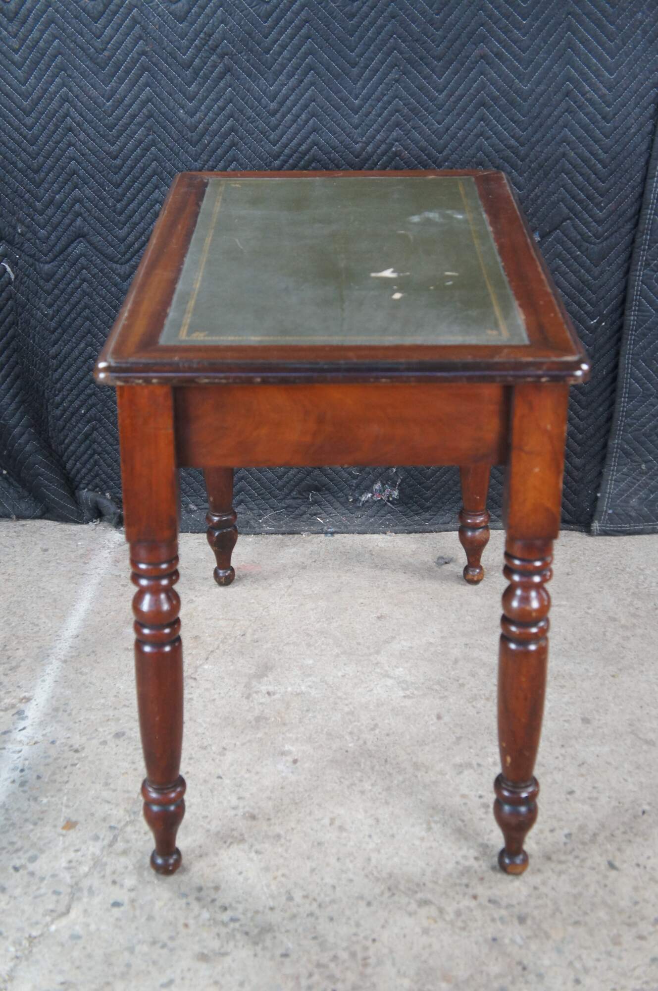 An exceptional early 19th Century William IV Writing Table. Features a rectangular form with green tooled leather inset top over a frieze of two false drawers. Along the right side of the desk is a pull for a hand dovetailed drawer with compartment. This drawer originally was hidden and would have been accessed via the groove along its underside. At some point in the 20th century a hand turned wooden pull was added. The desk is supported by four turned legs with ribbed accents and arrow feet. Whether it is used as a library table. writing desk, console it'll make a charming addition to any space.