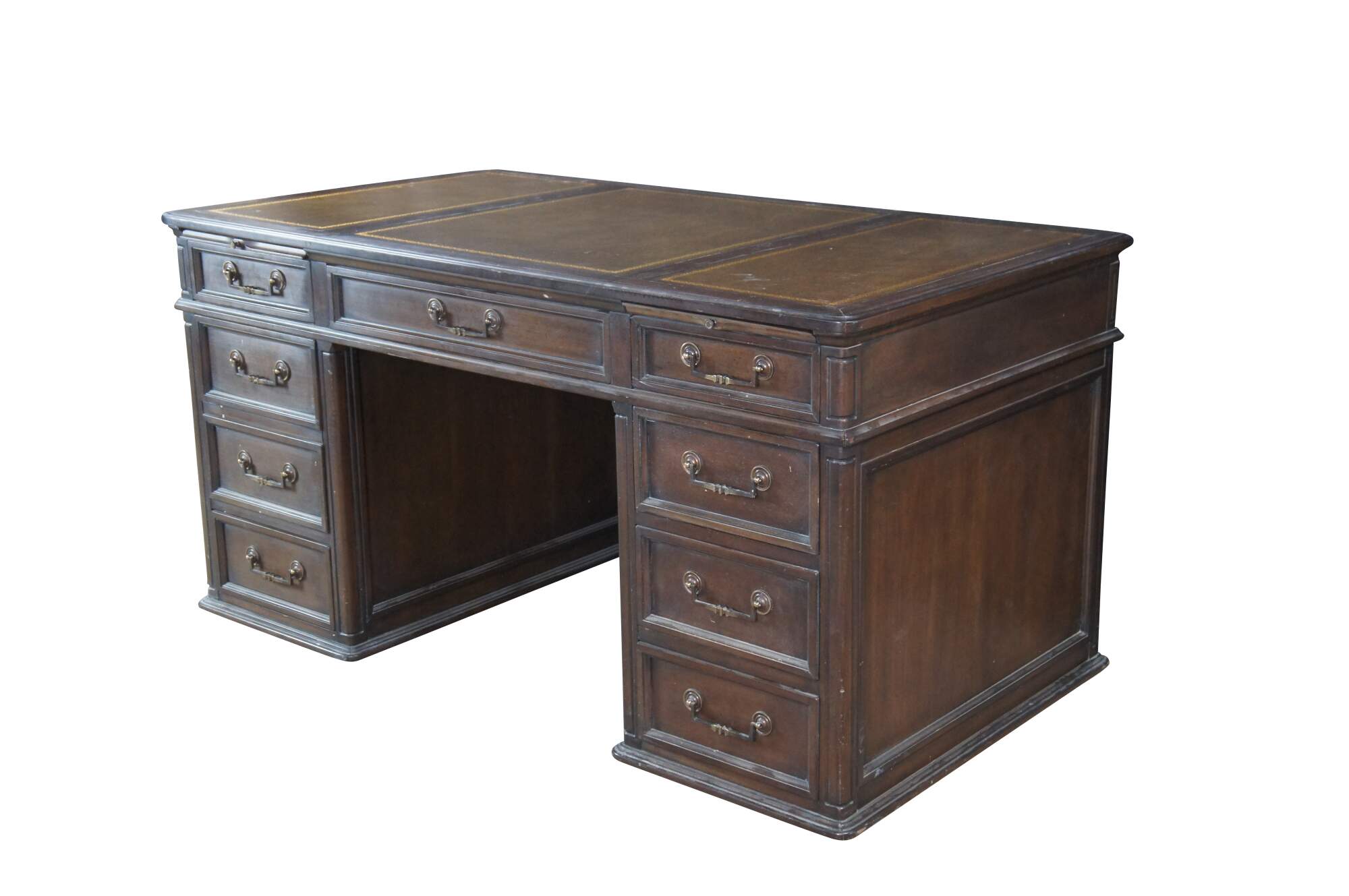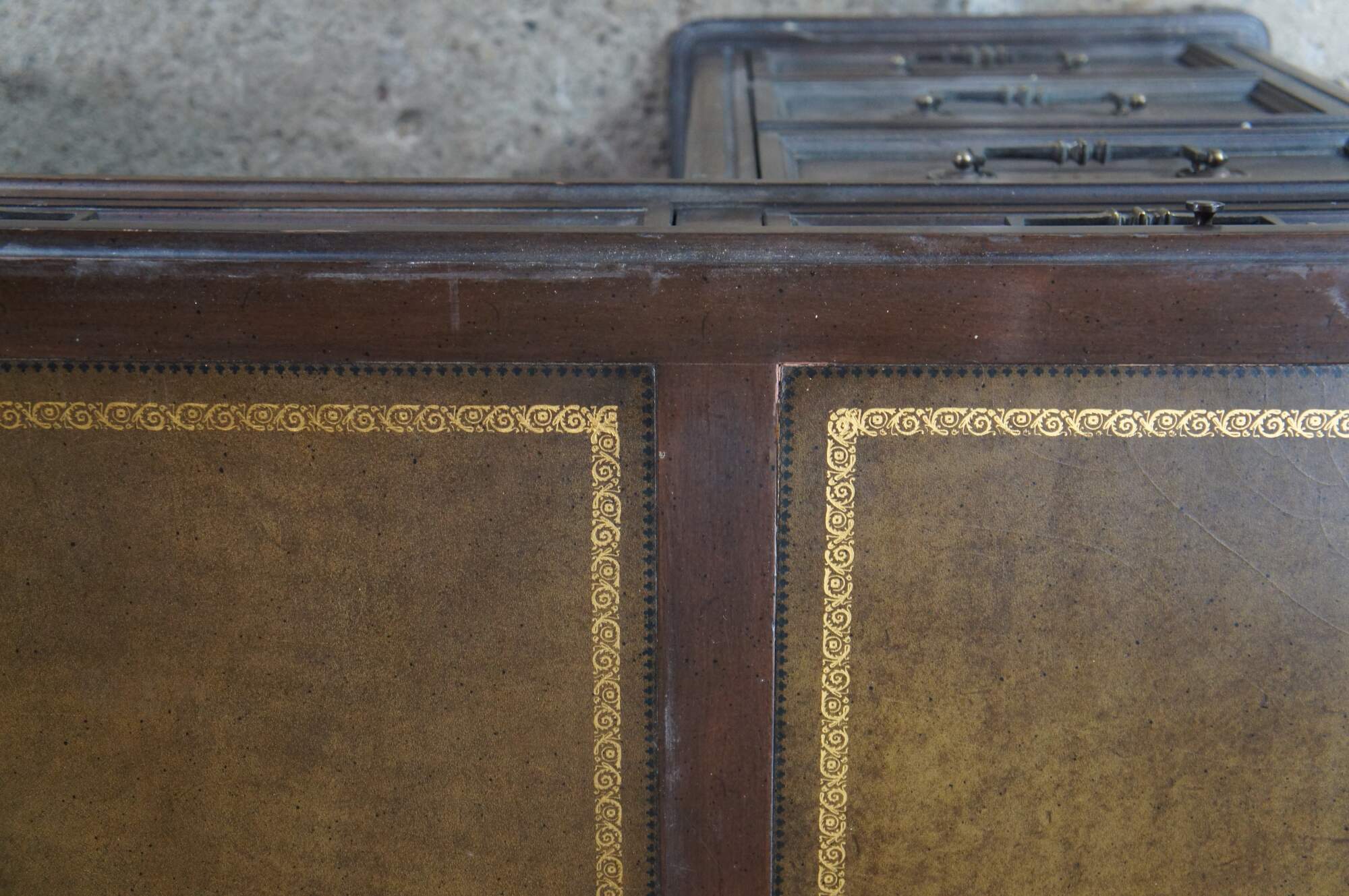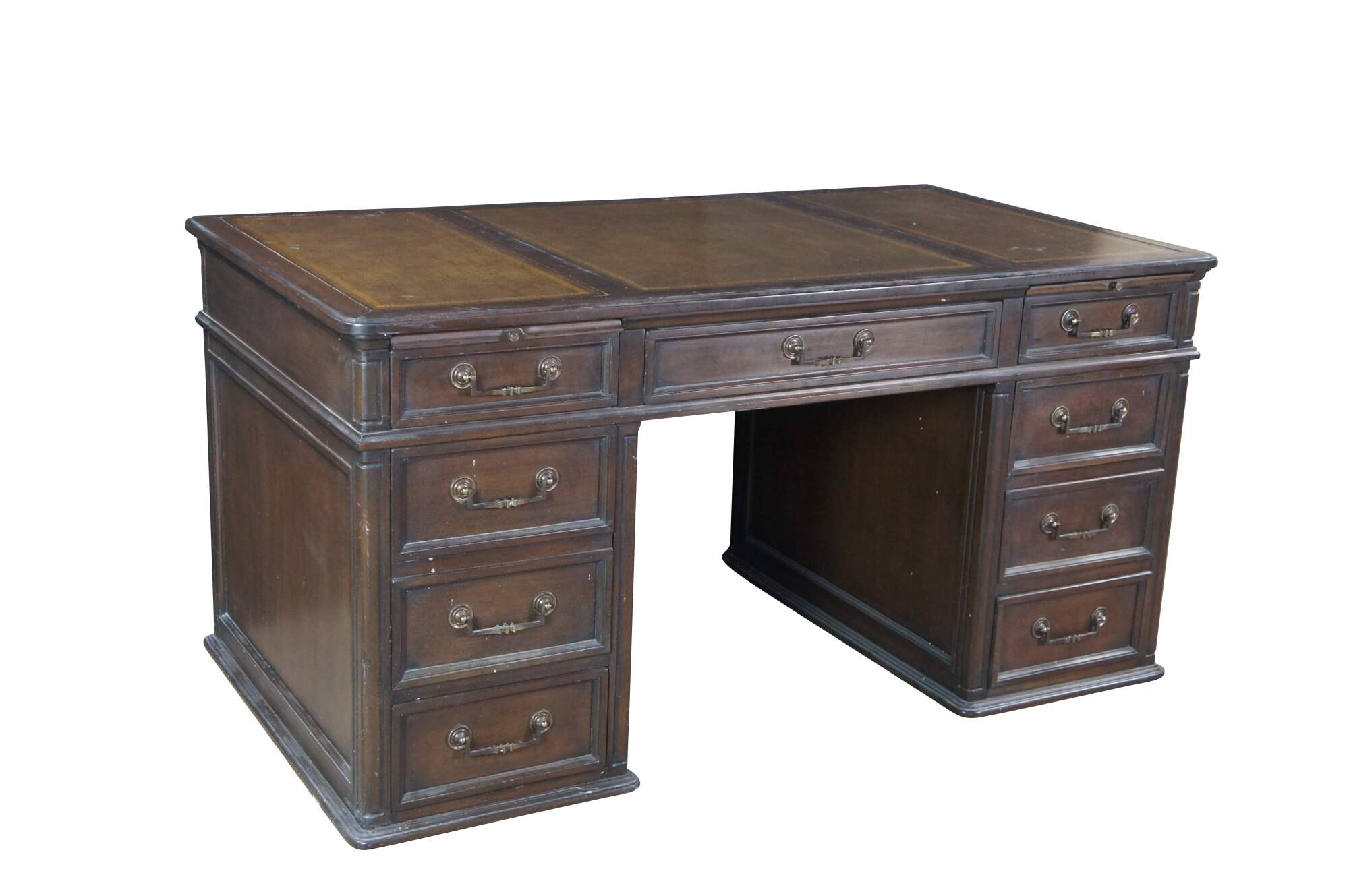 Vintage Sligh Office Desk. Features a distressed walnut finish with a green tooled leather top. The desk has eight dovetailed drawers including one filed drawer along the left. Manufactured in Holland Michigan.