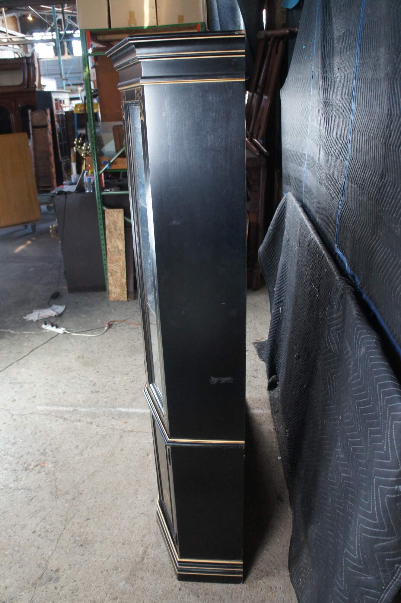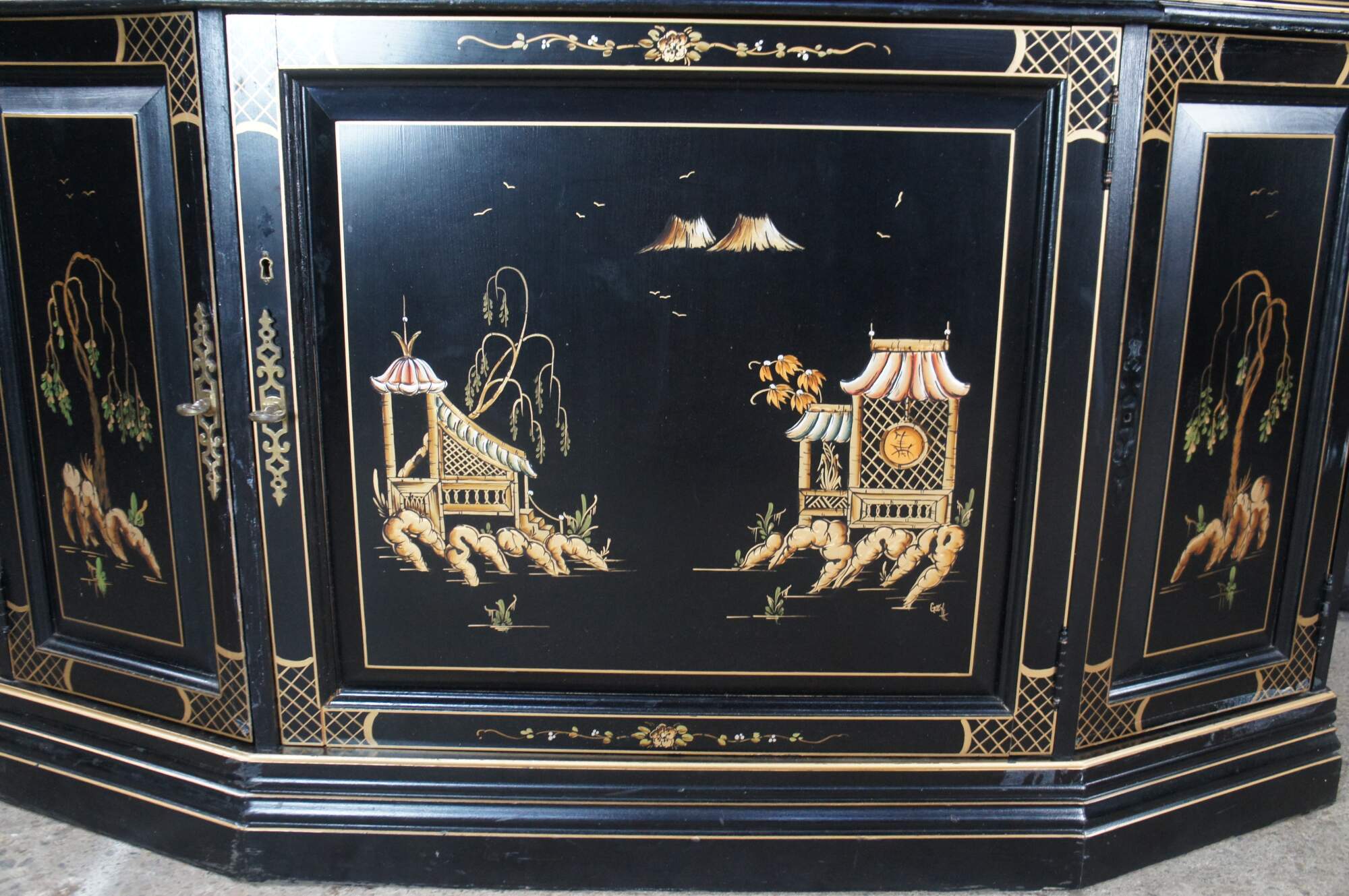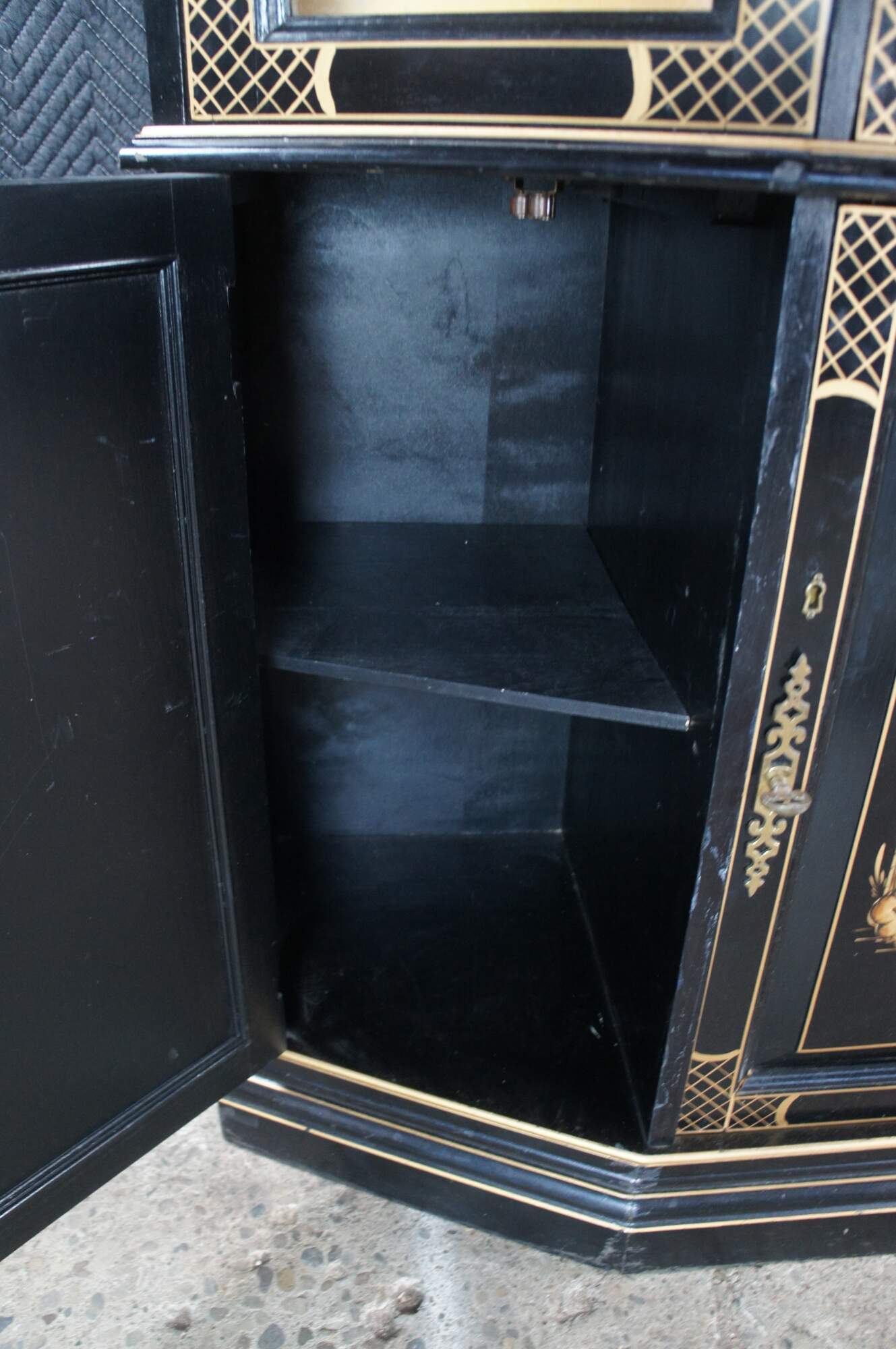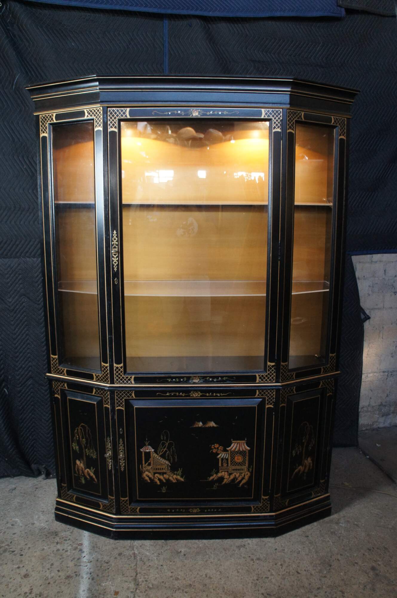Late 20th Century Chinoiserie Display Cabinet, By Jasper Cabinet Company of Jasper Indiana. Features and black and gold finish with traditional oriental motifs. The cabinet has an upper display section with two shelves over a pagoda landscape decorated base. The base has three cabinets for accessory storage.