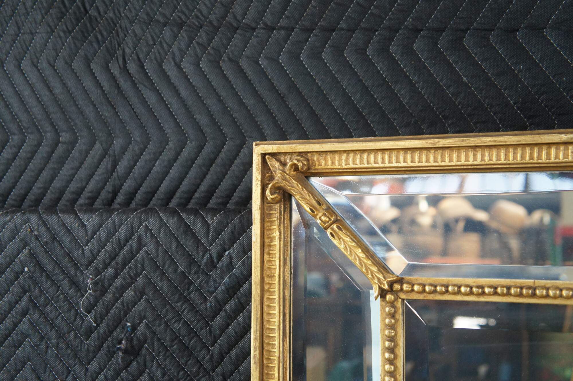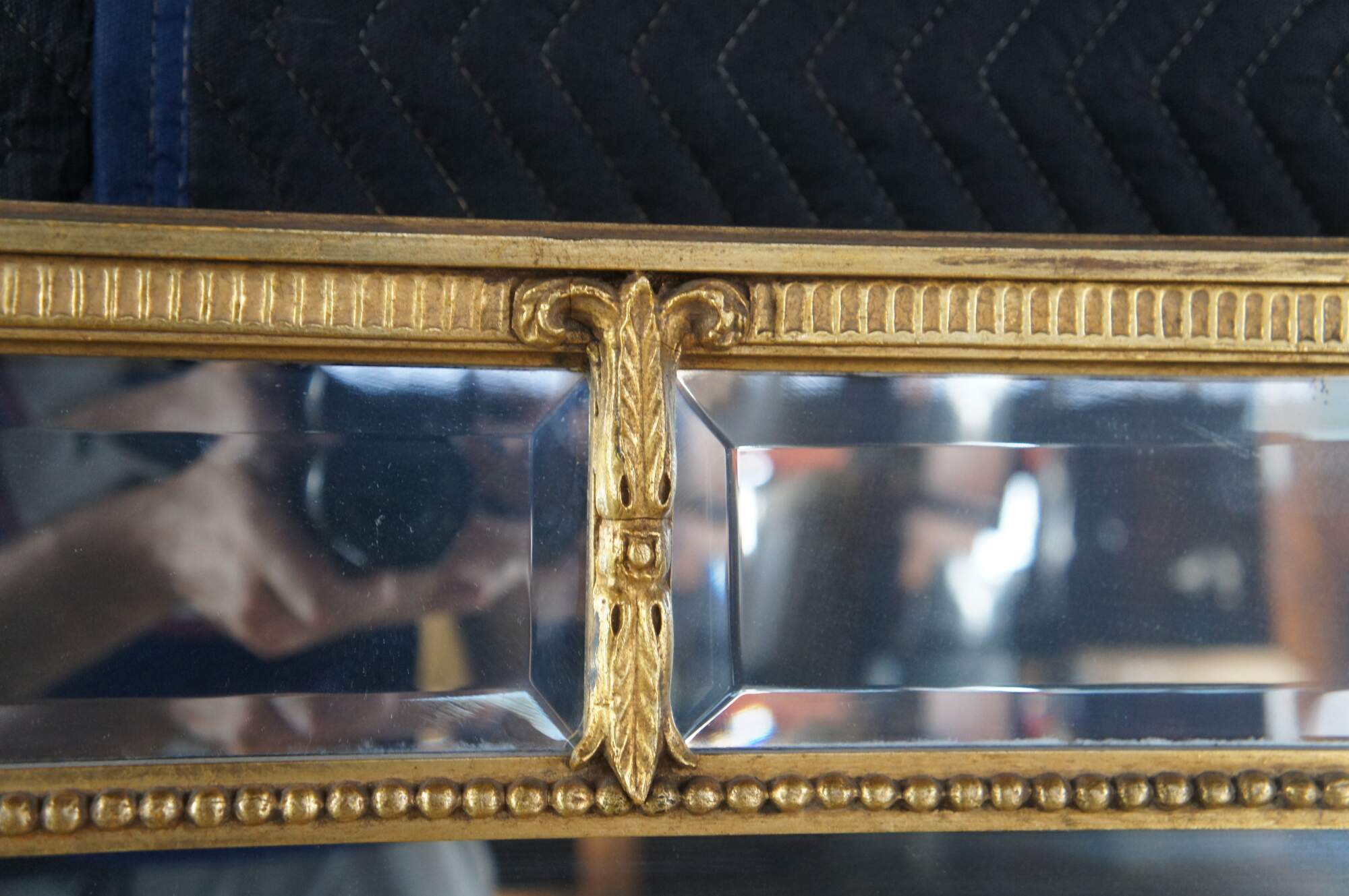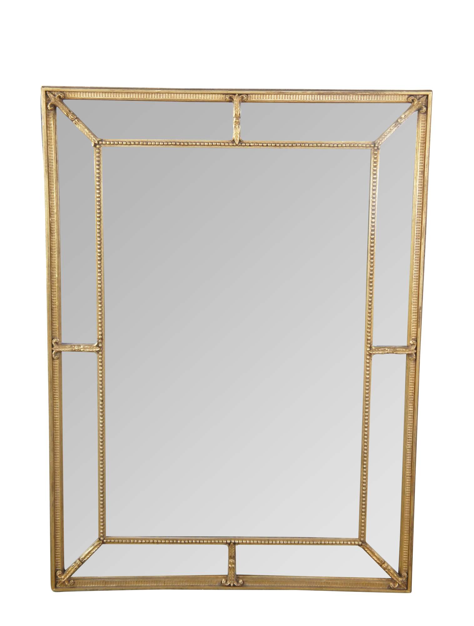 20th Century English Regency Style Giltwood Mirror by Decorative Arts Inc, New York. Circa 1970s. Features a divided framed with beveled glass set between beaded trim with fleur and acanthus detail. Makers mark along back side.
