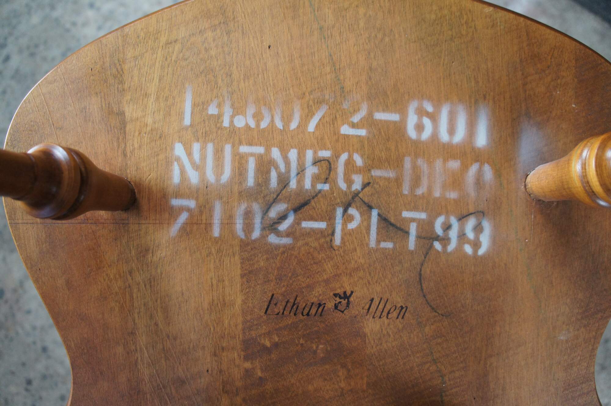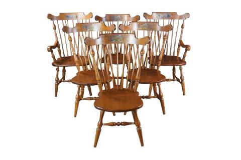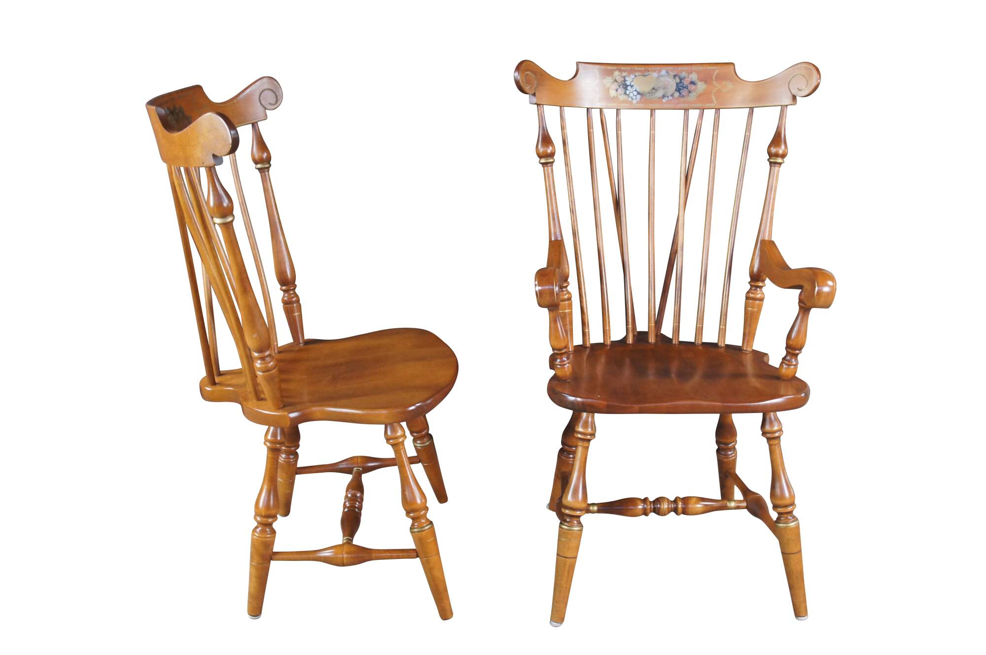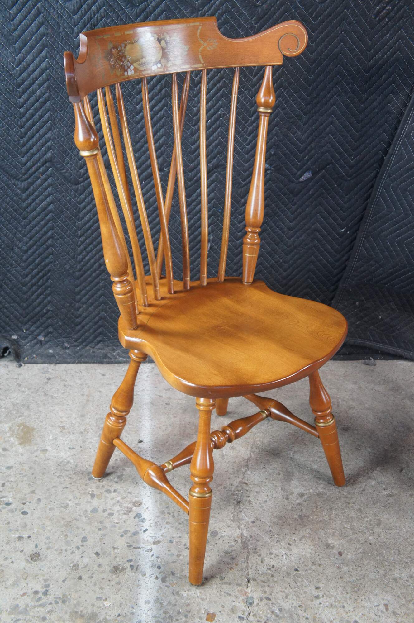 Six vintage Ethan Allen Duxbury maple nutmeg colonial / early American fiddleback dining chairs featuring a hand decorated stenciled Hitchcock style design with fruit and gold accents. Includes tufted seat cushions.