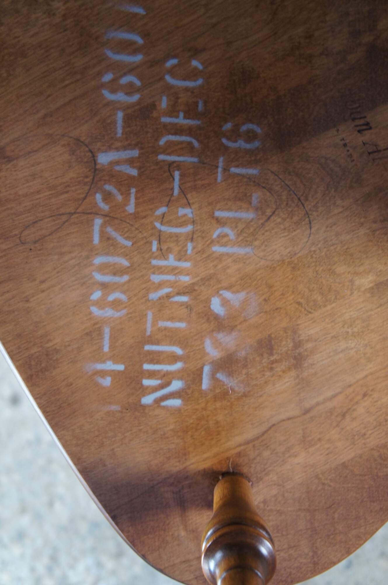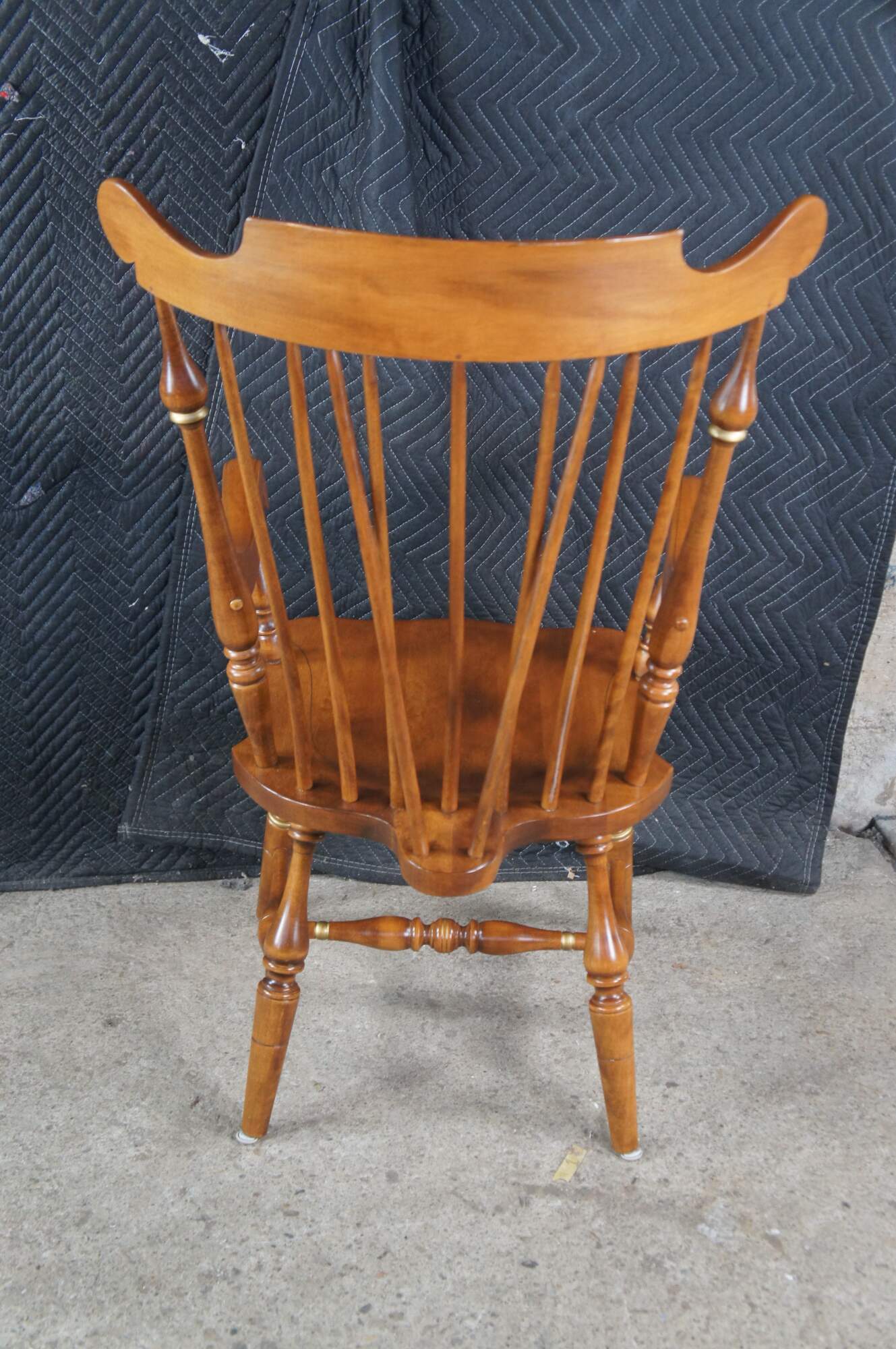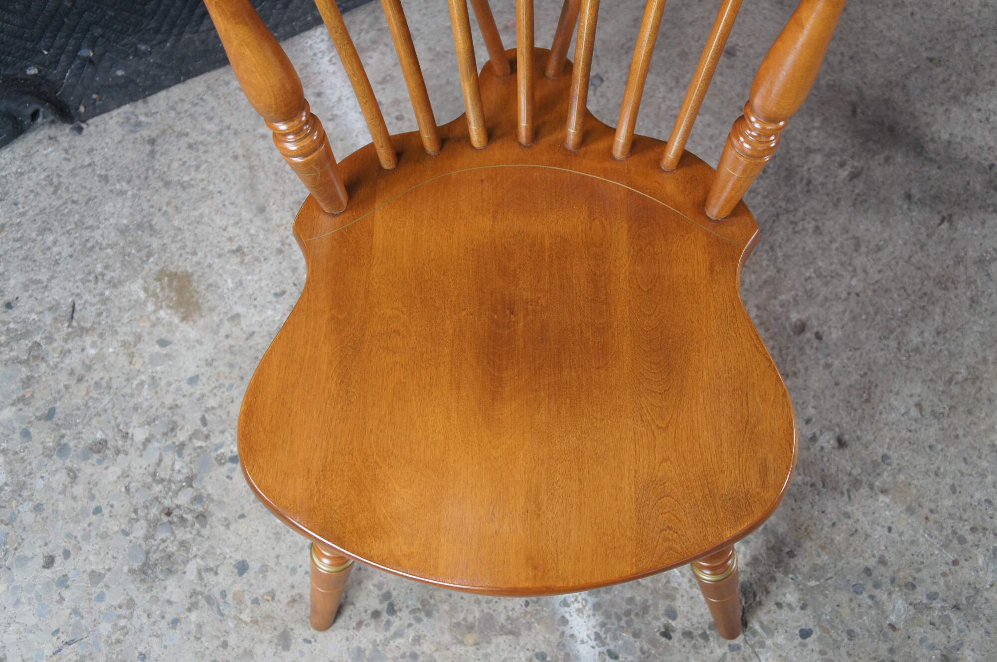 Six vintage Ethan Allen Duxbury maple nutmeg colonial / early American fiddleback dining chairs featuring a hand decorated stenciled Hitchcock style design with fruit and gold accents. Includes tufted seat cushions.