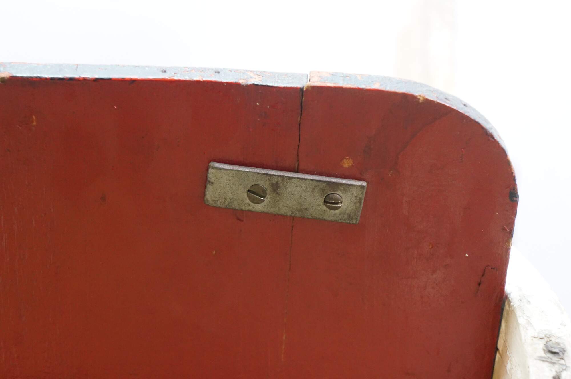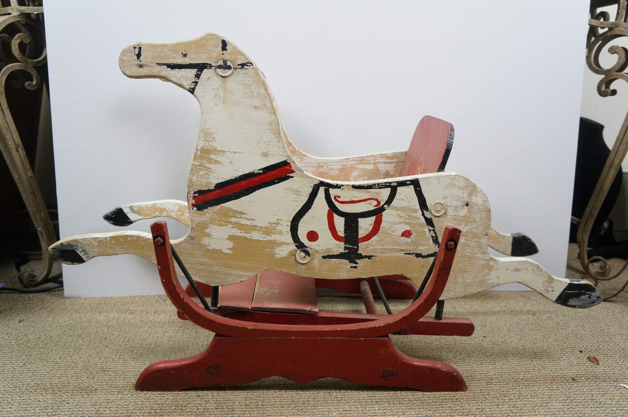 Early to mid 20th century shoo fly style rocking horse. Shoo fly (or shoofly) rocking horses feature two horse / animal shaped panels on either side of a semi-enclosed seat, making them safe rocking option for infants and toddlers that aren't ready to balance on a proper rocking horse. This horse is painted white with red and black details and red seat, handlebar, and foot rest, suspended from the red frame with metal bars, providing a glider-like rocking motion.