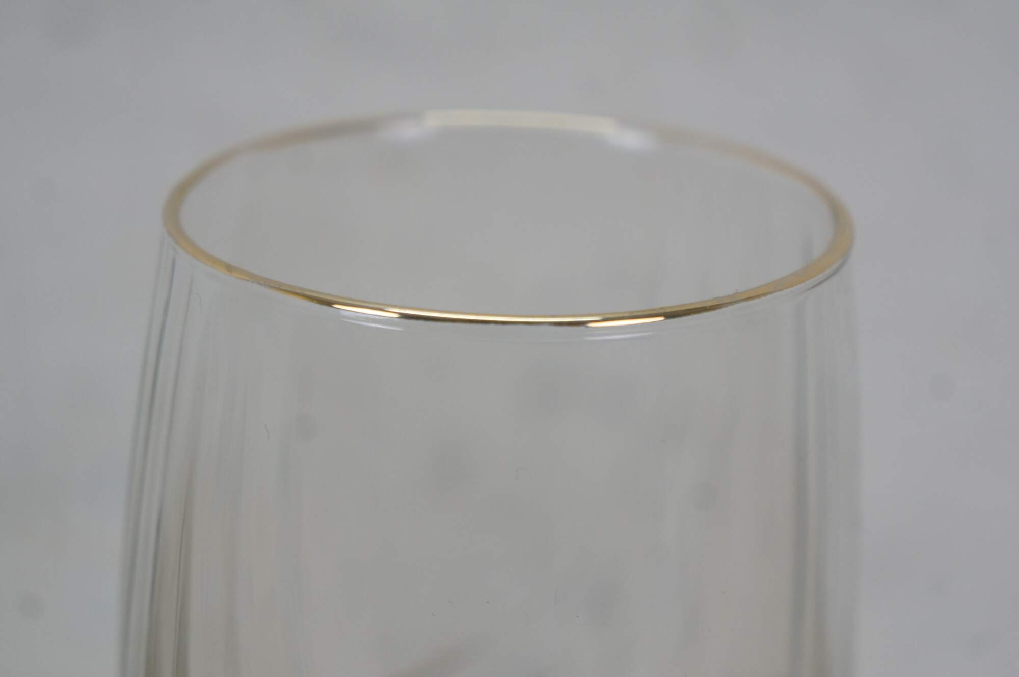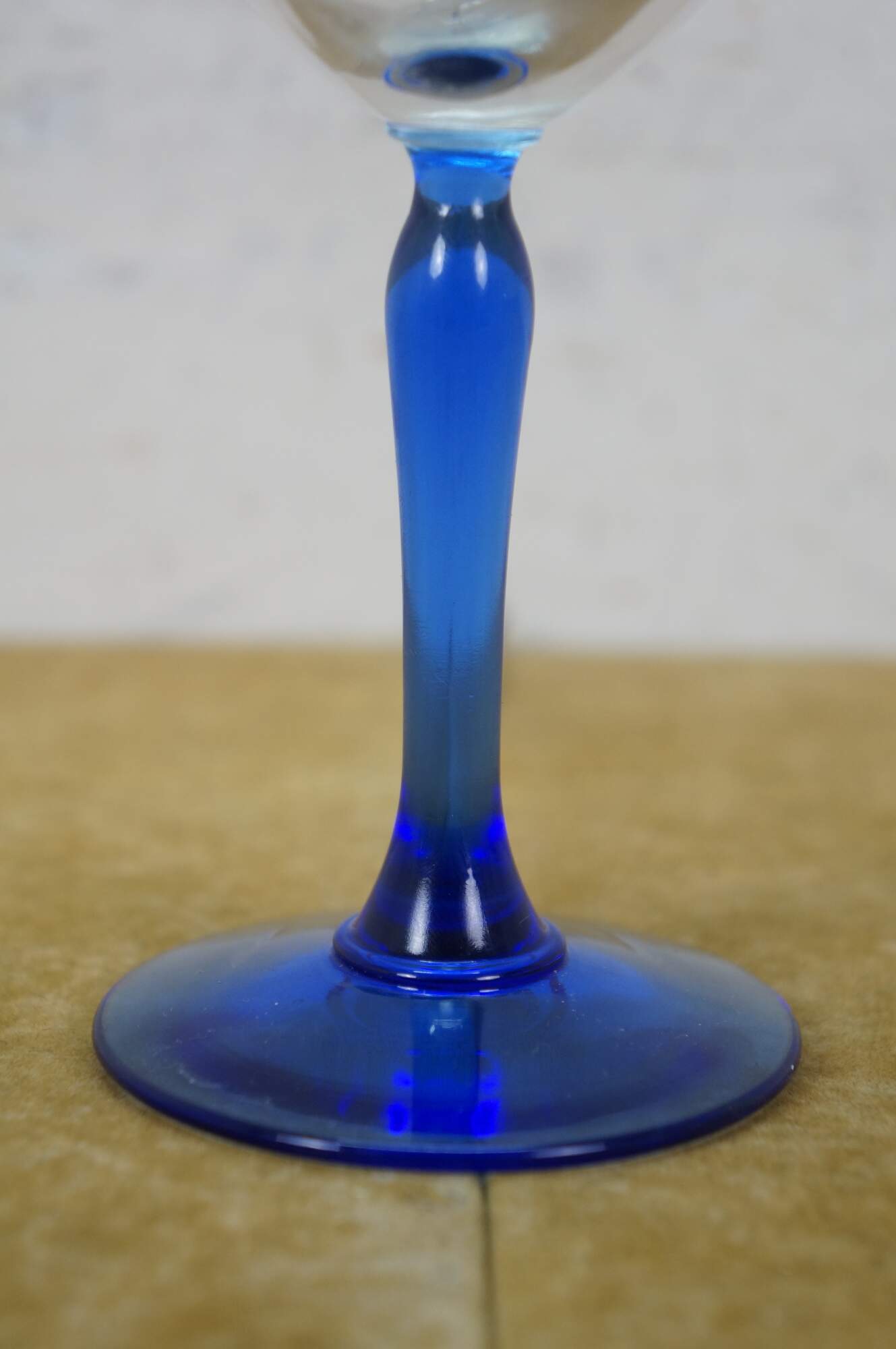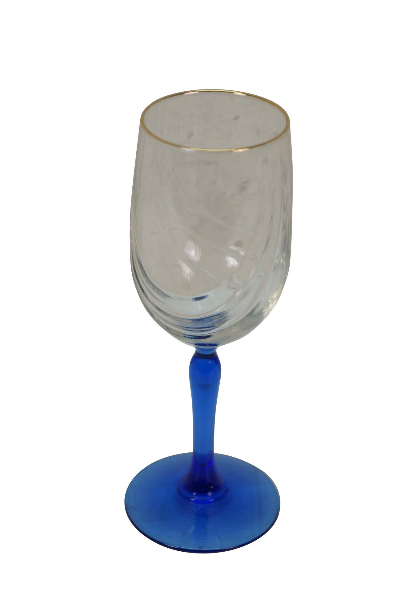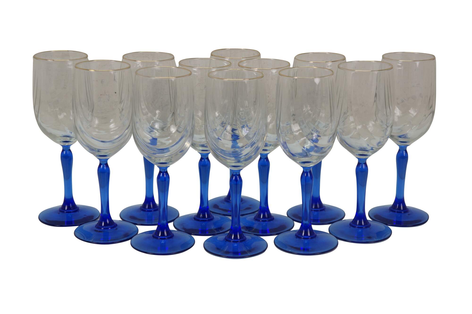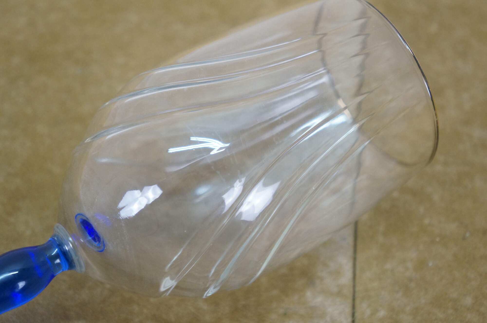 Set of 12 late 20th century Lenox Swag Drape crystal wine glasses featuring cobalt blue stems, clear bowls with swirled accents and gilt rim.