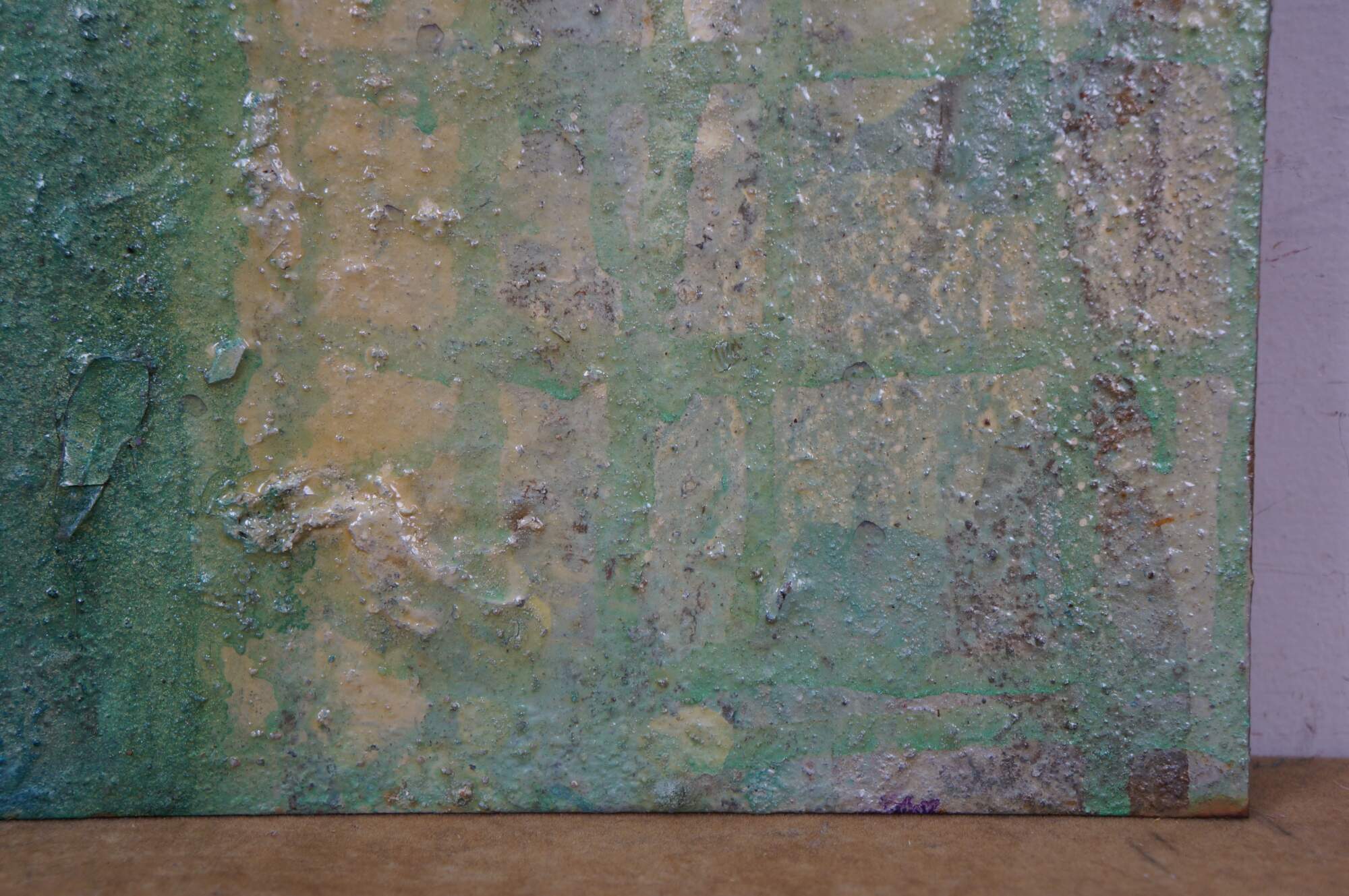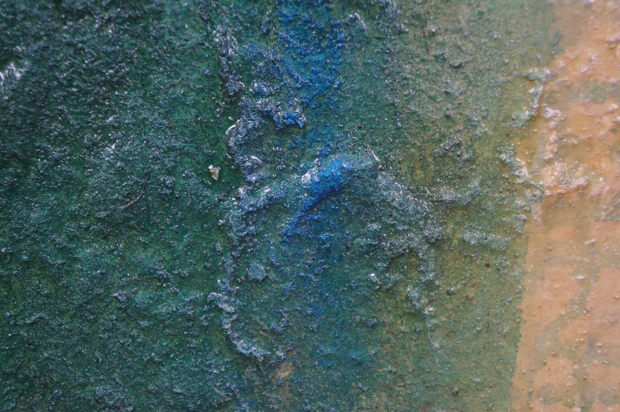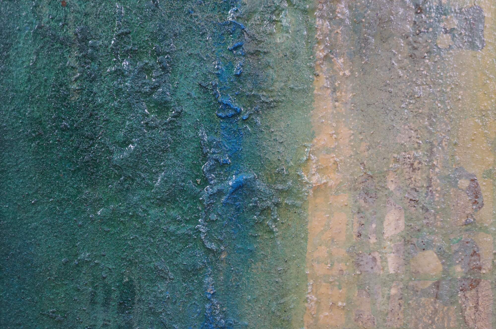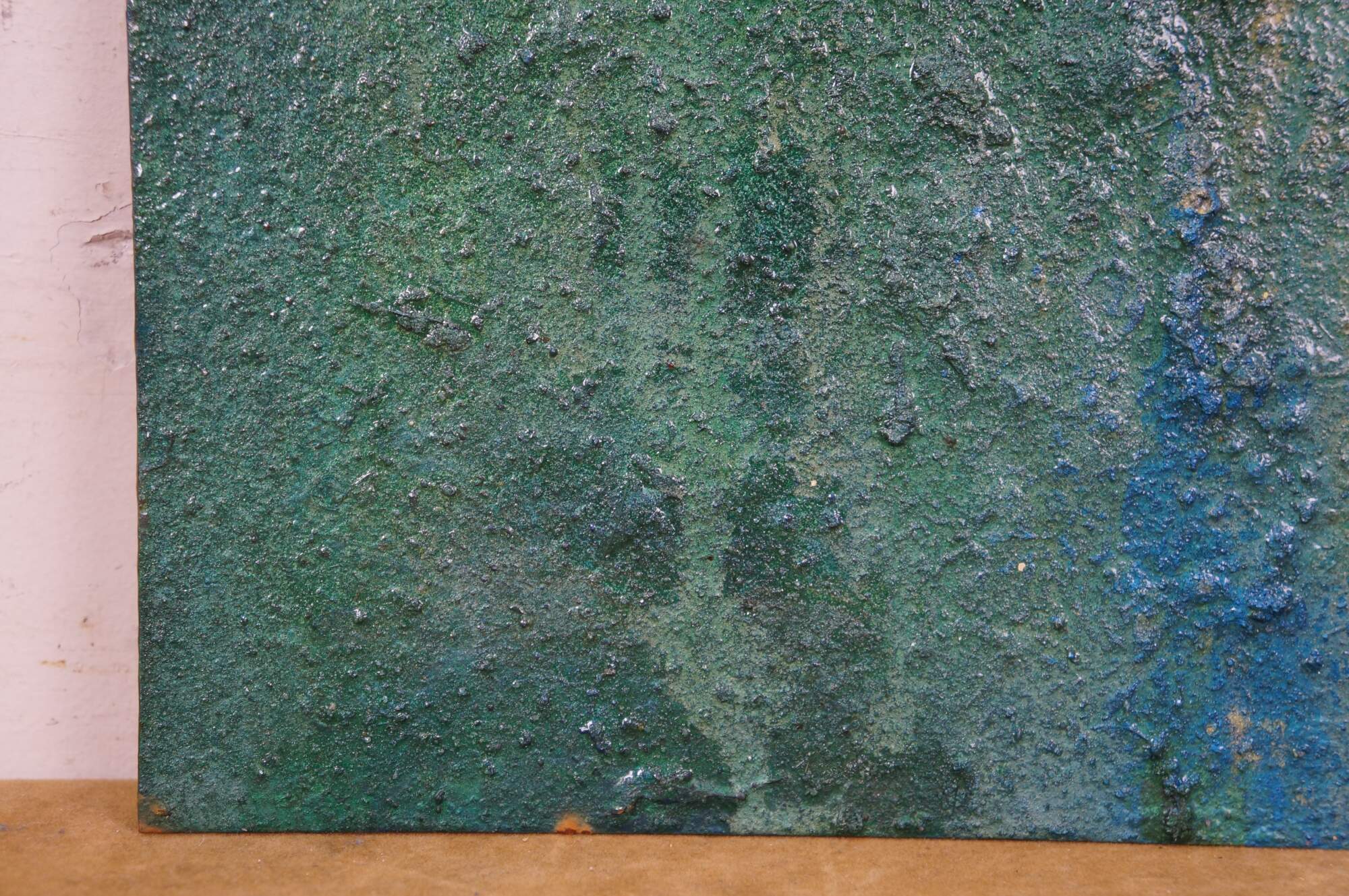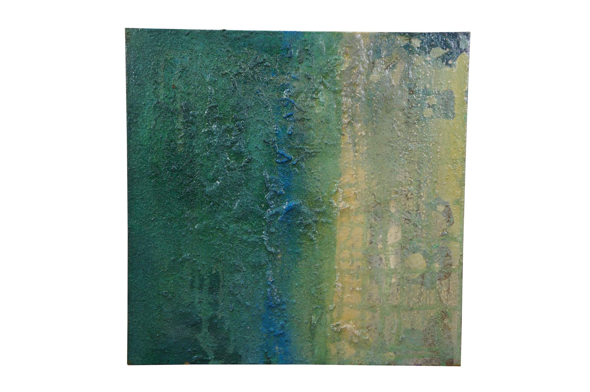 2015 modern abstract mixed media wall art - green, blue and yellow textured enameled paint on metal panel by artist Mike Elsass.