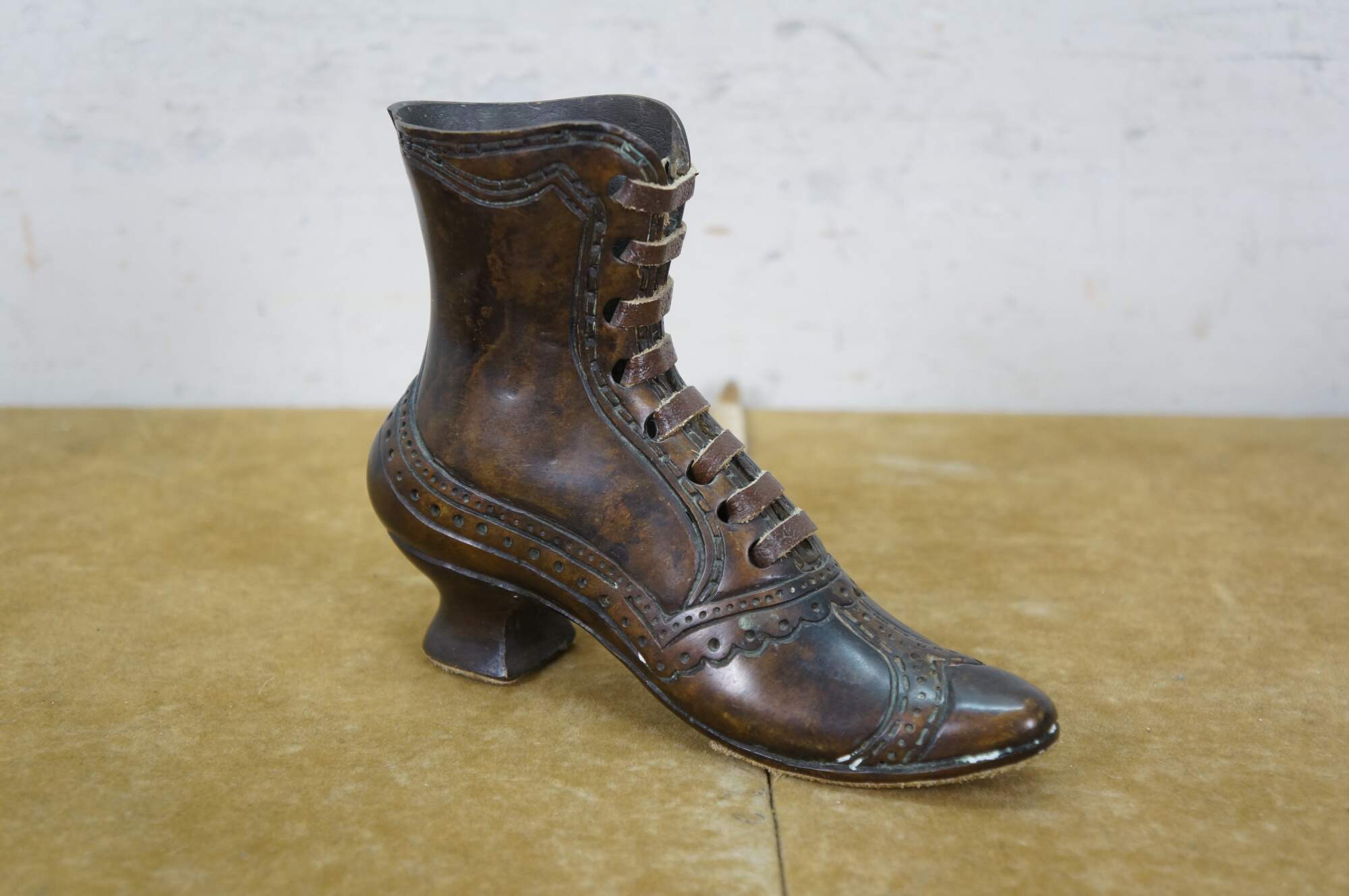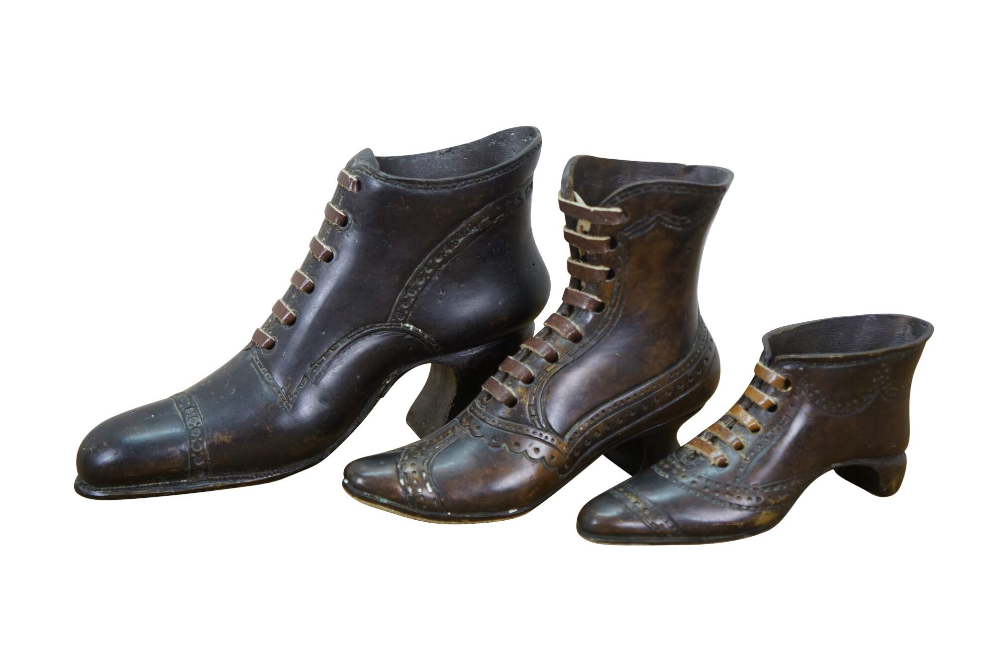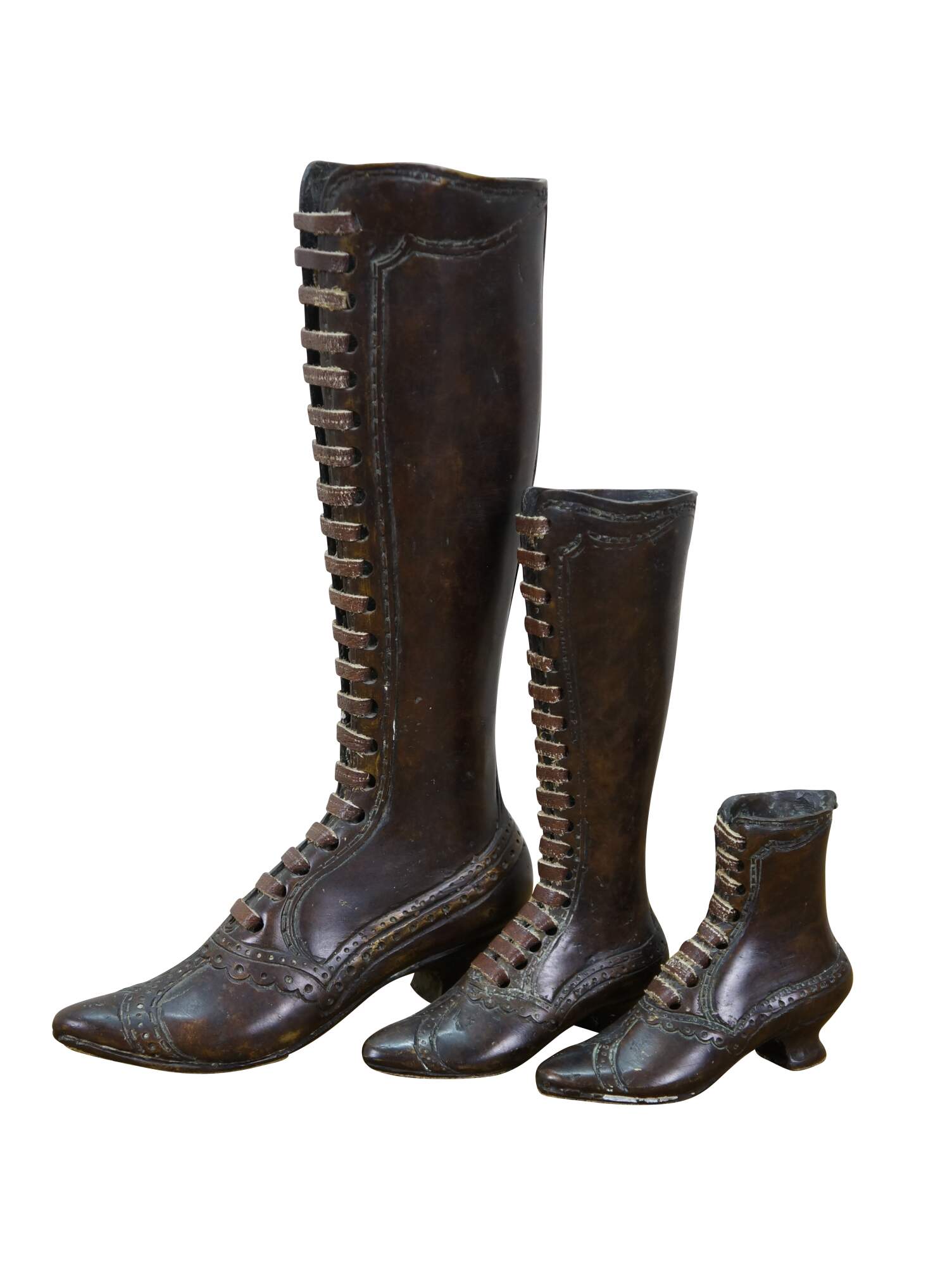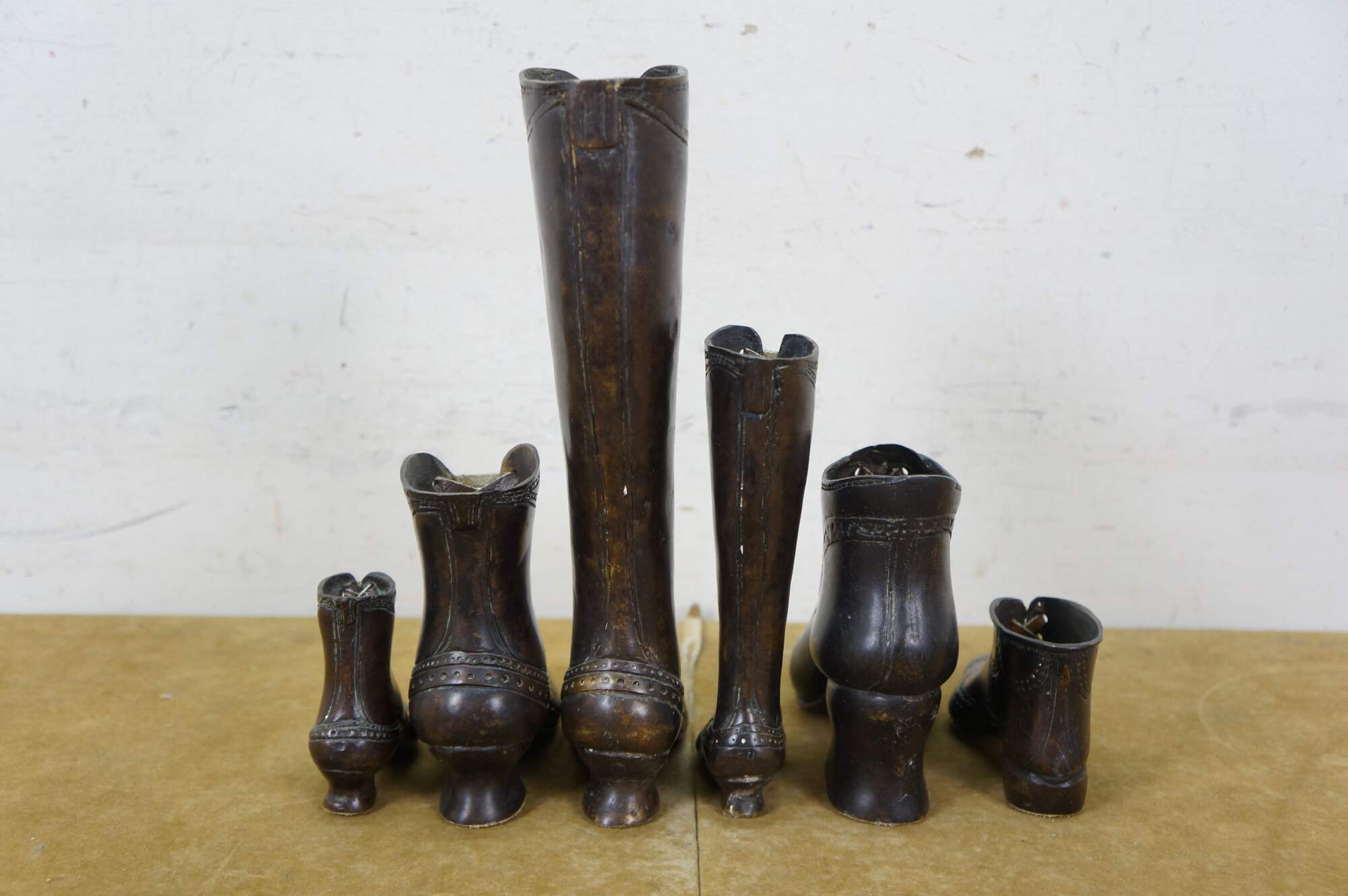 Set of six late 20th century Theodore Alexander bronze figurines in the shape of Victorian boots in a variety of heights and styles. Leather laces and pads on the soles.