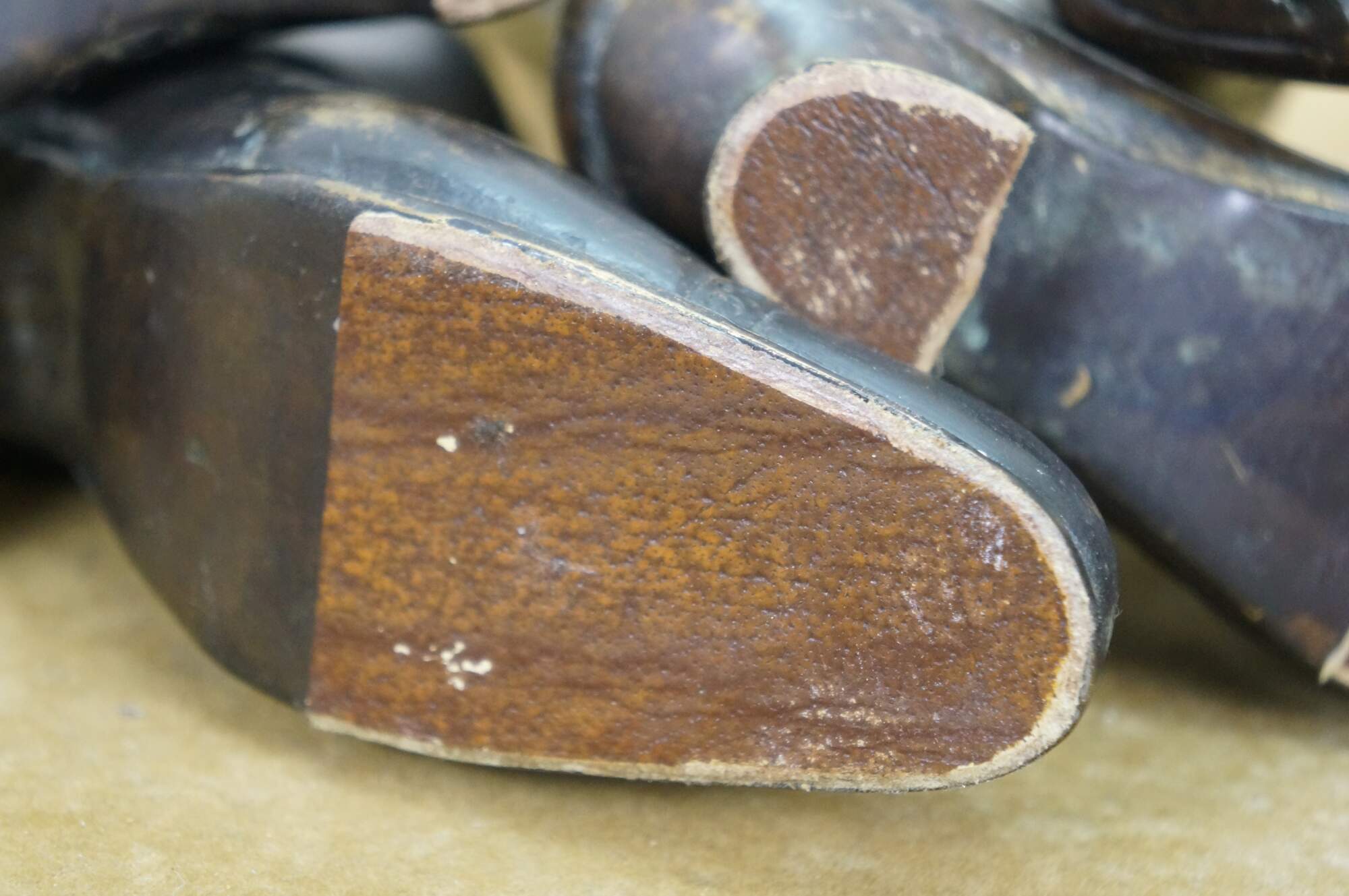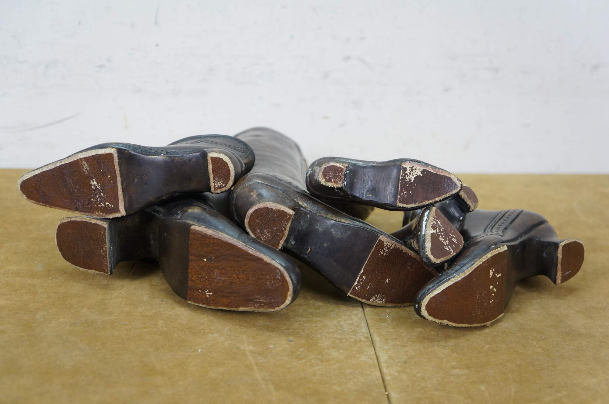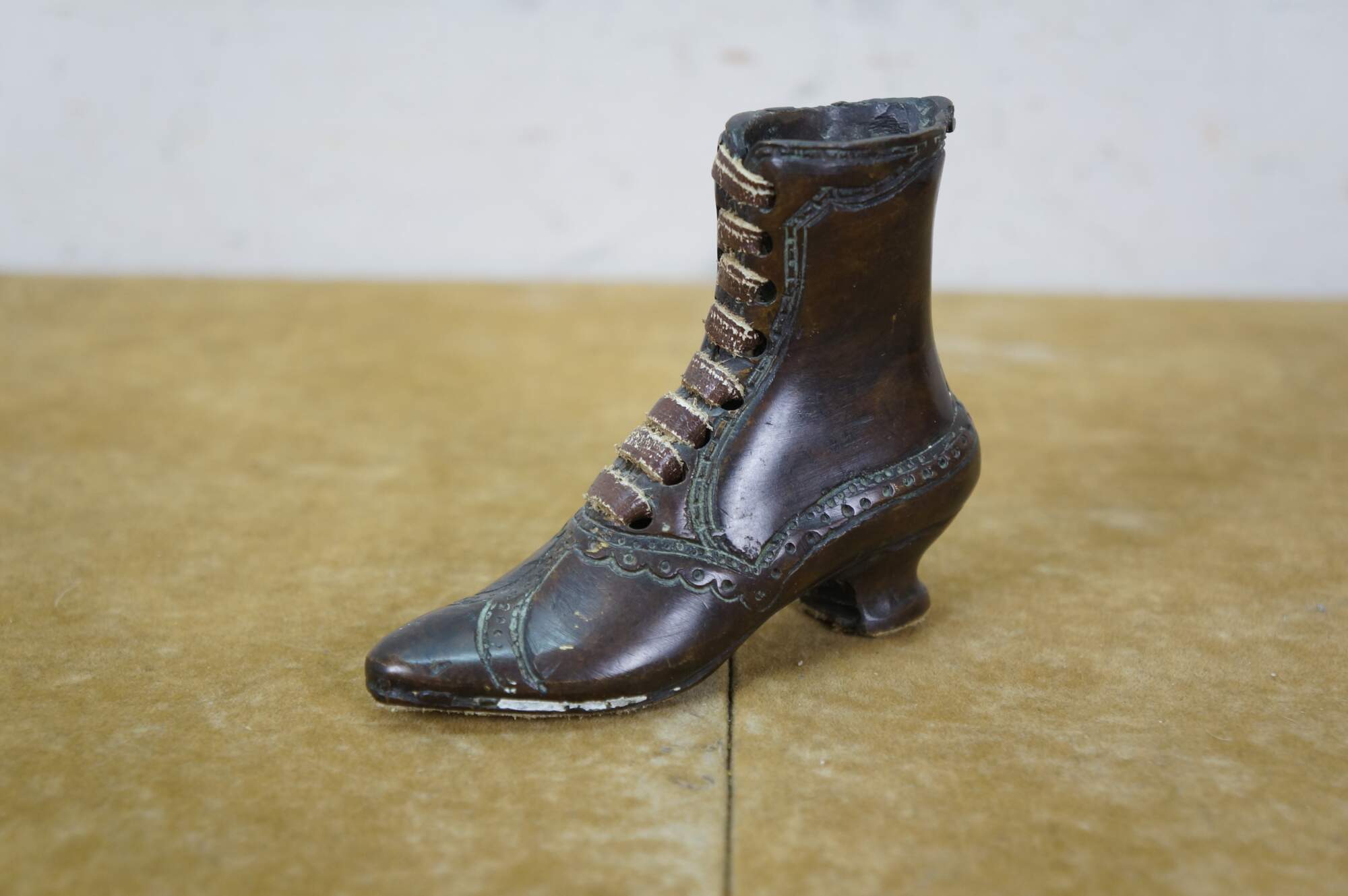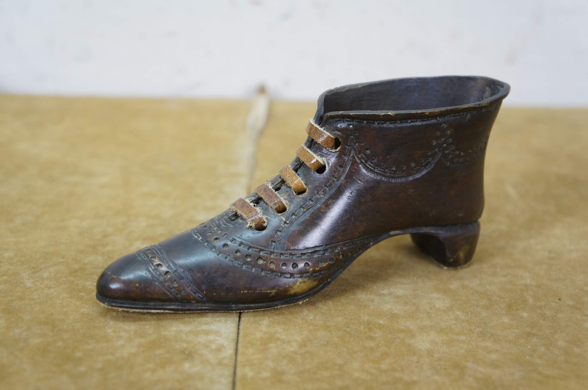 Set of six late 20th century Theodore Alexander bronze figurines in the shape of Victorian boots in a variety of heights and styles. Leather laces and pads on the soles.
