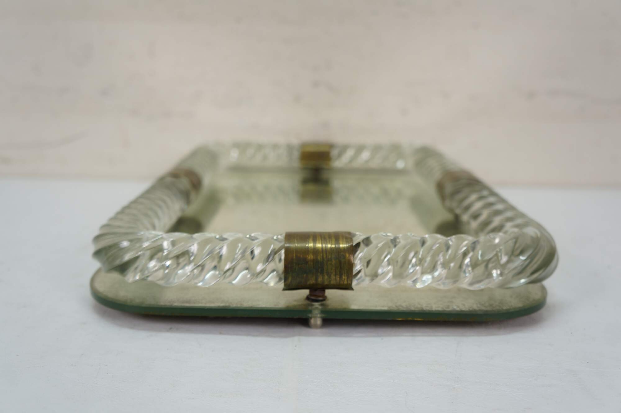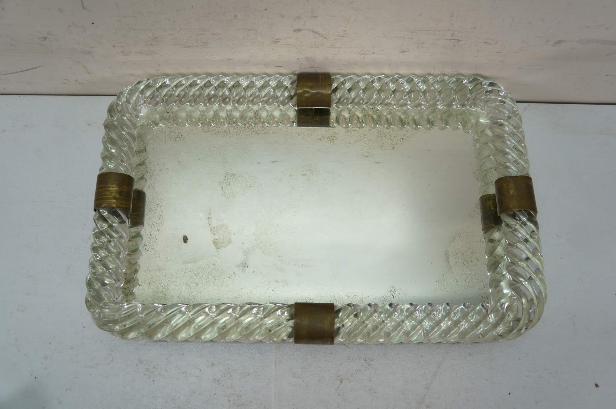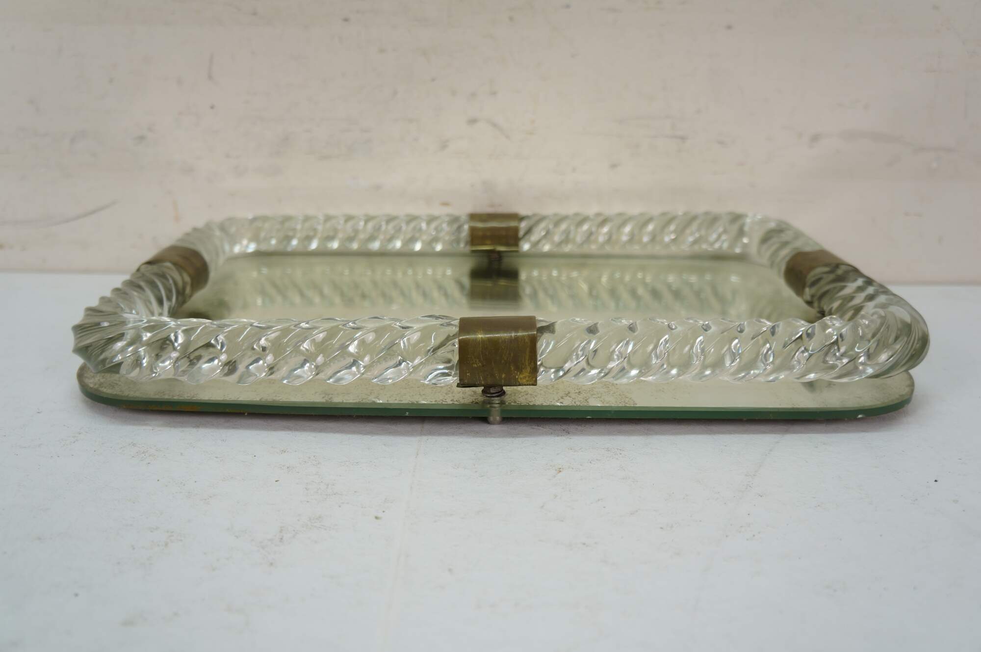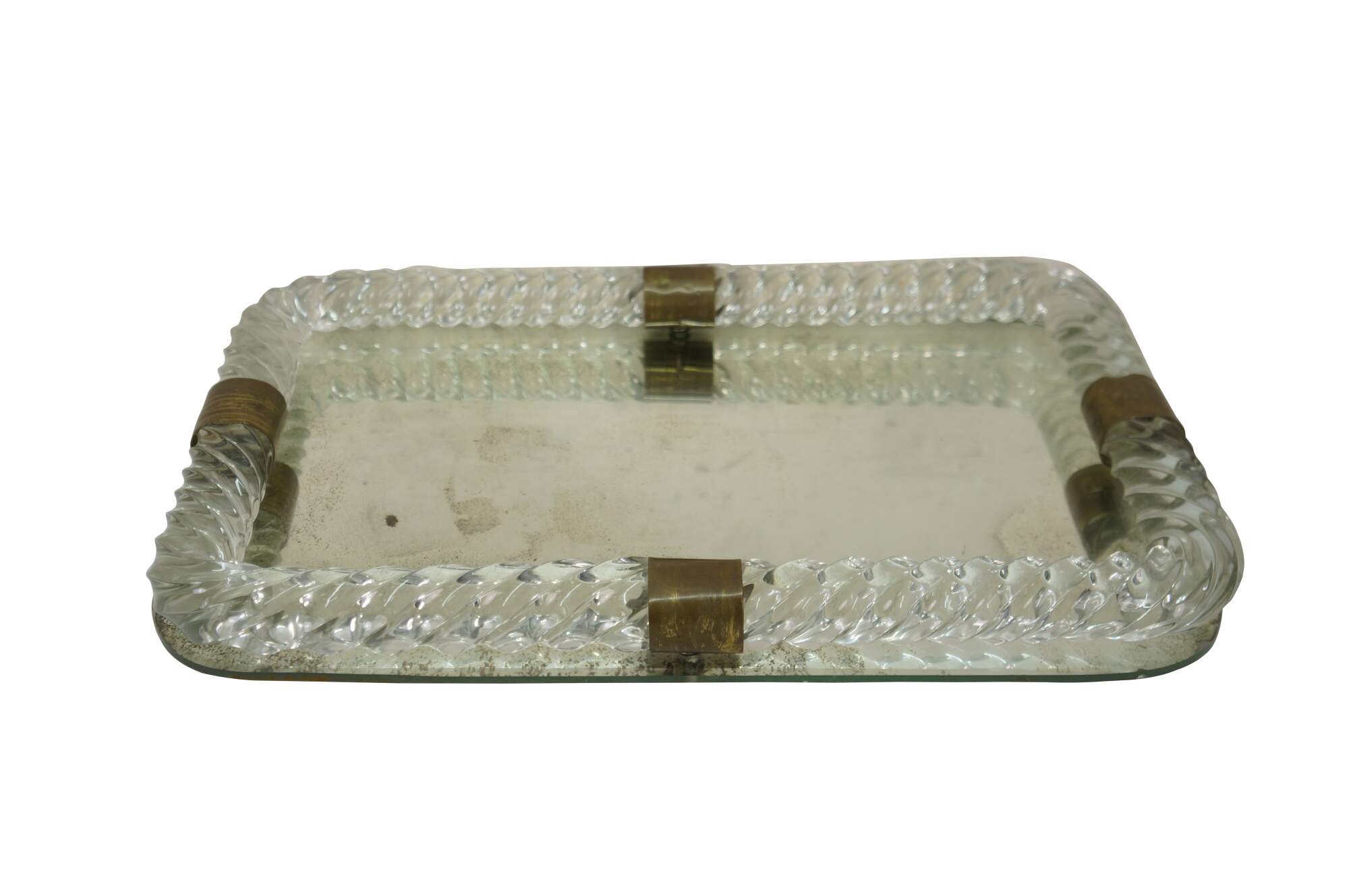 Mid 20th century Italian Murano art glass mirrored vanity / perfume / bar tray attributed to Venini Seguso. Art Deco / Hollywood Regency styling. Rounded rectangle mirrored base, trimmed with a gallery of clear rope twist glass, bound at the center of each side with plain brass bands.