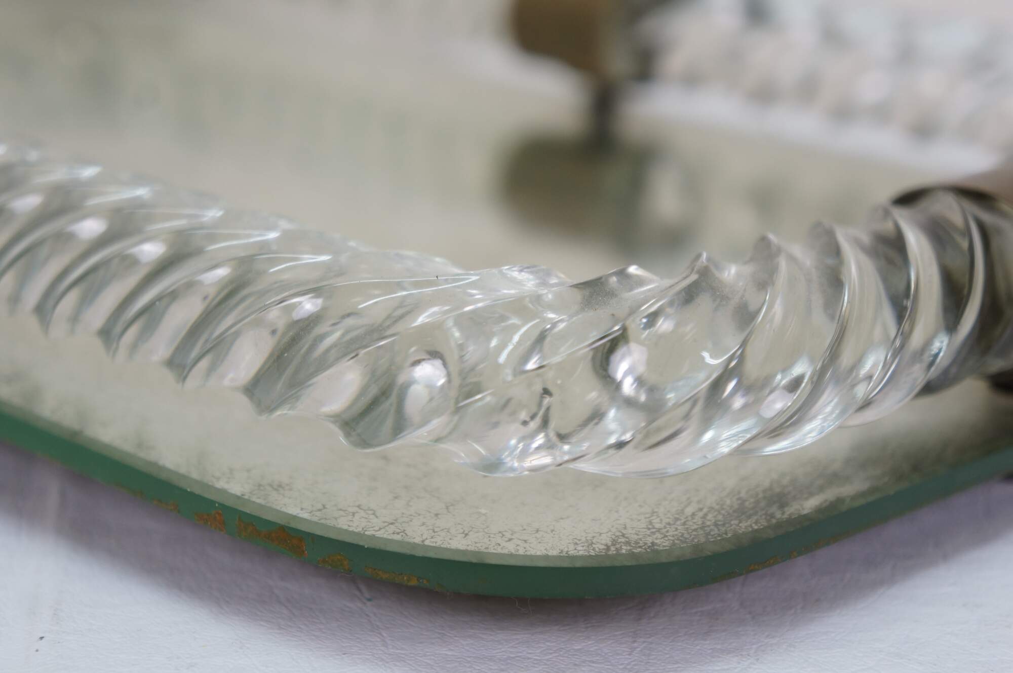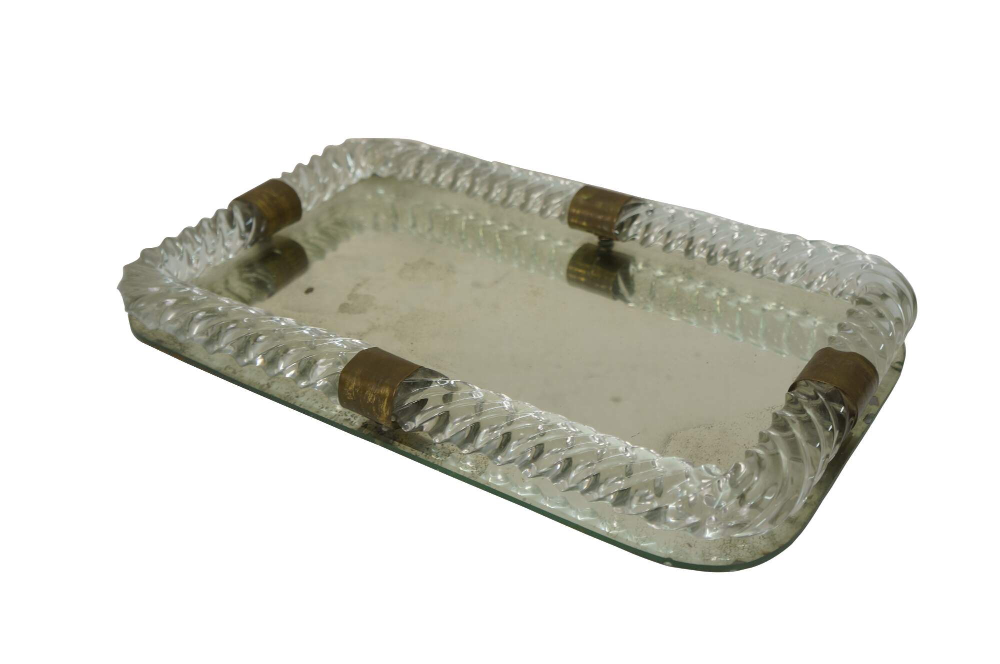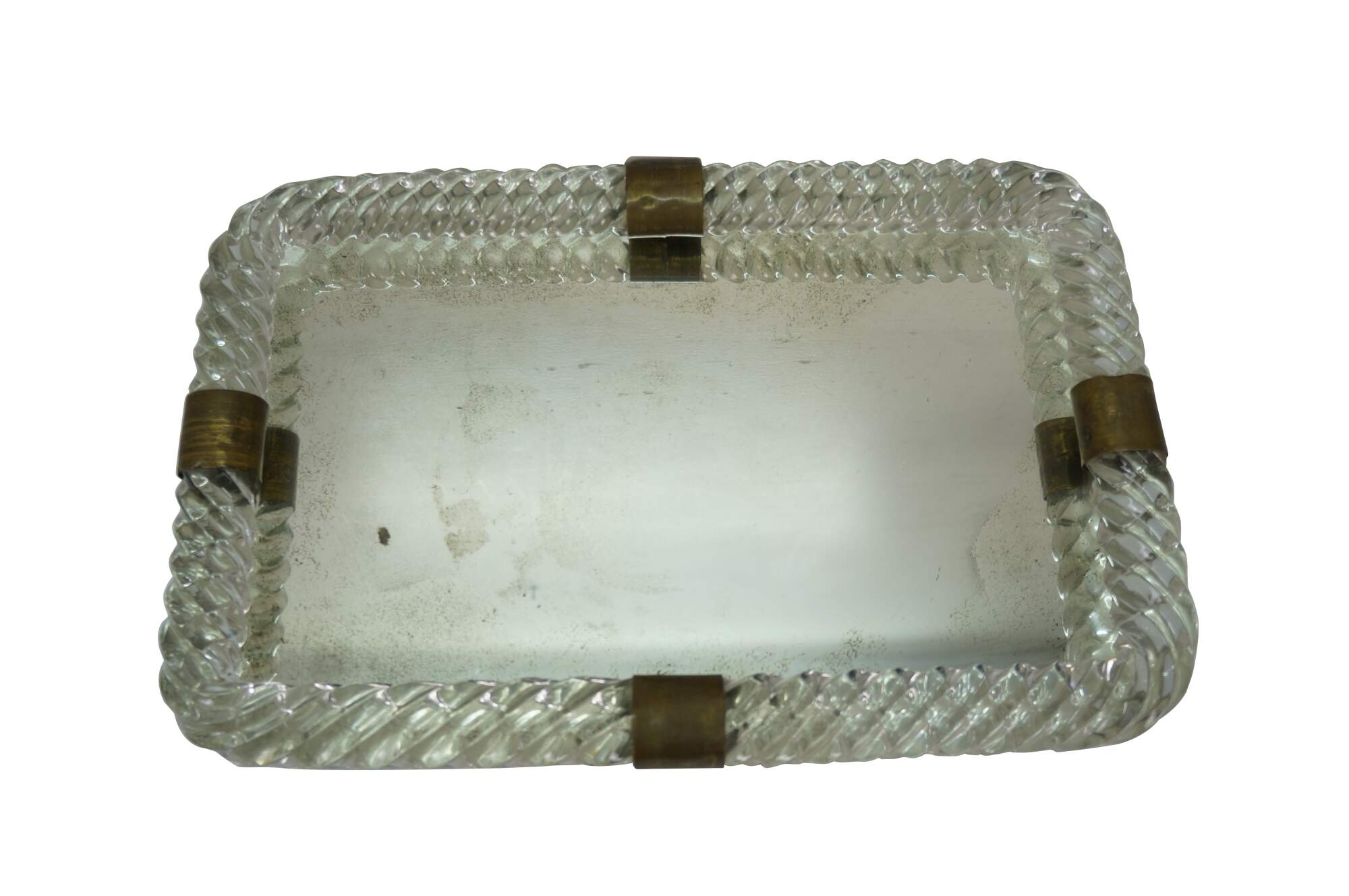 Mid 20th century Italian Murano art glass mirrored vanity / perfume / bar tray attributed to Venini Seguso. Art Deco / Hollywood Regency styling. Rounded rectangle mirrored base, trimmed with a gallery of clear rope twist glass, bound at the center of each side with plain brass bands.