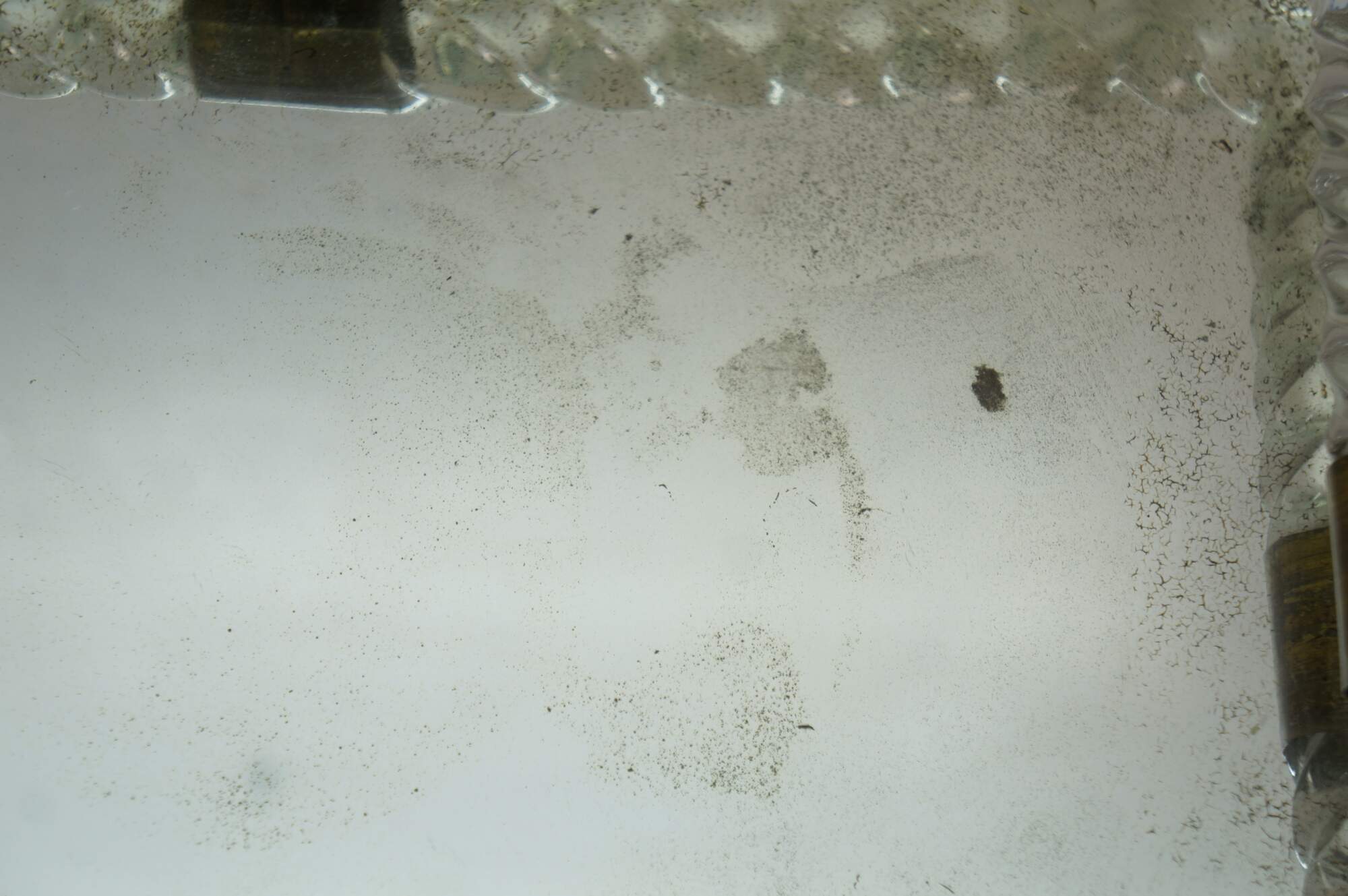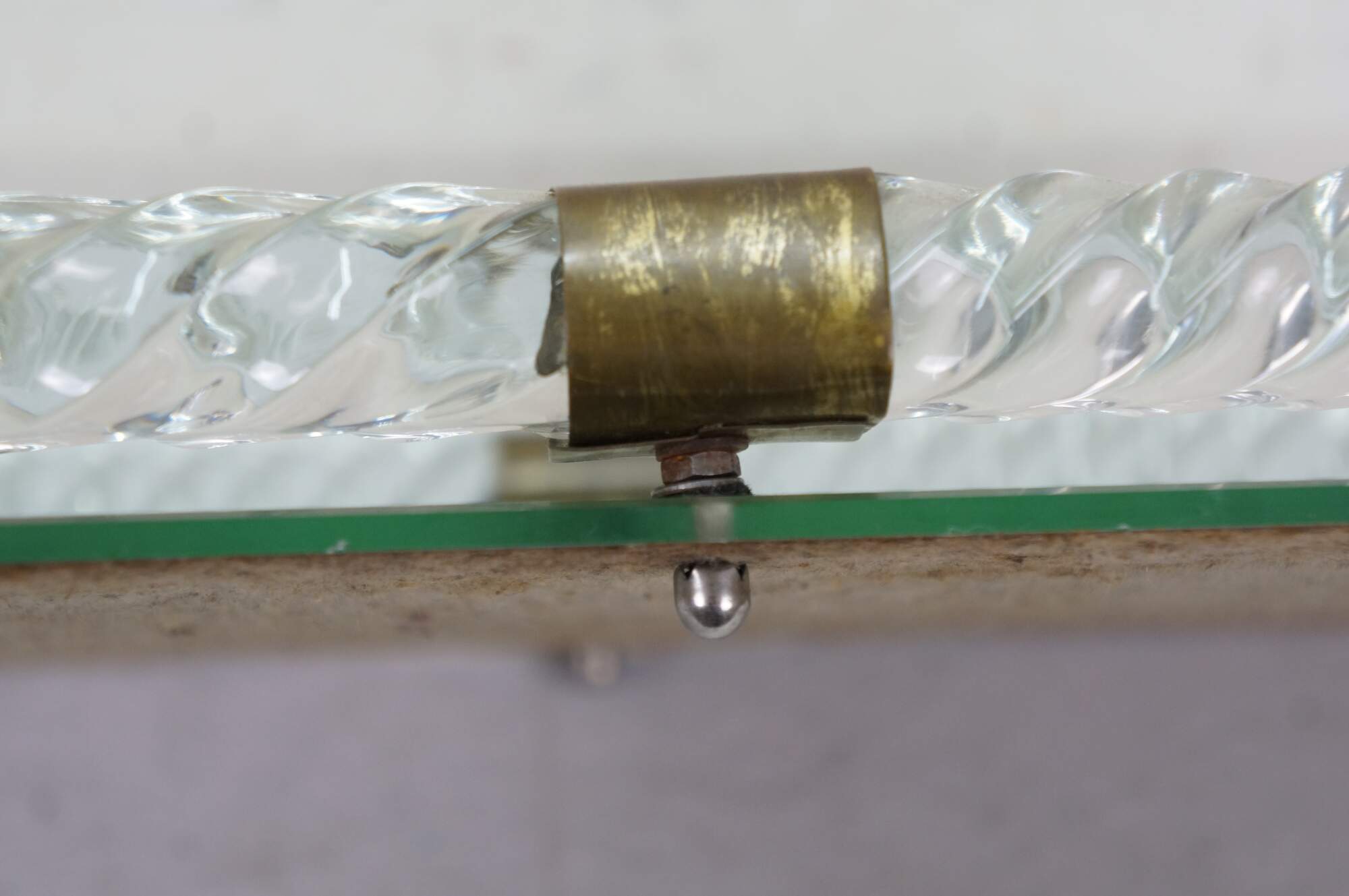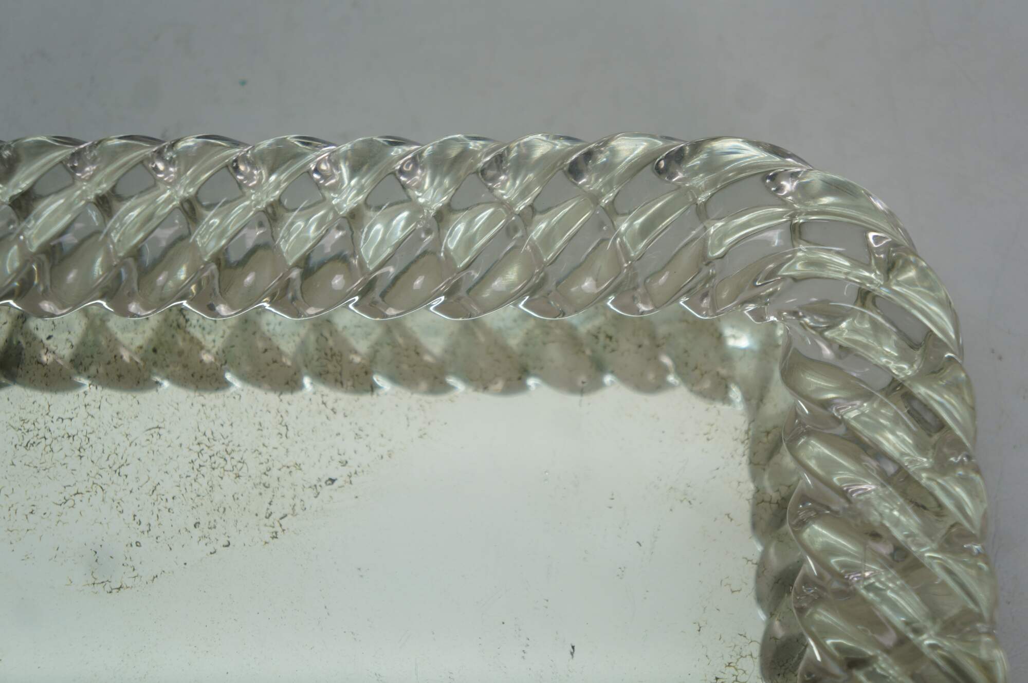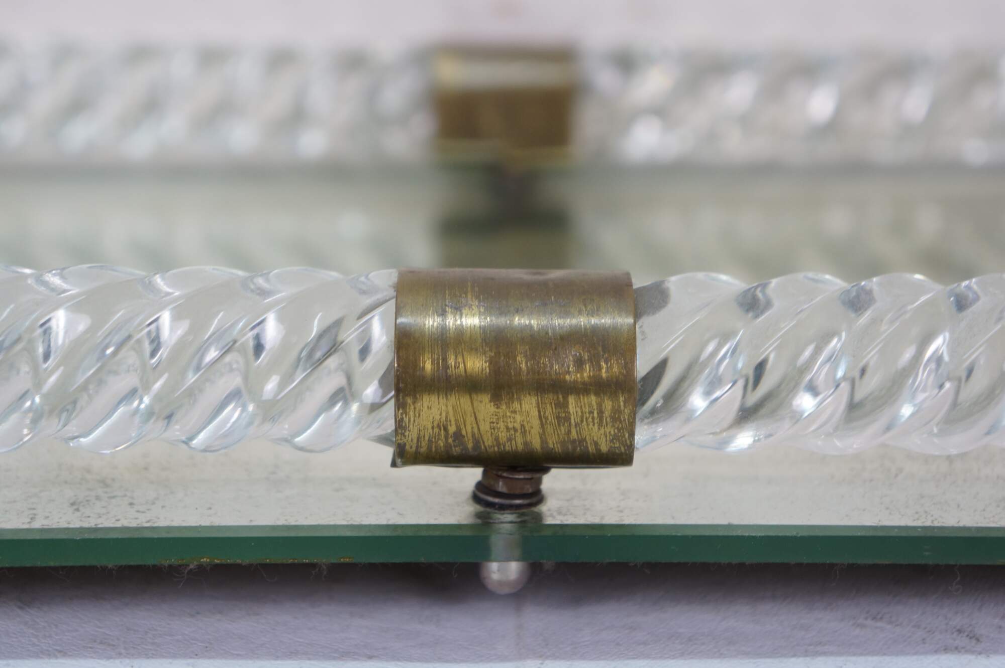 Mid 20th century Italian Murano art glass mirrored vanity / perfume / bar tray attributed to Venini Seguso. Art Deco / Hollywood Regency styling. Rounded rectangle mirrored base, trimmed with a gallery of clear rope twist glass, bound at the center of each side with plain brass bands.