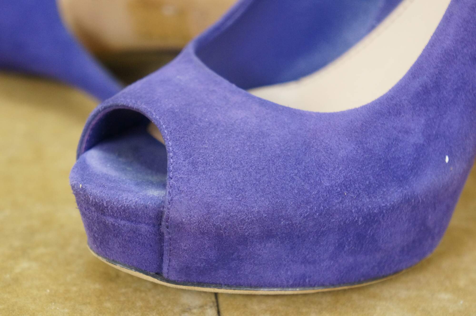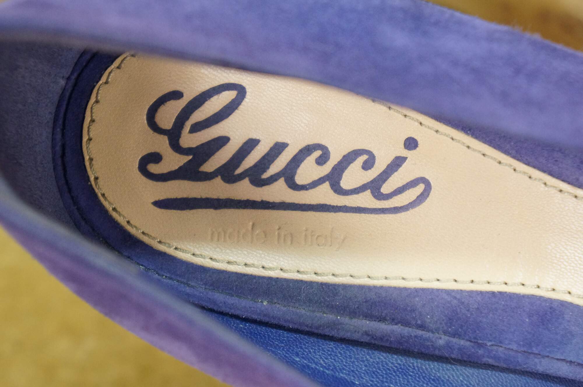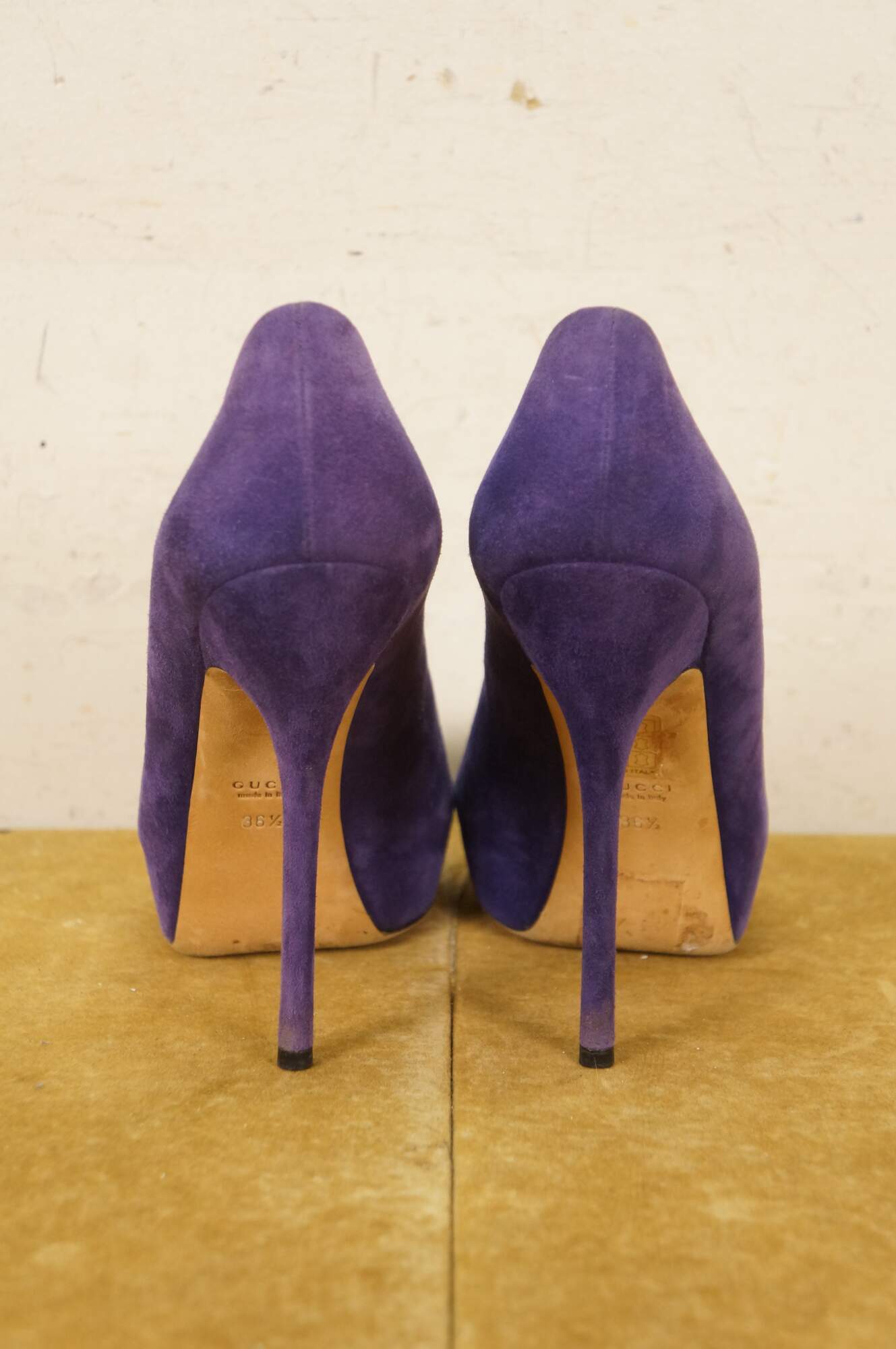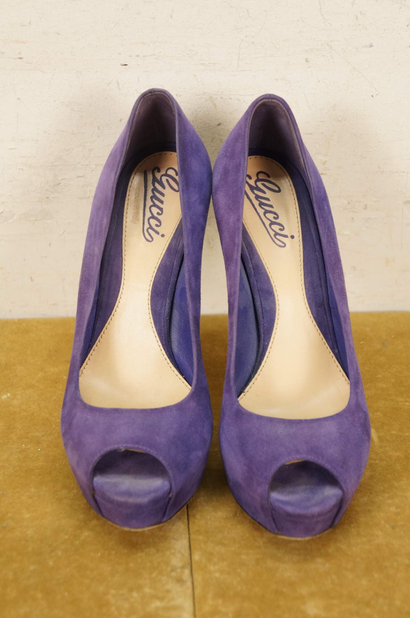 Vintage Gucci Sophia royal purple suede platform pumps with stiletto high heel and peep toe. Made in Italy. 252133