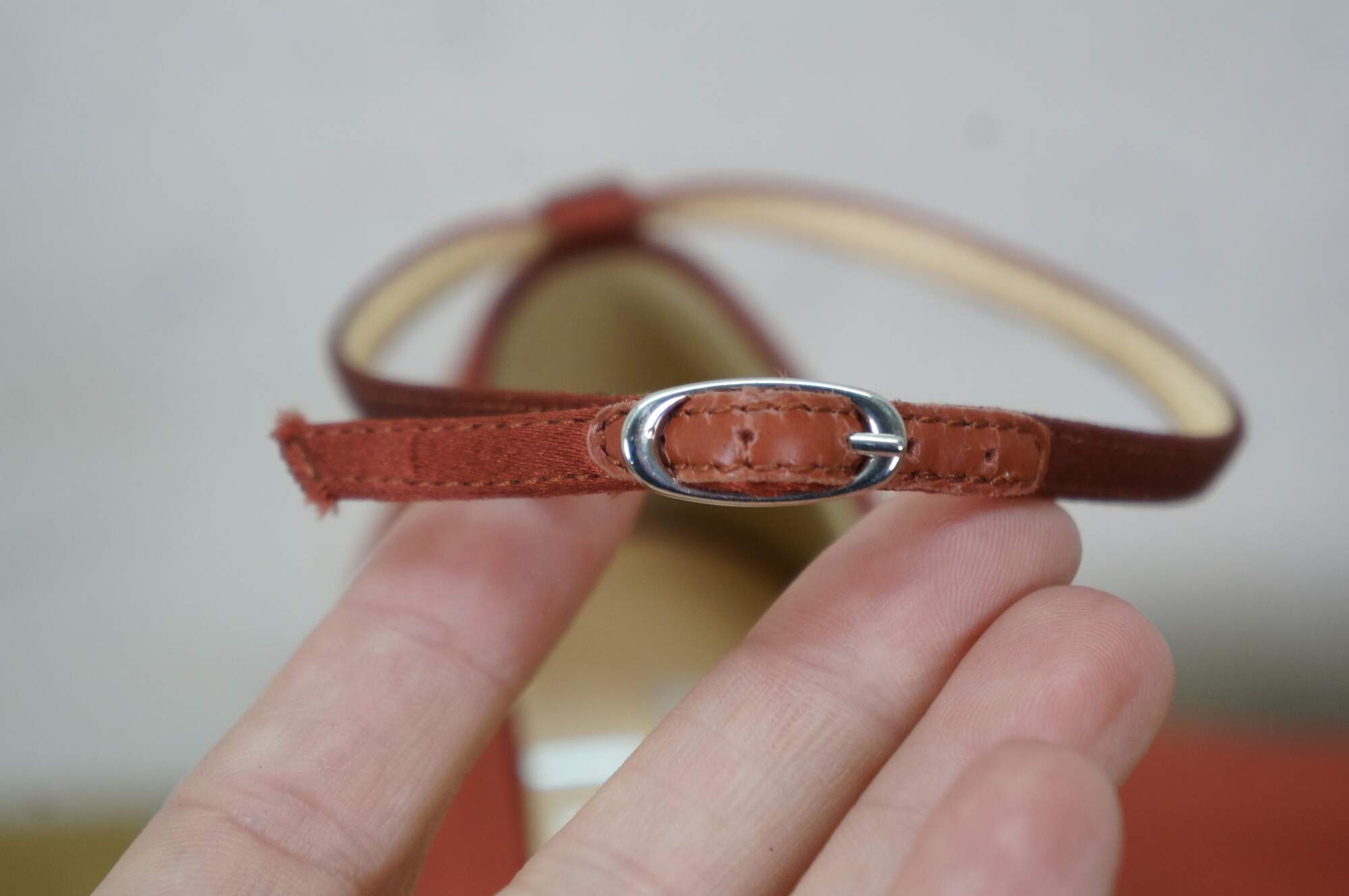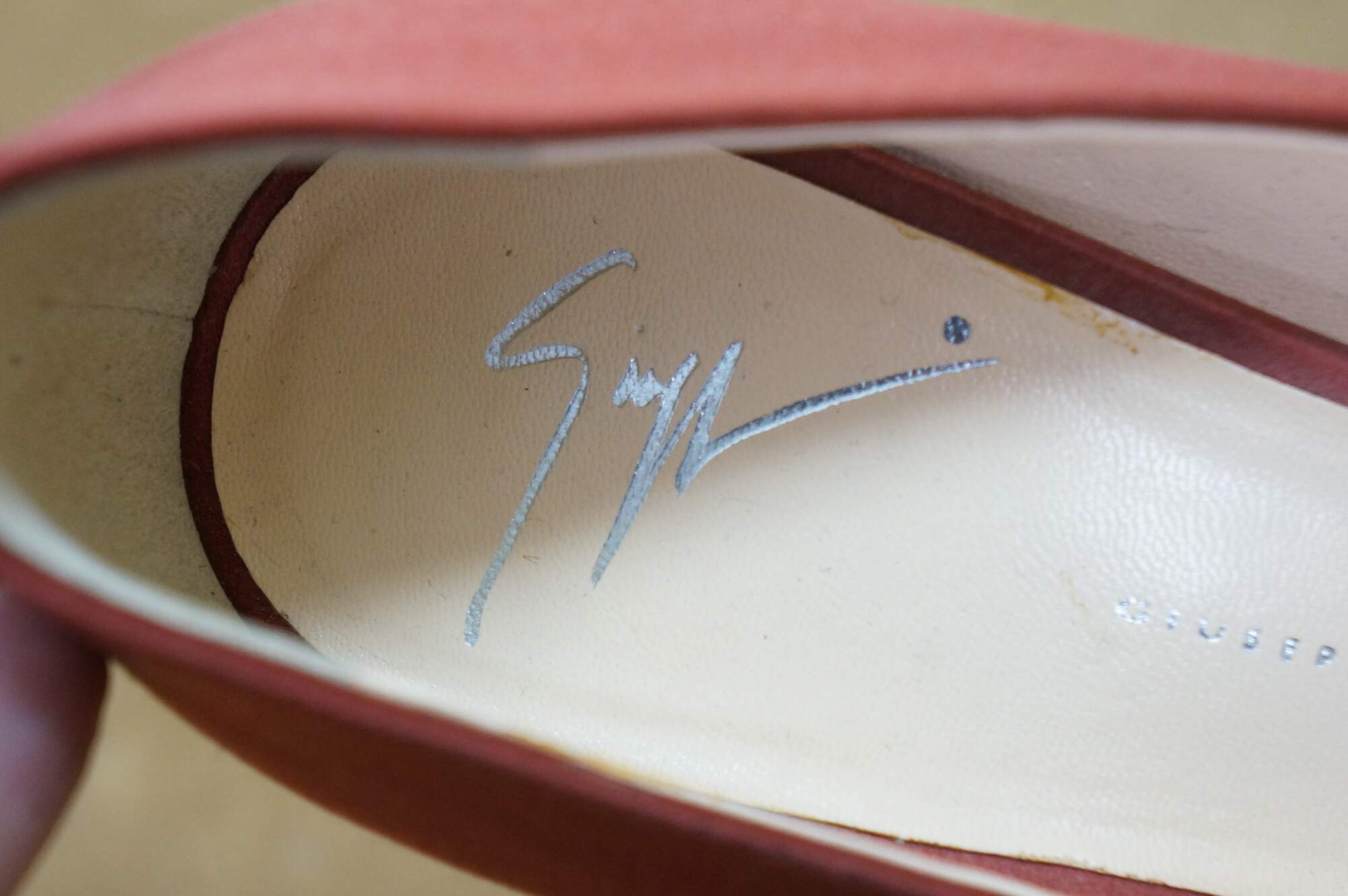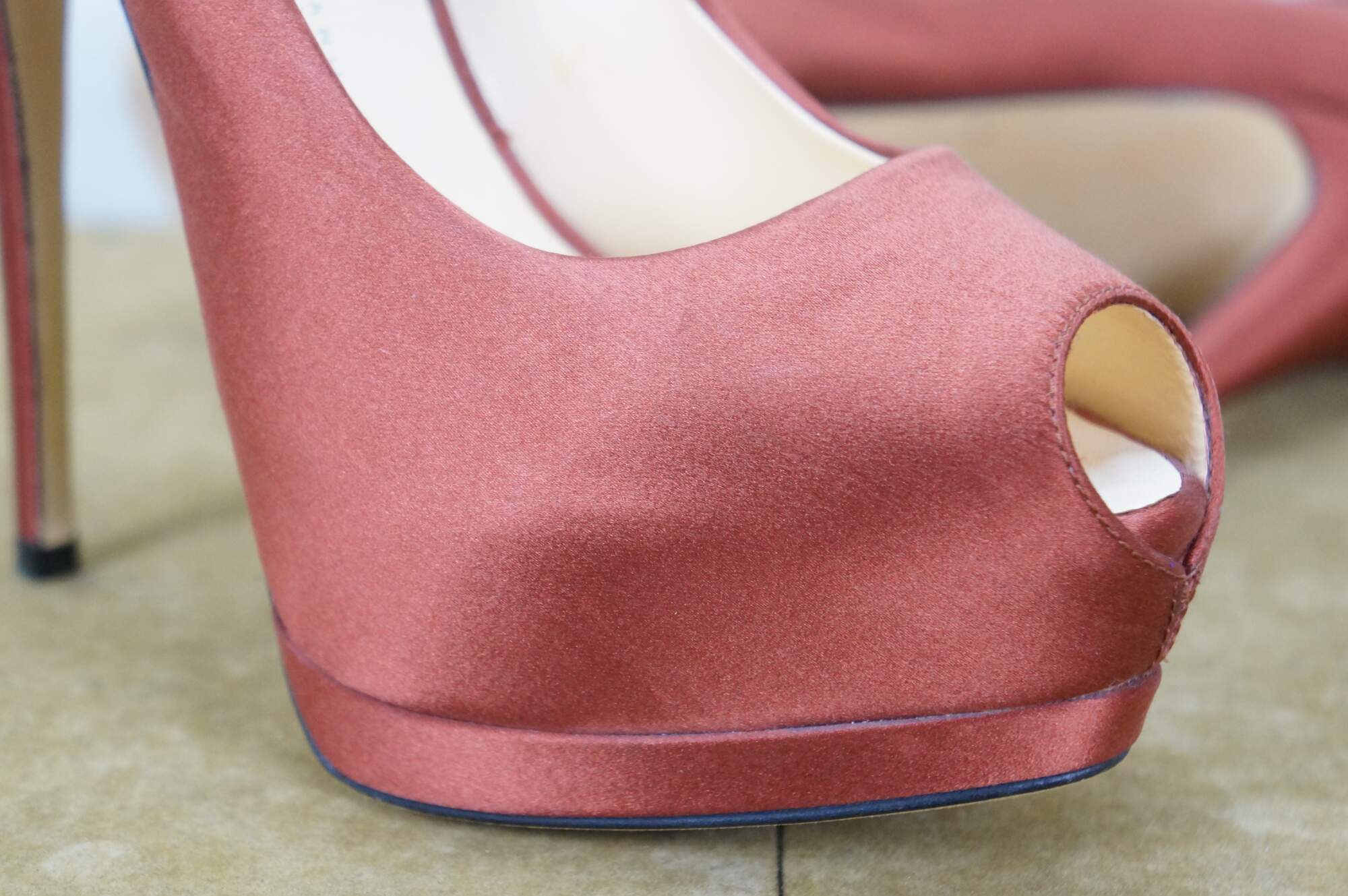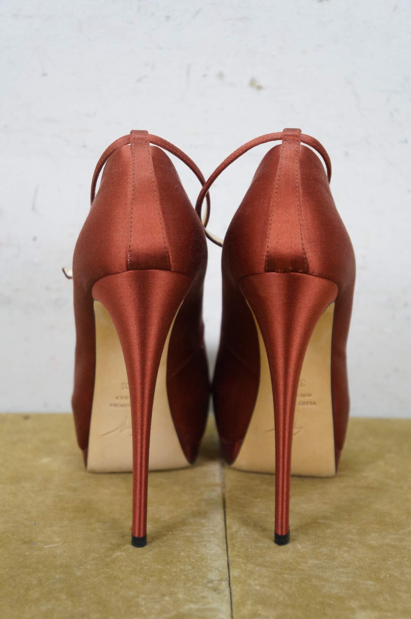Vintage Giuseppe Zanotti rust orange satin stiletto heels with platform peep toe and buckled ankle strap. Vero Cuoio (True Leather) sole. Made in Italy.