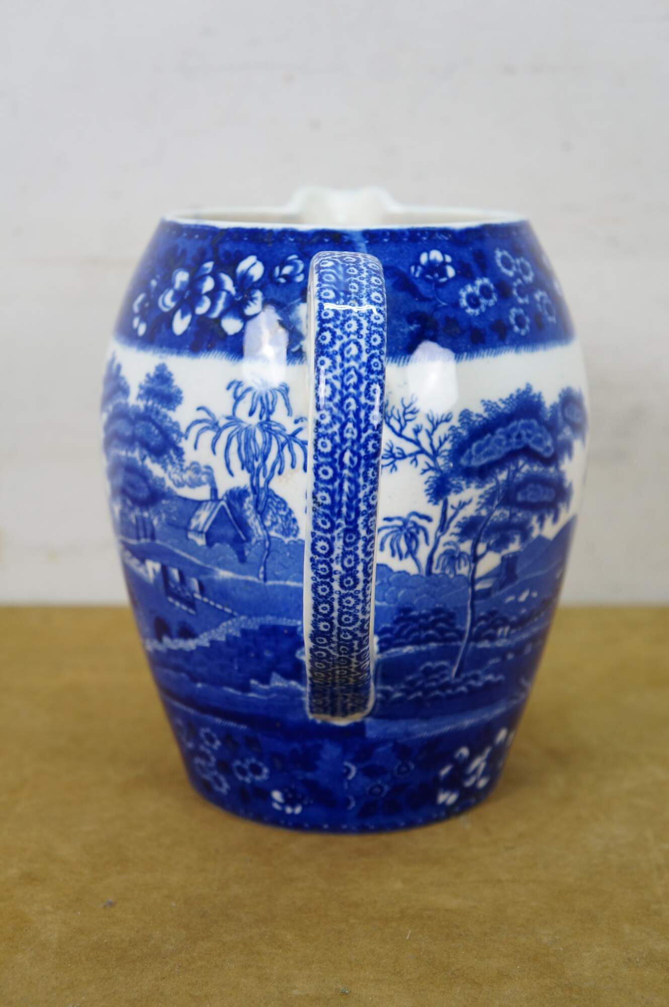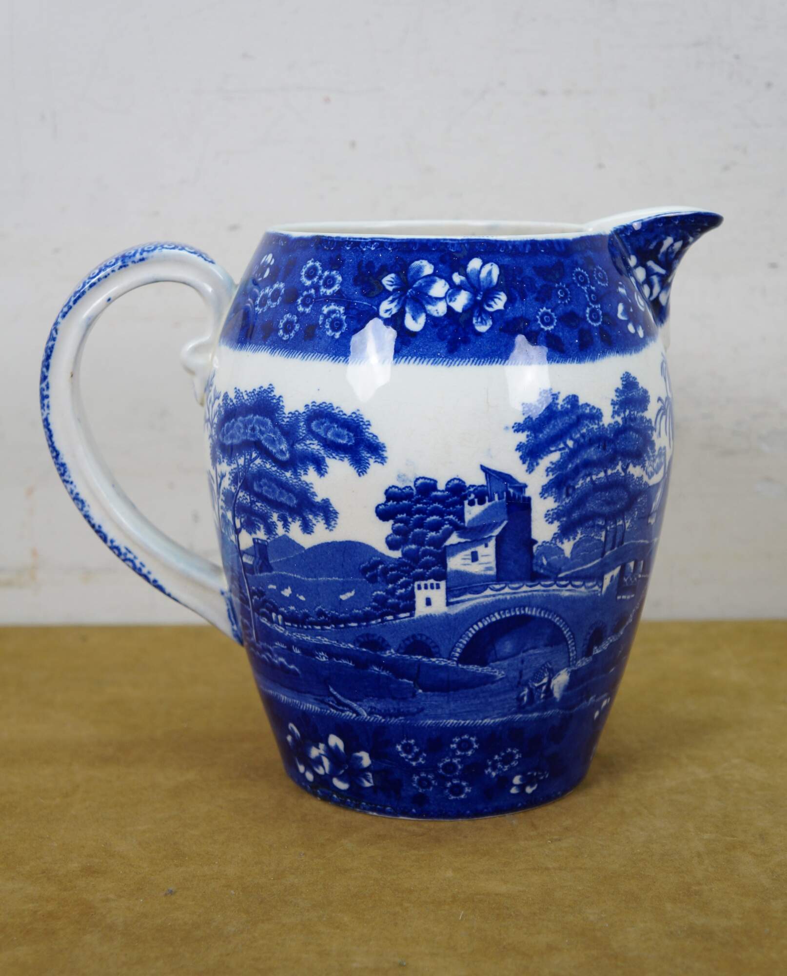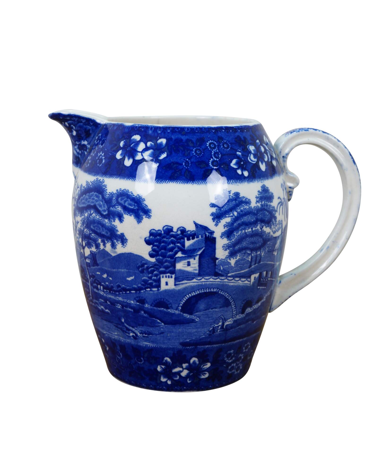 Late 19th to early 20th century Copeland Spode's Tower blue and white transferware porcelain pitcher. Round body with grooved handle, featuring a blue printed design of a European landscape with bridge and tower, framed in floral borders. Made in England.