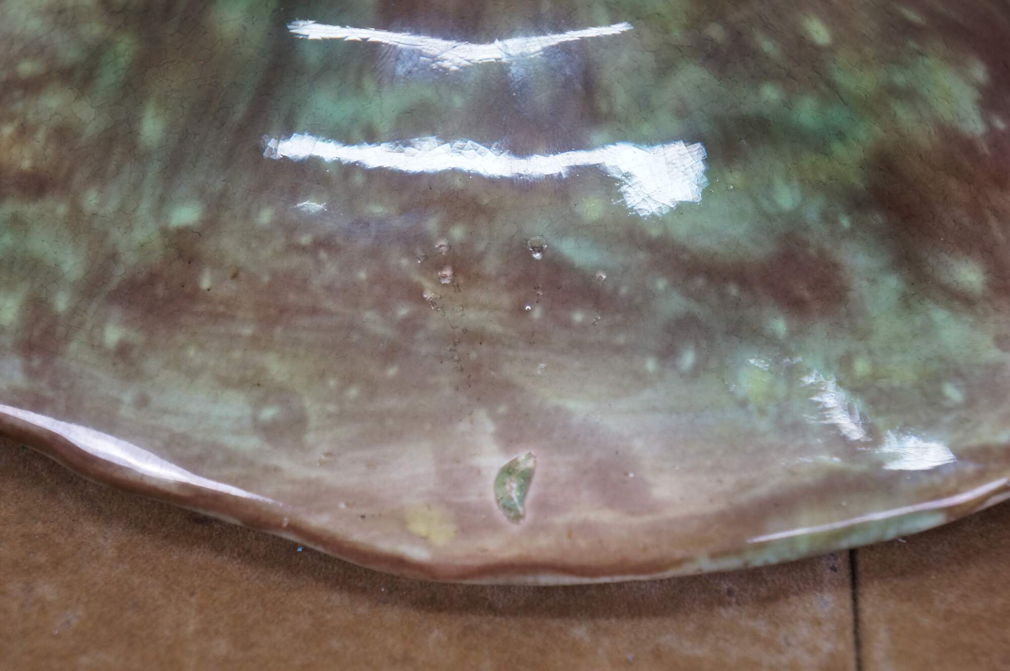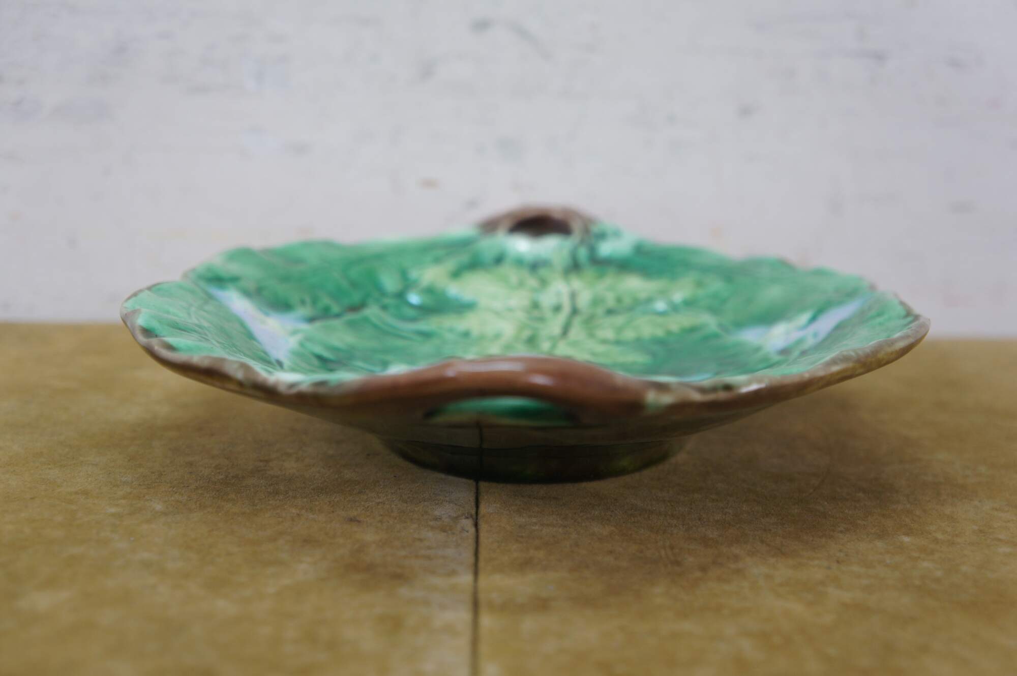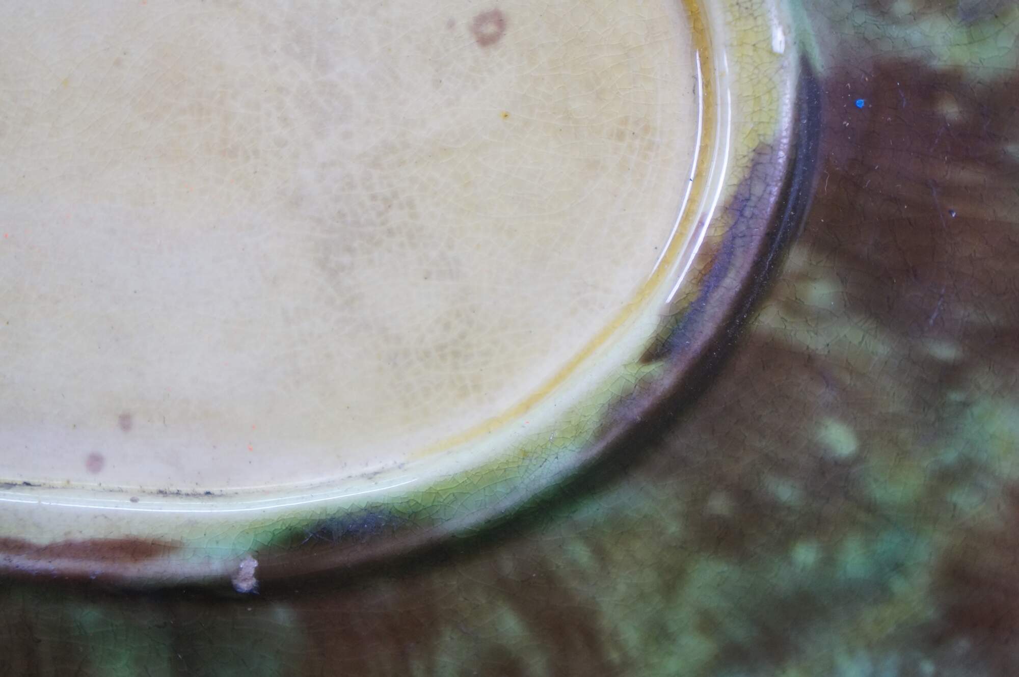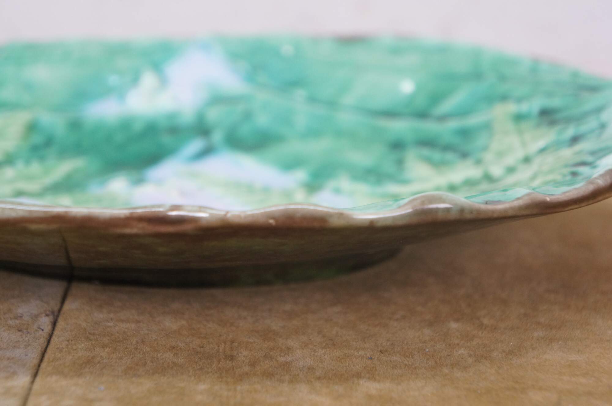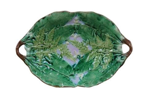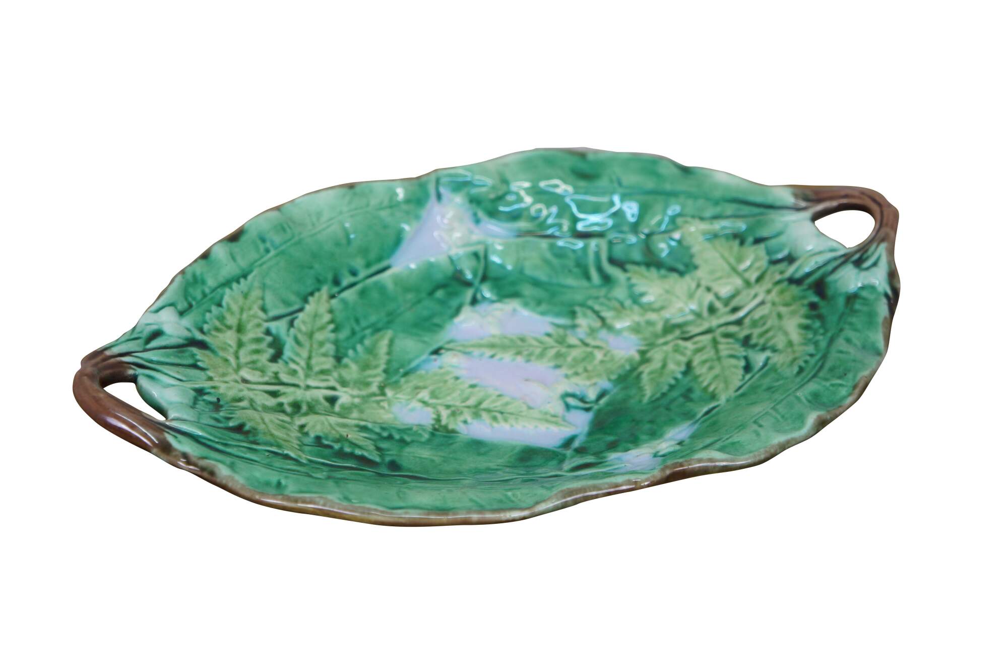 Late 19th to early 20th century majolica porcelain platter - oval in shape with a design of ferns and other leaves with small flower blossoms and branch shaped handles. Mottled green and brown back.
